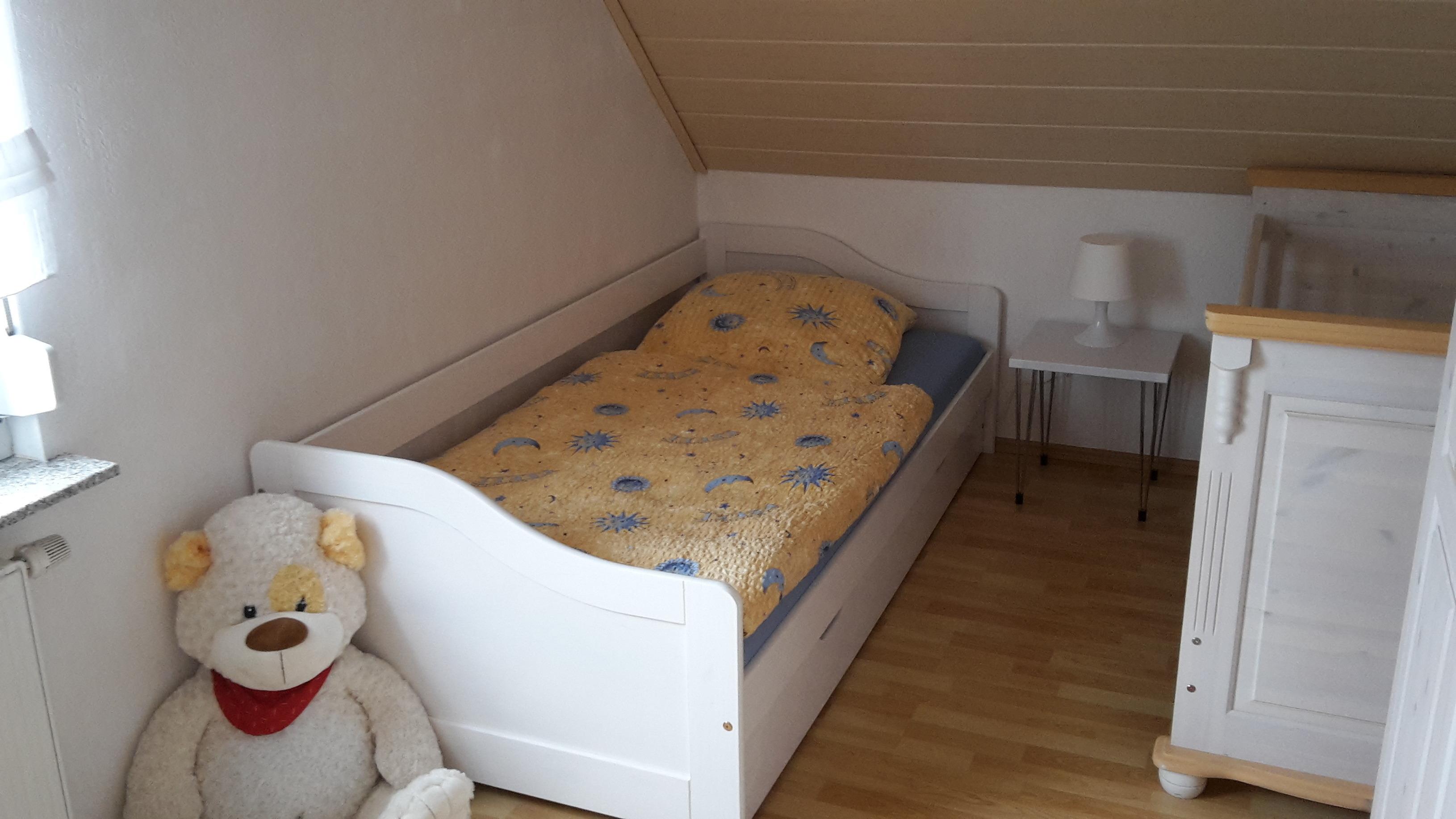 Baby-/Kinderbett und Wickelkommode vorhanden.