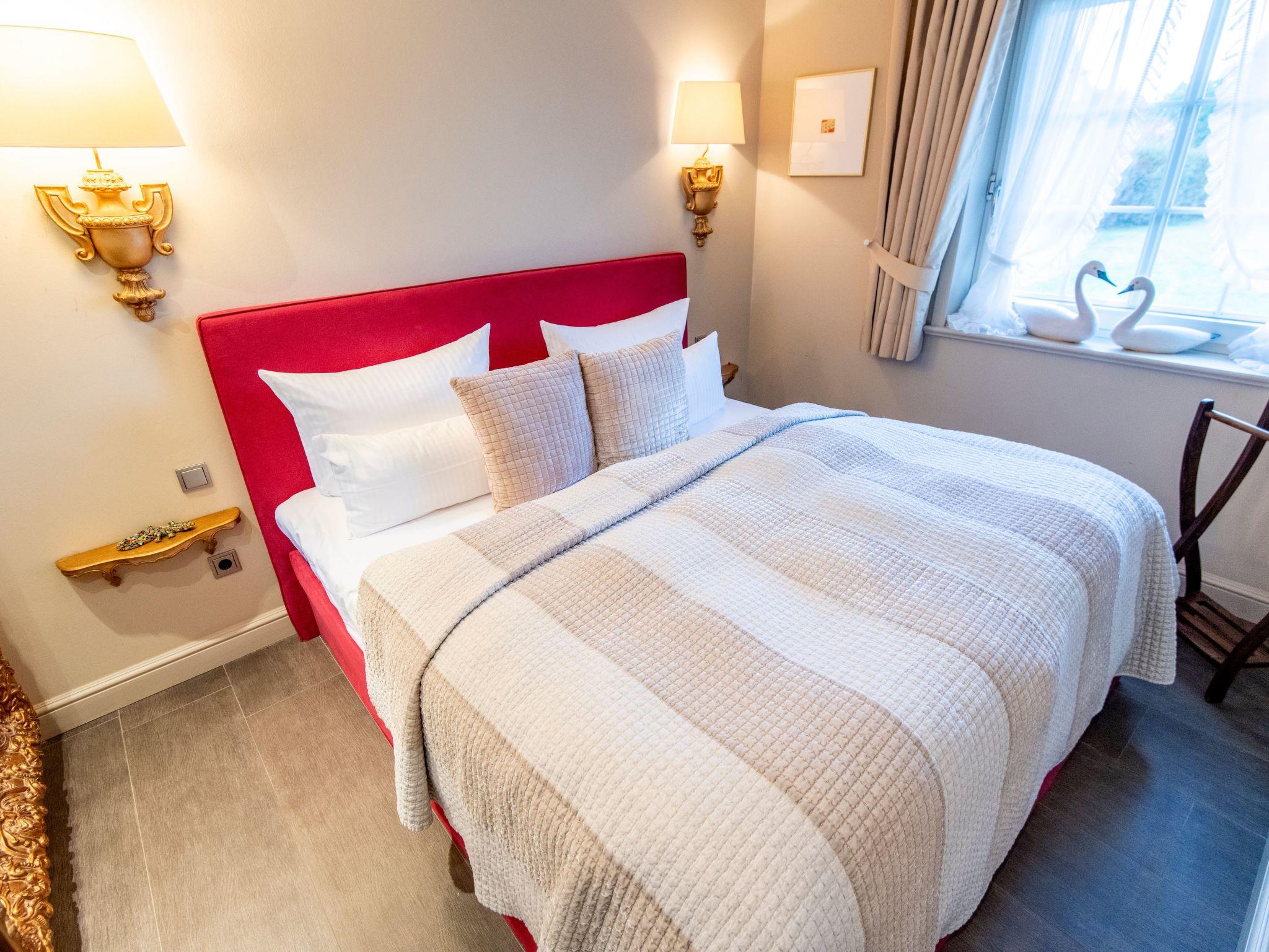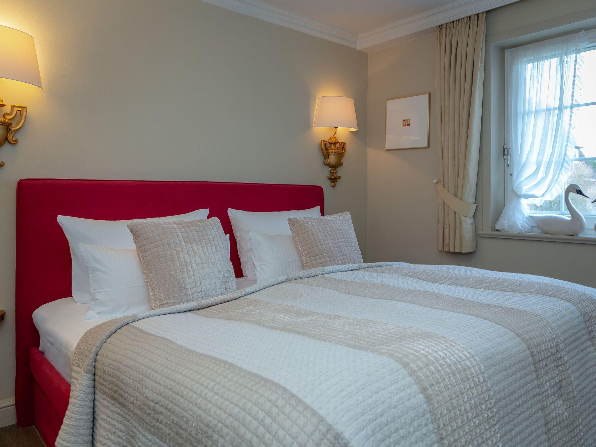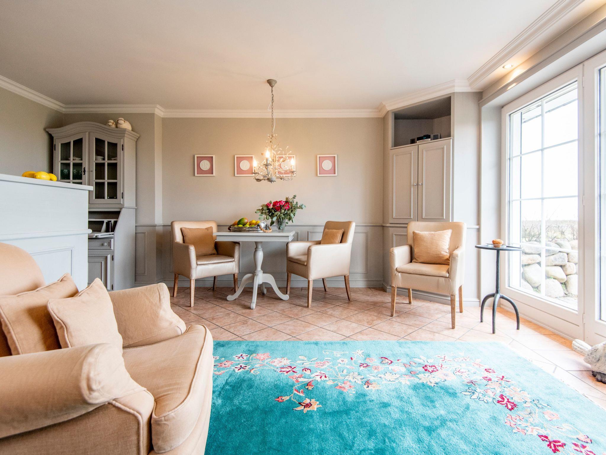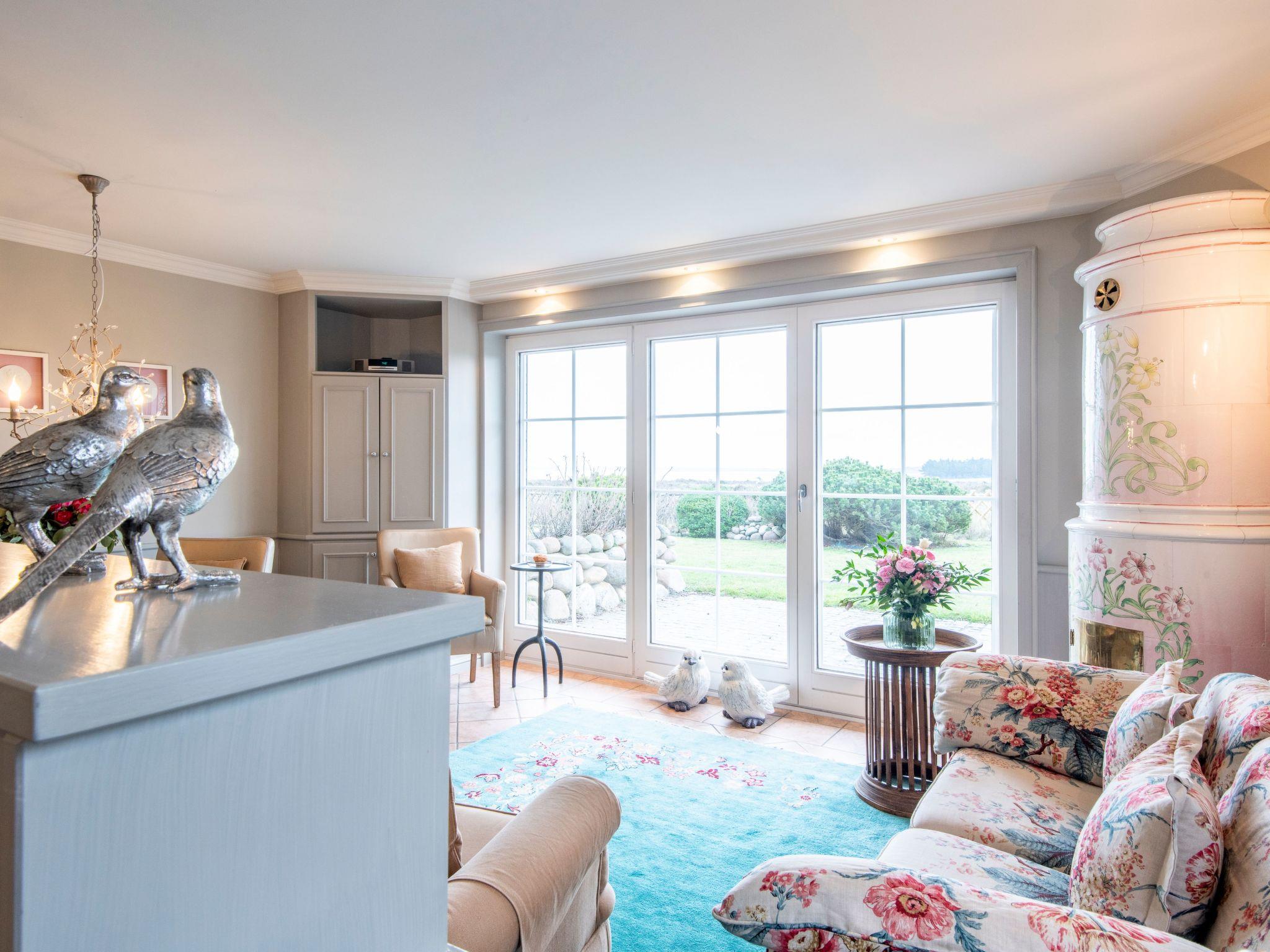 An idyllic location, an exclusive interior and a breathtaking panoramic view – our apartment “Sönshörn 8 rechts” offers all of this. The apartment with a charming interior is an ideal refuge for up to three people. It has comfortable upholstered furniture with English linen, a Jugendstil stove by Mylin, a green carpet with stylish flower motifs and a kitchen unit with pictorial wall tiles by the company Mylin. The bedrom has a TV and French beds with golden lamps made by Nevig. The marble bathroom has a washbasin by the designer Philippe Starck. There is a sofa bed for a child or a temporary guest. A Bose stereo system and Wi-Fi are provided. The large living room has an integrated pantry kitchen and a Mylin tiled fireplace stove from the 18th century.