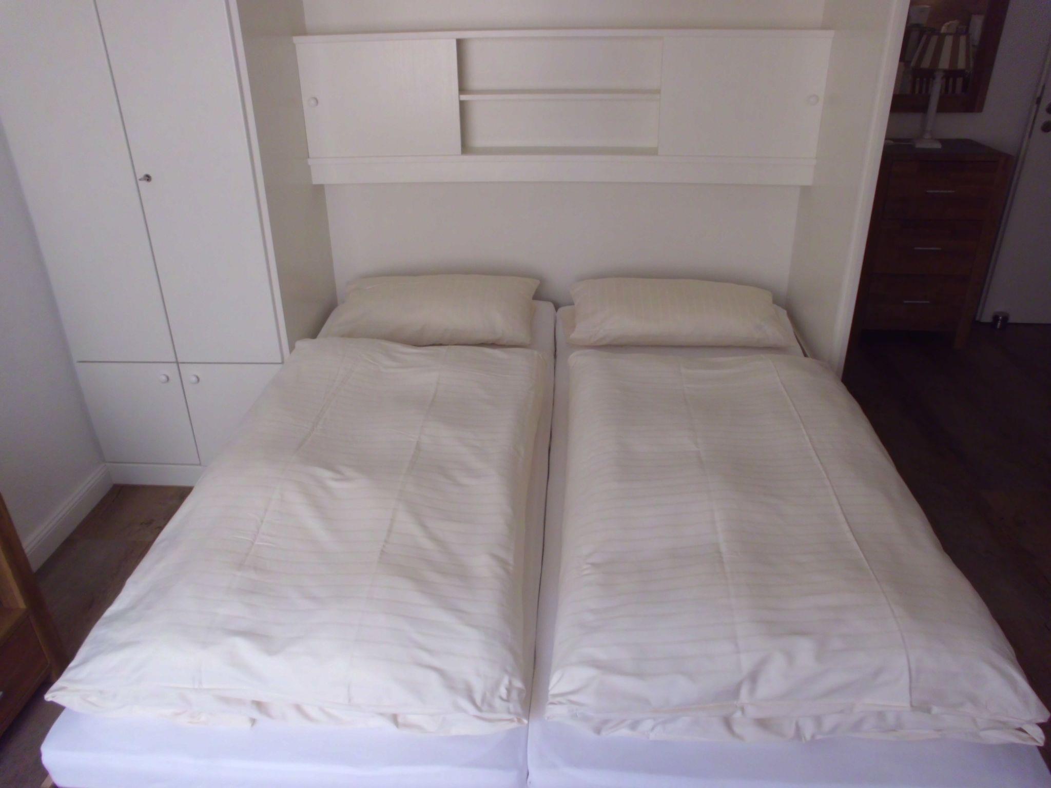 The 1-room holiday flat is for a maximum of two people, has a living space of approx. 23 m² and consists of a living room, bedroom with pantry kitchen, a hallway and a new shower room. The flat was renovated in 2014 and the furniture has been maintained and replaced since then. The kitchen is equipped with an electric cooker, a fridge with freezer compartment, a dishwasher, a kettle and a coffee machine. The living room and bedroom are comfortably furnished with a double wardrobe bed, a wardrobe, a chest of drawers, a flat-screen TV with radio function, a 2-seater couch and a dining table with two chairs. The bathroom has a shower, WC, washbasin and heated towel rail. Smoking is not permitted in the flat and pets are not allowed.
