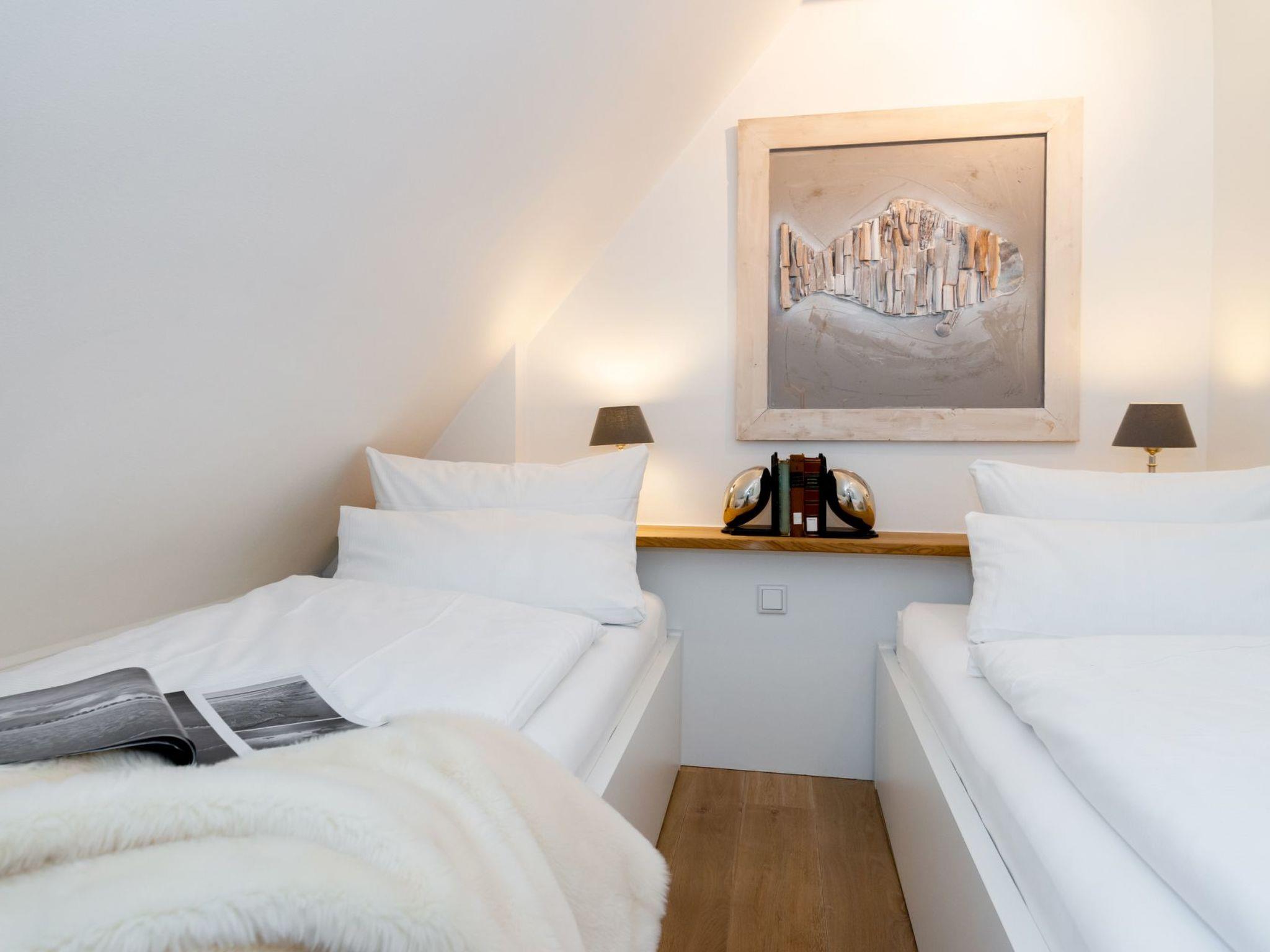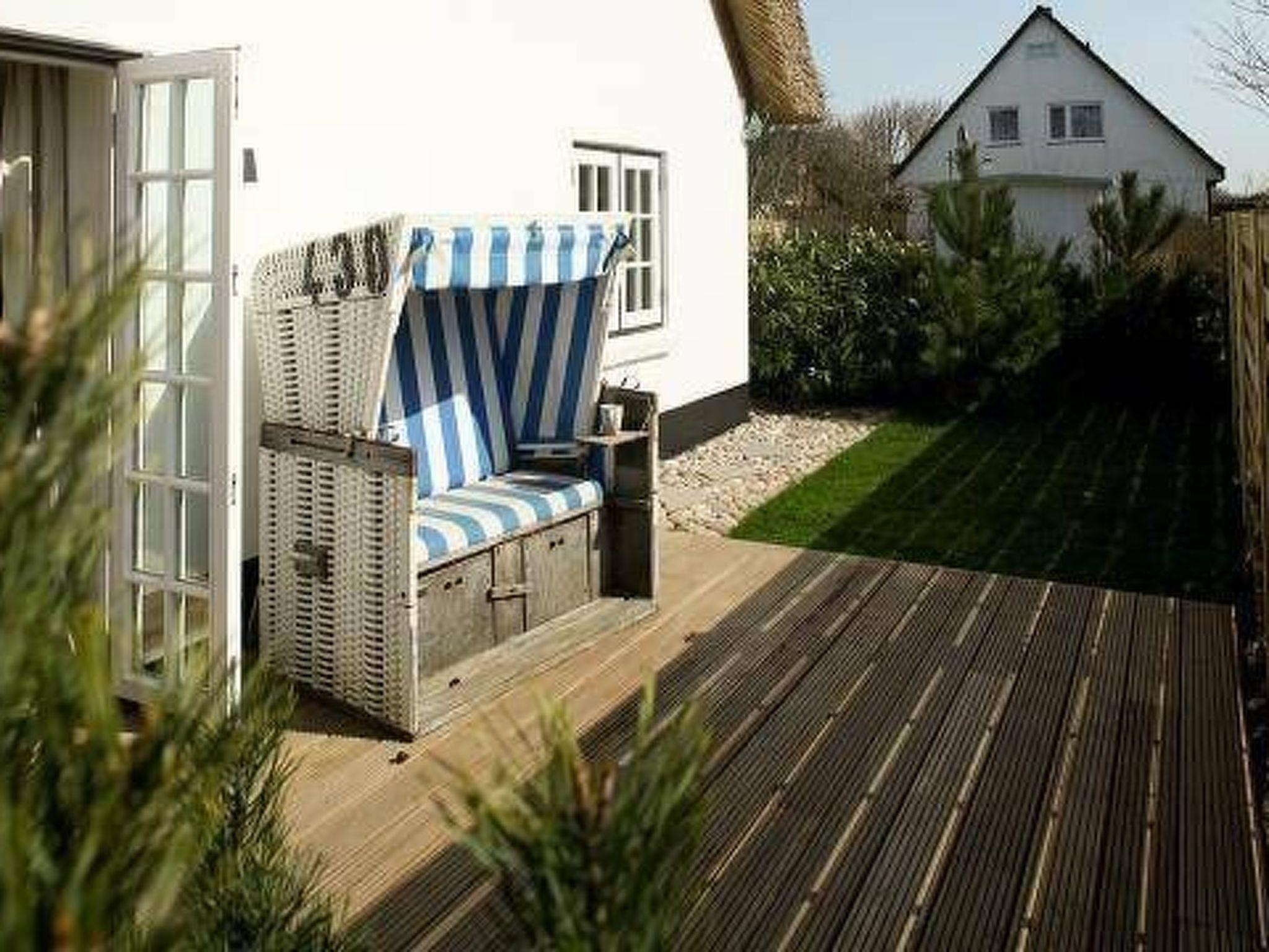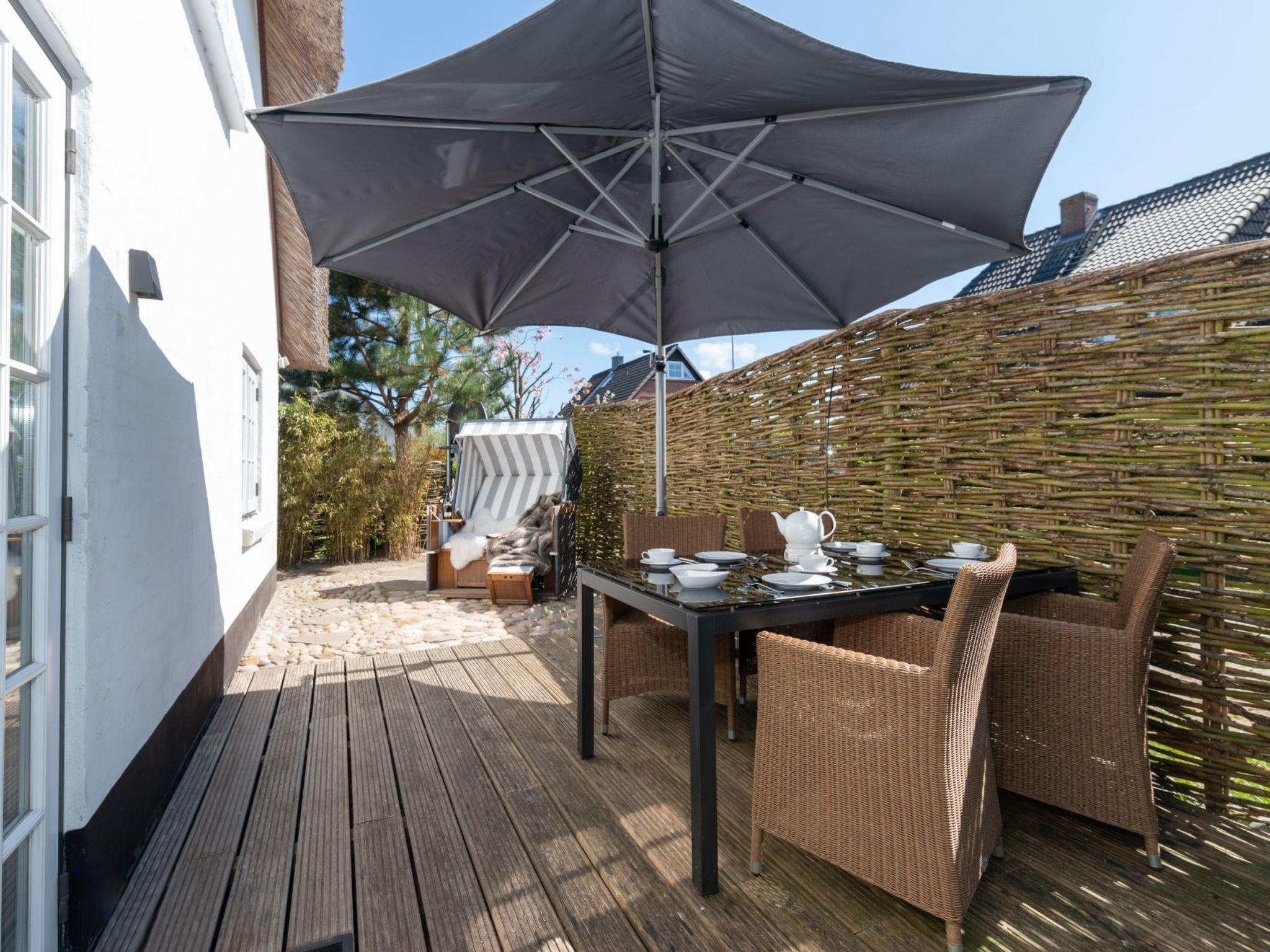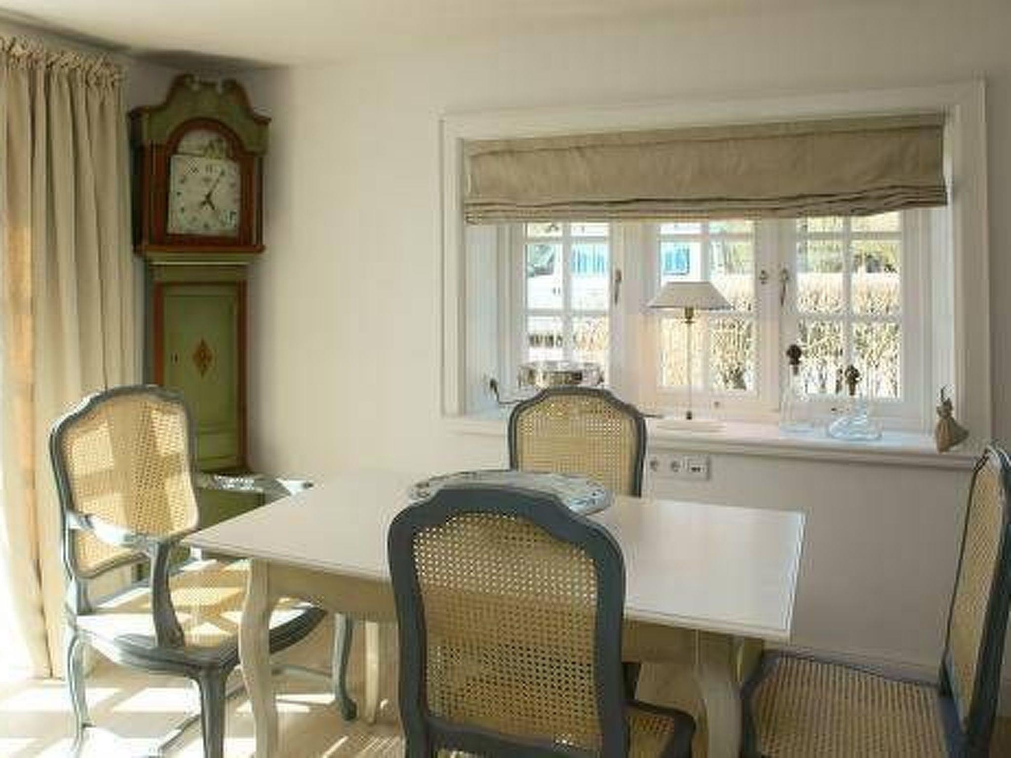 Very luxurious holiday apartment on two floors in a thatched house on a big plot of landThis holiday apartment is in a thatched house in a quiet location in the south of Tinnum on the island of Sylt.The apartment is in the south-west wing of the Treskersand country house and has around 110m² of living space spread over two floors. It provides ample space for up to five people. You enter this section of the house through an elegant Frisian door. On the left there are the fully-equipped country kitchen, a storage room with a washing machine and iron etc. On the right there is the big living and dining room with a traditional tiled fireplace stove. The bathroom has a big shower and a WC. There is an additional guest WC on the ground floor. The upper floor comprises two bedrooms, one with a big double bed, a sofa bed and an LED, the other with two single beds. There is another WC on this floor.Schlafcouch und LED Fernseher. Zwei getrennte Betten stehen im anderen Schlafzimmer bereit. Ein weiteres WC ist hier vorhanden.Outside there is a private garden with garden furniture, a canopy beach chair and loungers, accessed from the living room. There is also a private car parking space. The house is nestled quietly into a 1100m² garden.The apartment provides high-quality oak floorboards, a 100-year-old red stone wall, two LED TVs, wireless Internet access and under-floor heating. The kitchen has a Nespresso coffee machine. The apartment has been classified as 5-star luxury by the DTV. The Treskersand country house is currently one of the most beautiful restored thatched houses on the island of Sylt. It was comprehensively refurbished at the beginning of 2012.The accommodation enjoys a quiet location on the edge of Tinnum. There are shopping facilities about a kilometre away. The beach is about two kilometres away. It is a five-minute walk to the nearest bakery. The animal park in Tinnum is 750 metres away.