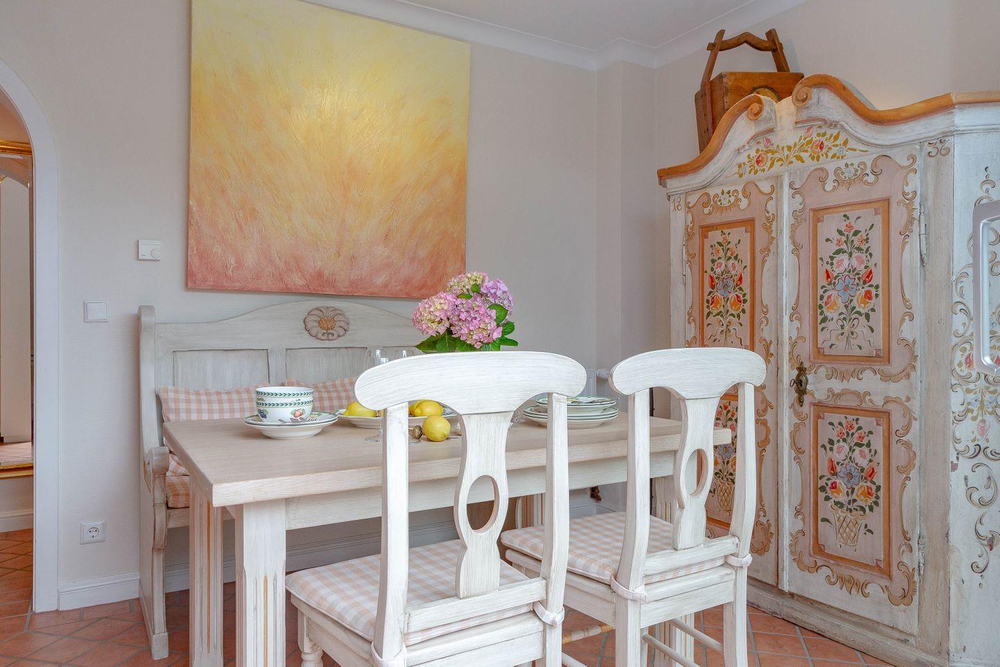Unsere Ferienwohnung im Landhausstil befindet sich im Obergeschoss des Biberhüs mitten in Archsum. Eingerichtet mit Sylter Holzvertäfelungen und alten, friesischen Wandfliesen erstreckt sich diese Wohnung über zwei Ebenen. Der Essbereich mit altem Sylter Bauernschrank, die Bibliothek und zwei Schlafzimmer mit französischen Polster- und Sylter Alkovenbetten. Ein eigener Garten mit Strandkorb und bequemen Gartenmöbeln, ein Balkon am Essbereich mit Flechtmöbeln und dem schönen Blick auf andere Friesenhäuser.