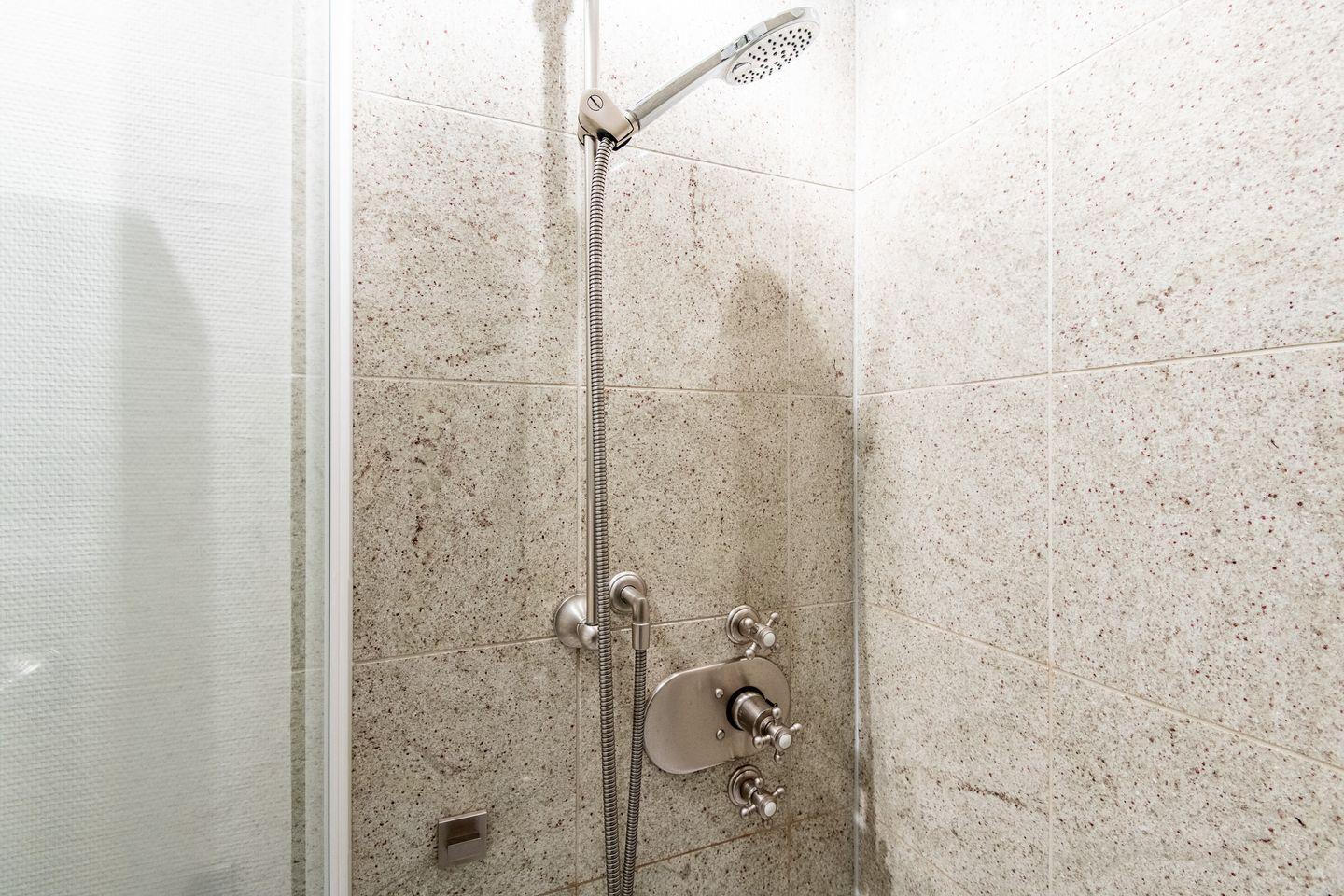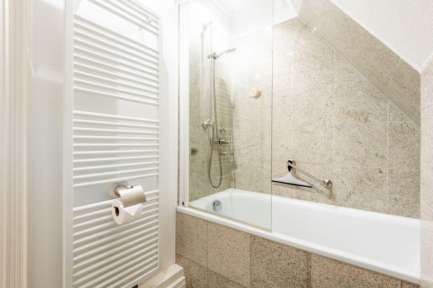 Das moderne Badezimmer bietet eine Regendusche und eine Badewanne – ideal, um den Tag frisch zu beginnen oder abends bei einem Bad zu entspannen.