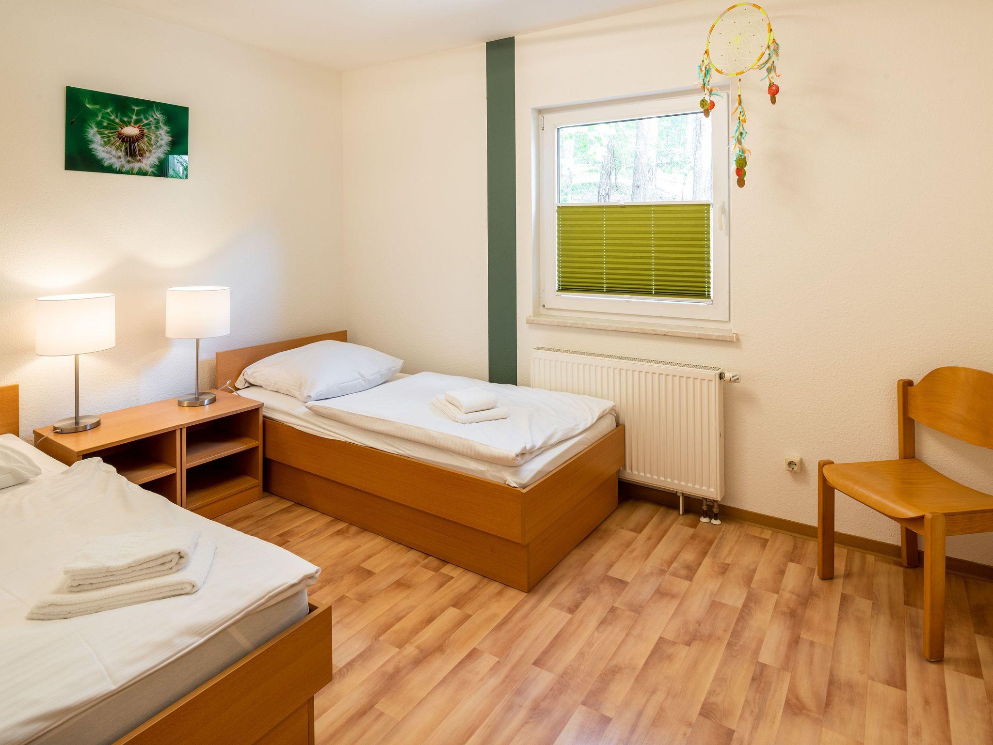 Wir bieten Ihnen drei eingeschossige, barrierefreie Ferienhäuser mit einer Größe von jeweils 69 m² und einer Bettenkapazität für jeweils vier Personen (zwei getrennte Schlafzimmer à zwei Personen - die Einzelbetten können zu einem Doppelbett zusammengeschoben werden). Jedes Ferienhaus liegt hell und ruhig eingebettet in das IDA Integrationsdorf.