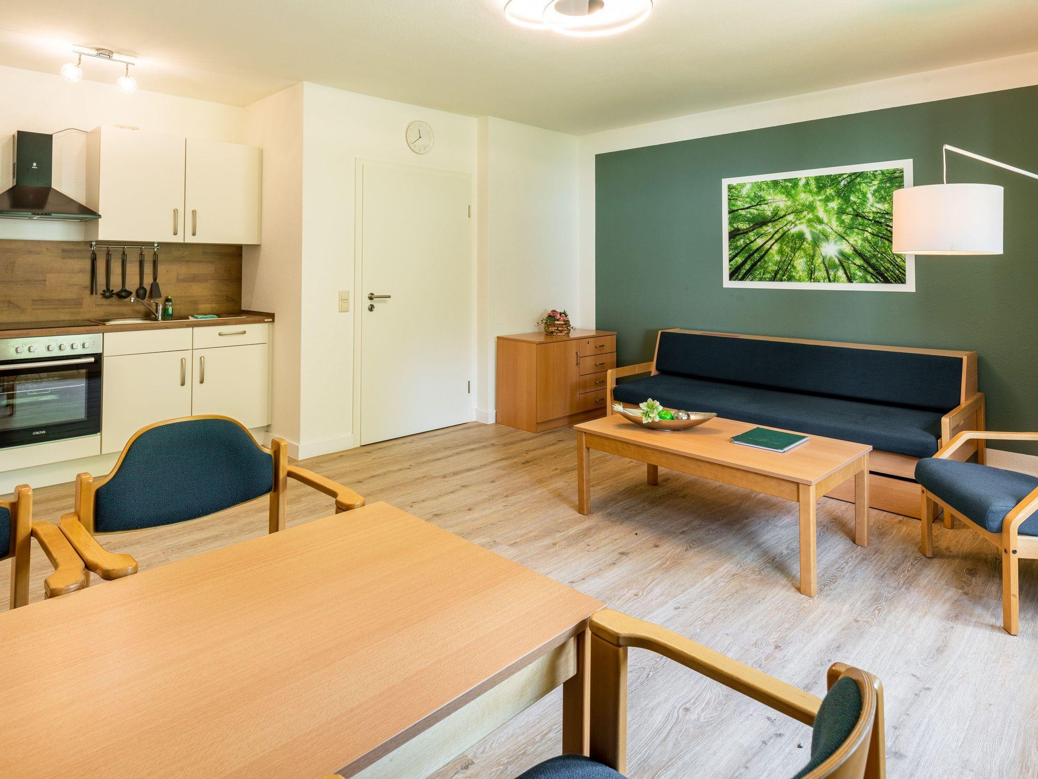 Die Ferienwohnung ist modern möbliert und voll ausgestattet mit einer Einbauküche, Badezimmer und TV. Außerdem verfügt die Ferienwohnung u. a. über schadstoffarme Bodenbeläge (Parkett/ Linoleum). Unsere Gäste können sich in der Ferienwohnung selbst verpflegen und selbst um die Raumpflege kümmern, oder sich nach Absprache von der alltäglichen Hausarbeit entlasten lassen, inklusive Teil- oder Vollverpflegung. Muss während des Aufenthalts im Ferienhaus Wäsche erledigt werden, so stehen hierfür auf dem IDA Gelände natürlich auch Waschmaschinen und Trockner zur Verfügung.