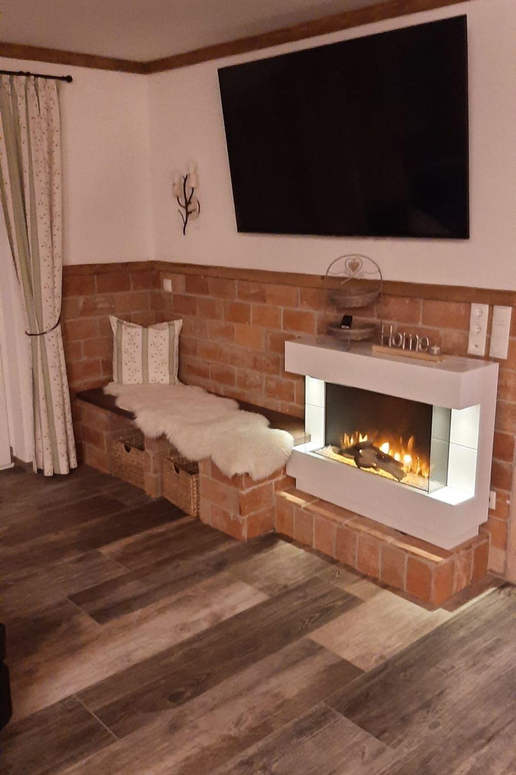 When you enter the 50 square metre holiday flat, you are immediately greeted by an open, inviting living room that leaves nothing to be desired. The rustic, fully equipped kitchenette with cookware and crockery, a rustic dining table with four chairs and a cosy pull-out sofa with ottoman invite you to linger. A 50-inch Smart TV provides entertainment, while a rustic electric fireplace creates a cosy cabin atmosphere. Next door is the wood-panelled bedroom with a motor-adjustable box-spring bed and direct access to the bright bathroom, which is equipped with a walk-in rain shower, washbasin, WC, toiletries for the first day and a hairdryer.