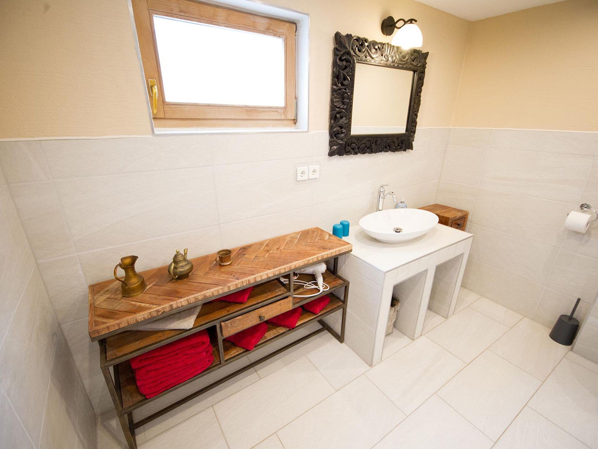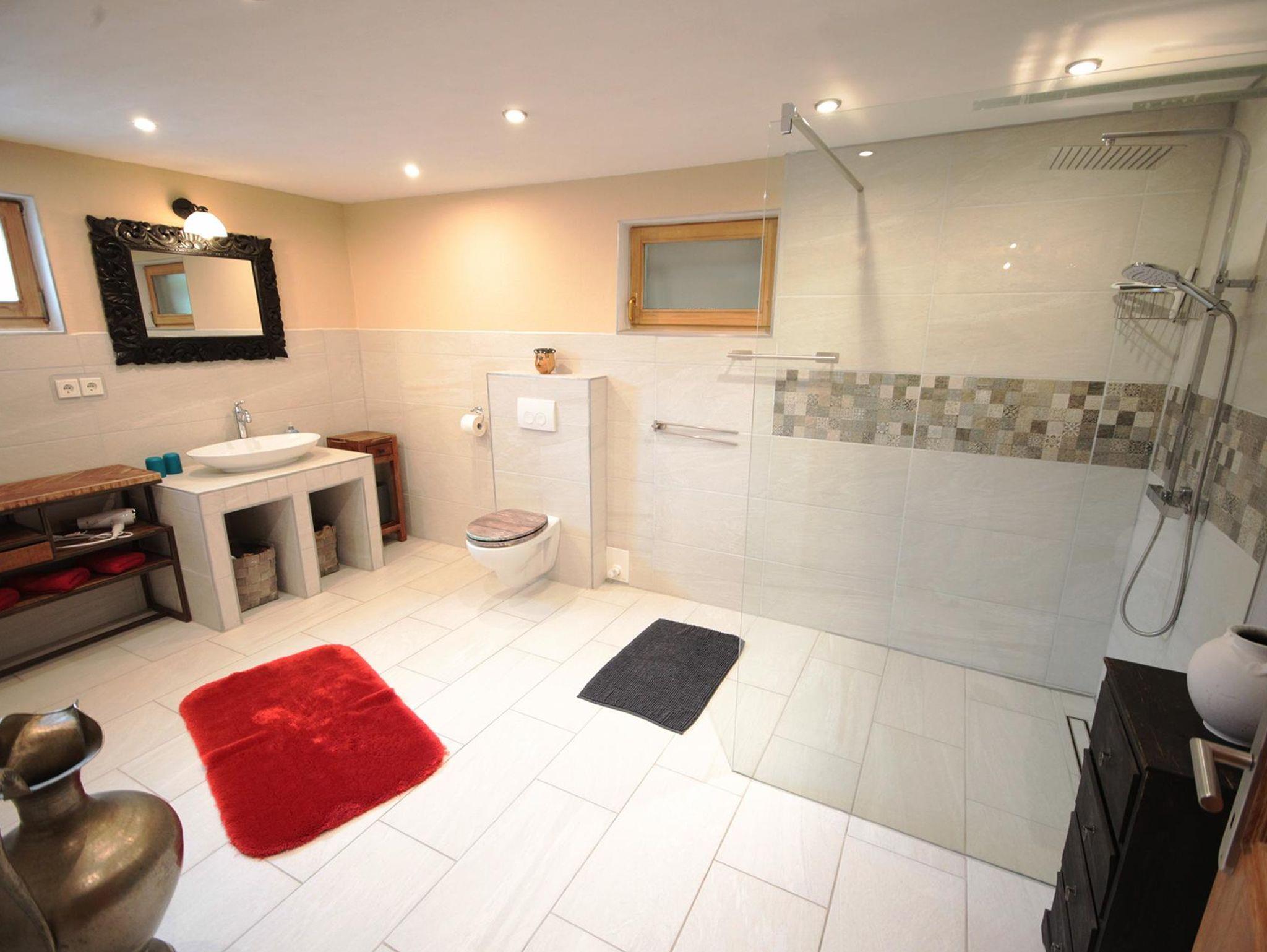 Das moderne Badezimmer verfügt über eine begehbare Dusche und Fußbodenheizung für maximalen Komfort.