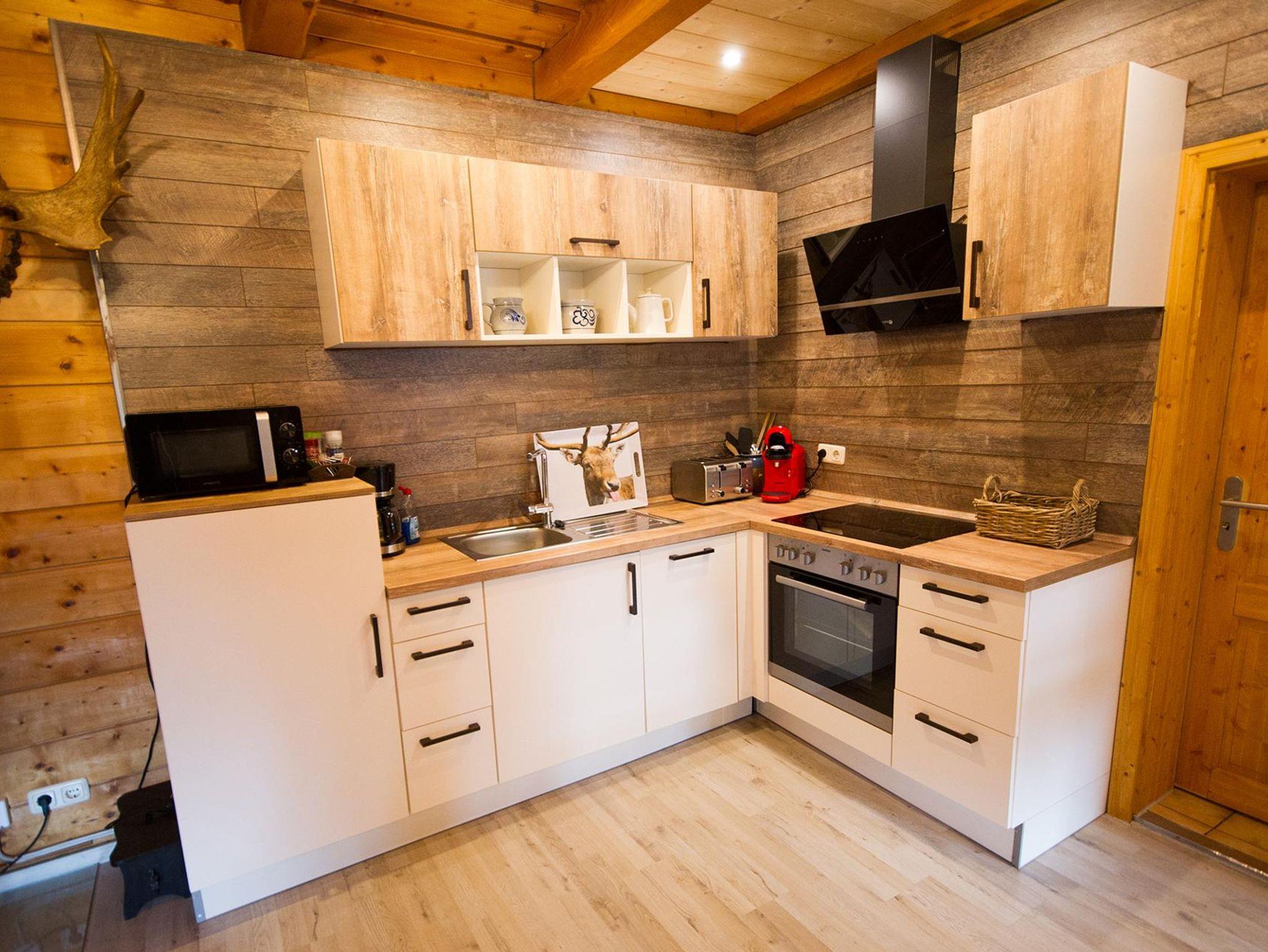 Die offene Wohnküche im Hüttenstil mit Pelletsofen und Zentralheizung bietet eine behagliche Atmosphäre – perfekt für gemütliche Stunden, auch an kühlen Tagen. Der Wohnbereich ist mit einem Samsung HD-Flat-TV und Glasfaser-WLAN ausgestattet.