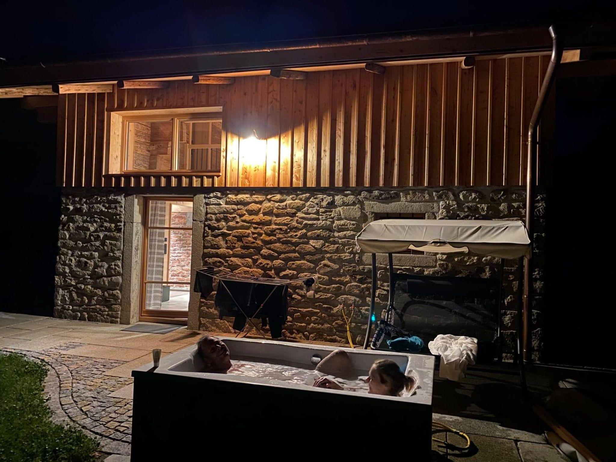 Eine Terrasse mit herrlichem Blick in die Natur, Holztischgruppe, Außenbadewanne und Liegeschaukel für zwei und ein gemauerter Grill lädt Sie zum enspannen und wohlfühlen ein.