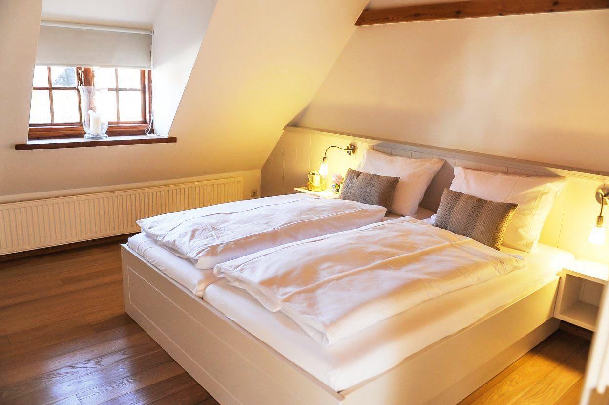 Die Ferienwohnung Skyerne im ersten Obergeschoss bietet auf ca. 80 qm ausreichend Platz für bis zu 4 Personen und garantiert einen unvergesslichen Urlaub. Die hochwertige Ausstattung sorgt für jeglichen Komfort, während große Velux-Fenster den Raum mit Licht durchfluten und einen schönen Blick in den Innenhof bieten.