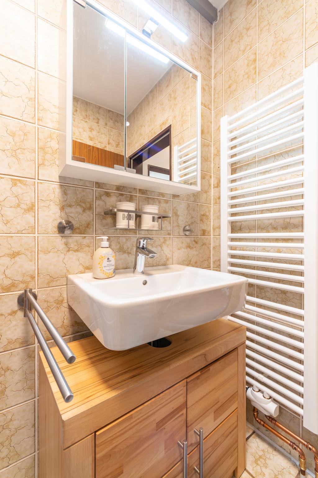 2-room apartment 38 m2, on the ground floor. Partly renovated in 2021, beautiful and cosy furnishings: living/dining room 18 m2 with dining table and satellite TV (flat screen). 1 room with 1 double bed. Kitchenette (4 hot plates, oven, dishwasher, toaster, kettle, microwave, electric coffee machine). Shower/WC. Gas heating. Terrace 10 m2 partly roofed. Terrace furniture. Beautiful view of the mountains. Facilities: Internet (WiFi, free). Please note: non-smokers only. Maximum 1 pet/ dog allowed. Smoke alarm. Lake 100 m. Bookings accepted for holiday purposes only.