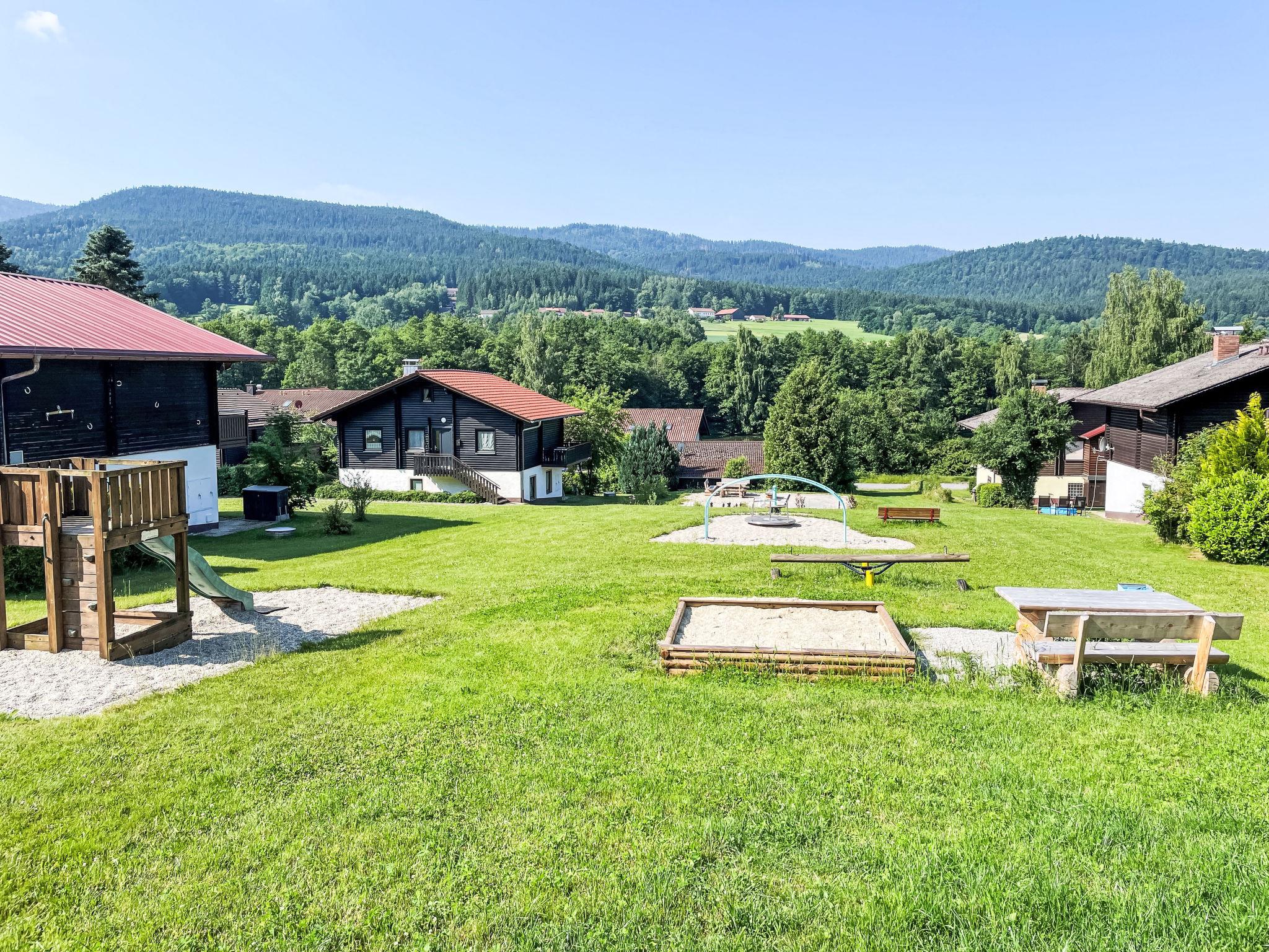 Child friendly holiday village "Am Hohen Bogen", 5 m a.s.l.. In the district of Kummersdorf, outside the resort, 3 km from the centre of Arrach, on a slope, traffic calmed area, 300 m from the edge of the forest, 100 m from the lake, 9 km from the skiing area. For shared use: volleyball, children's playground (slide, swing, sandbox). In the complex: table tennis (extra). Central heating system. Parking at the house. Shop 3 km, grocery 3 km, supermarket 3 km, restaurant 3 km, bakery 3 km, bus stop "Großmühle Abzw. Hohenwarth" 650 m, railway station "Hohenwarth" 1.5 km, grass beach "Seepark Arrach" 5 km, outdoor swimming pool 10 km, thermal baths 10 km, bathing lake "Seepark Arrach" 5 km. Golf course (9 hole) 6 km, tennis 6 km, riding stable 800 m, chair lift 9 km, skisport facilities 9 km, slopes 9 km, ski rental 11 km, ski school 9 km, cross country ski track 11 km. Nearby attractions: Bayerwald-Tierpark Lohberg 15 km, Spielbank Bad Kötzting, Fun-Park Neukirchen, Tiergarten Straubing, Pullman-City. Well-known ski regions can easily be reached: Eck 6 km, Am Hohen Bogen 9 km, Arber 29 km. Hiking paths: Arberregion. Please note: car recommended. Groups of teenagers on request only. Boating, fishing 500 m. The holiday village consists of an apartment house and two-storey holiday houses with shared lawns and play areas. The distance from the individual houses to the natural swimming lake is 50 – 400 m.