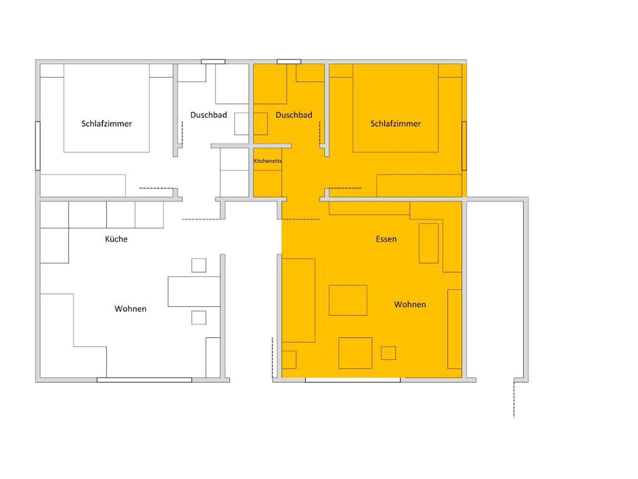 gemütliche Sitzecke. Es gibt ein Badezimmer mit Dusche und WC. Das