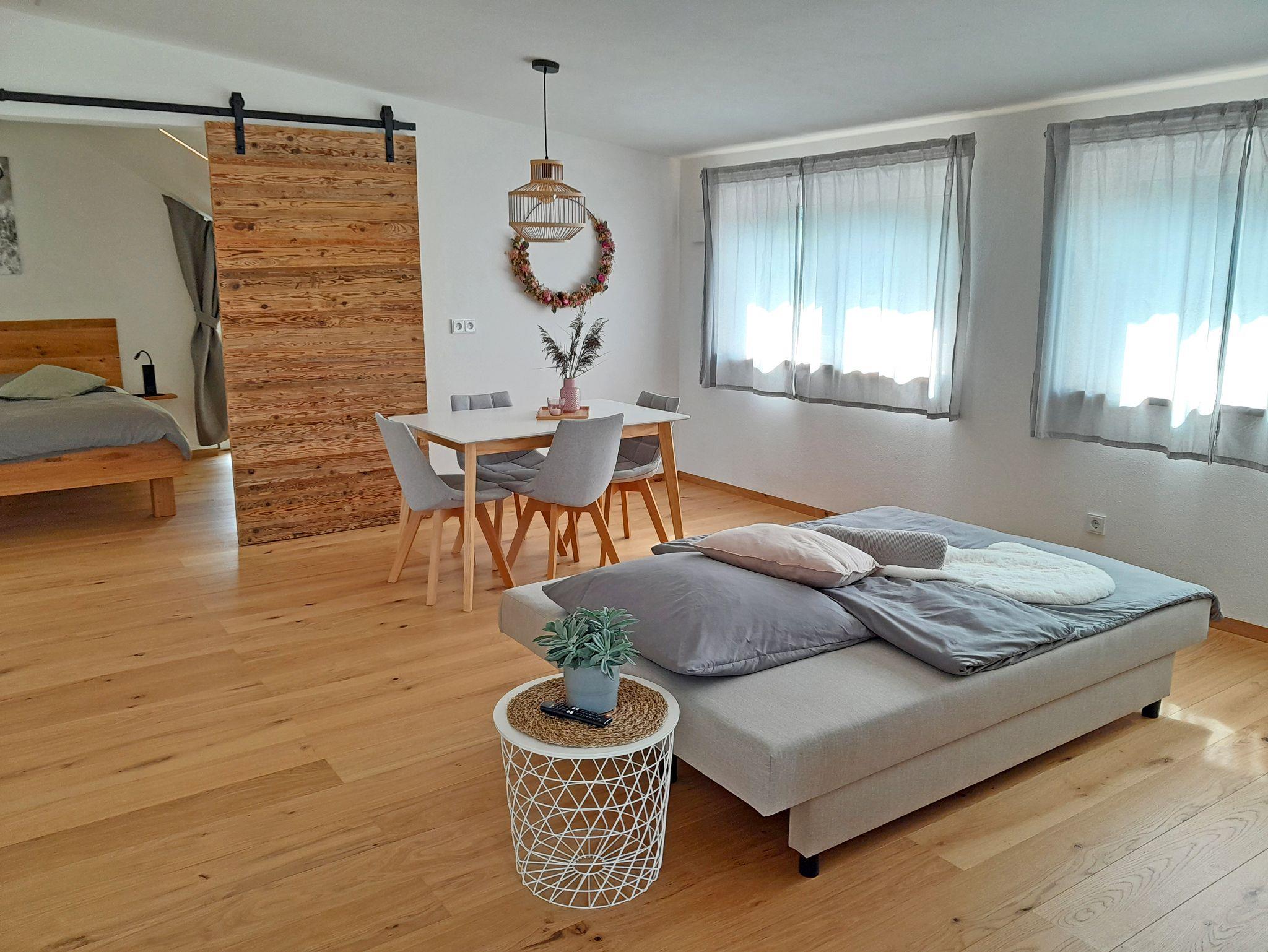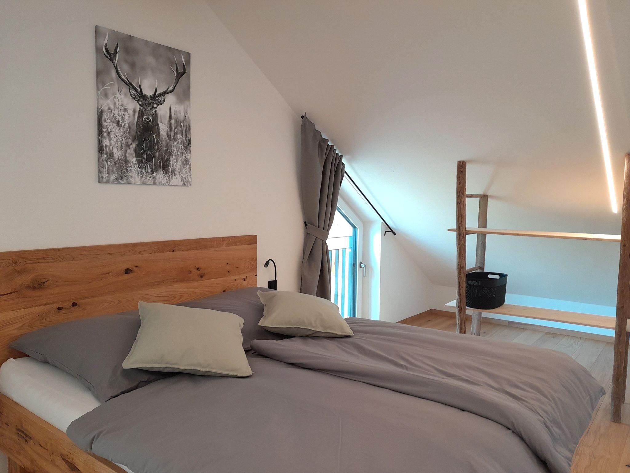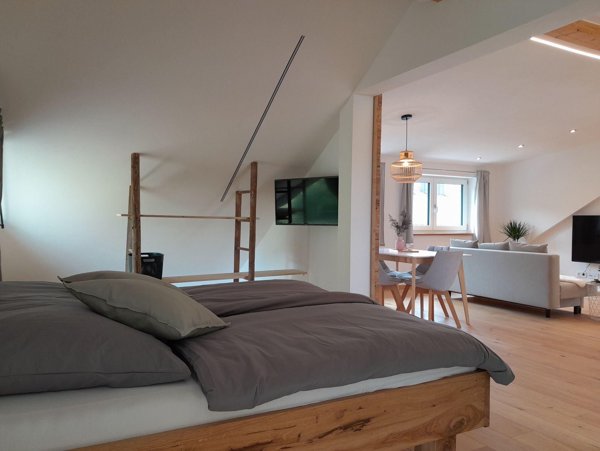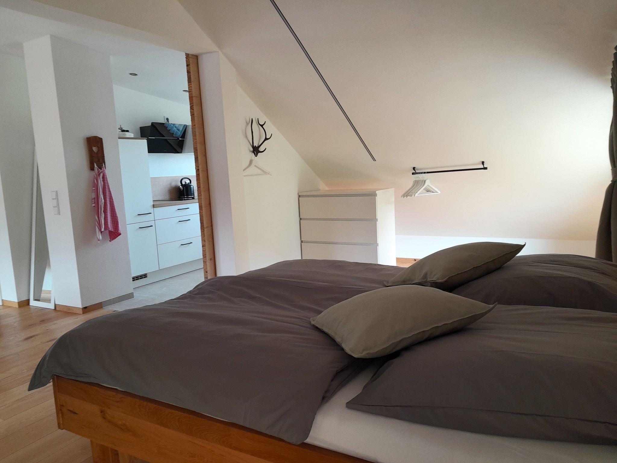 Die 2022 neu erbaute helle Nichtraucher Ferienwohnung Bergblick Loft 60 qm, lädt mit einem großzügigen Wohnraum und durch eine große Holz-Schiebetür abgetrennten Schlafzimmer, zum Entspannen ein. Auf dem West-Balkon genießen Sie die Abendsonne und den Blick auf die Berge. Separates Schlafzimmer mit Doppelbett 160 x 200 cm und offenem Regalschrank. Stilvoll eingerichteter Wohnraum mit Schlafcouch 130 x 190 cm, Flat-SAT-TV, kostenloses WLAN, Esstisch mit Stühlen und offener Küche. Die Küchenzeile ist mit Geschirrspüler, Kühlschrank/Tiefkühlfach, 2-Platten-Cerankochfeld, Mikrowelle, Senseo-Kaffeepadmaschine, Wasserkocher und Toaster ausgestattet. Badezimmer mit Dusche/WC und Fön. Gerne darf auf dem Balkon geraucht werden. Haustiere und Hunde dürfen nicht mitgebracht werden.