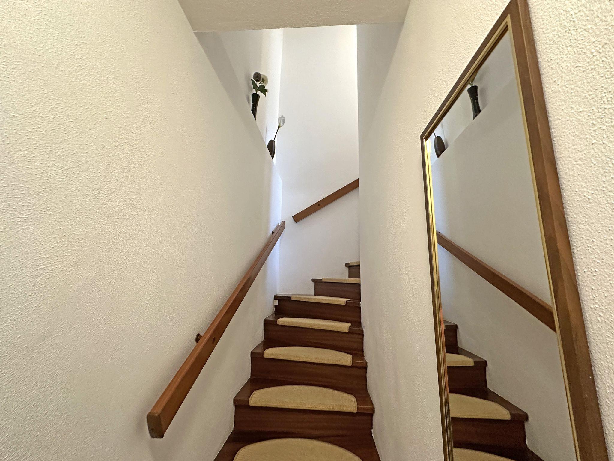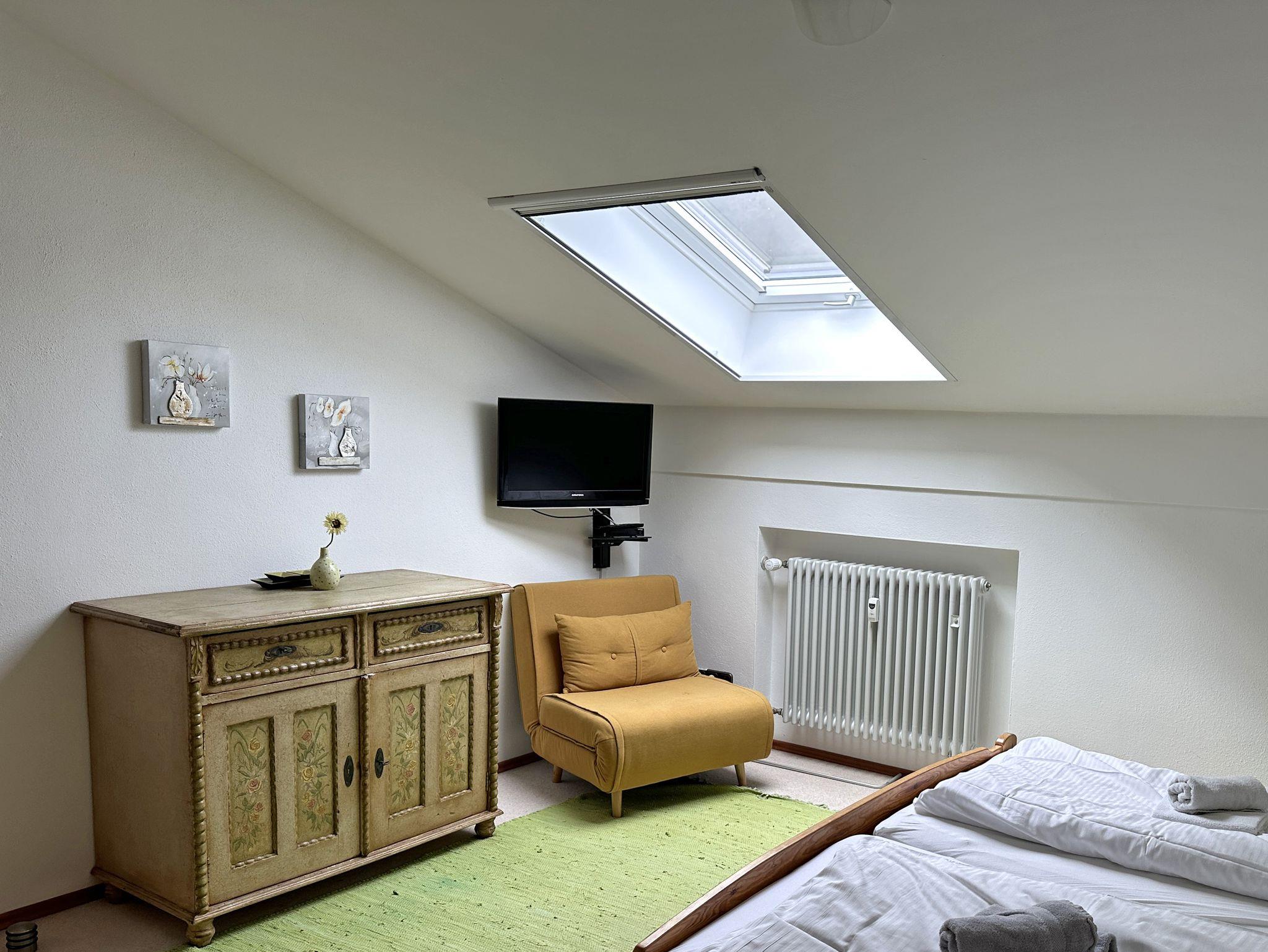 Über eine Treppe gelangen Sie in den Schlafbereich mit komfortablem Doppelbett, zusätzlichem Schlafsessel, großem Kleiderschrank, Ganzkörperspiegel und eigenem Flat-SAT-TV. Auch hier steht Ihnen ein weiteres Badezimmer mit Dusche/WC zur Verfügung. Für Familien ist ein Kinder-Reisebett vorhanden.
