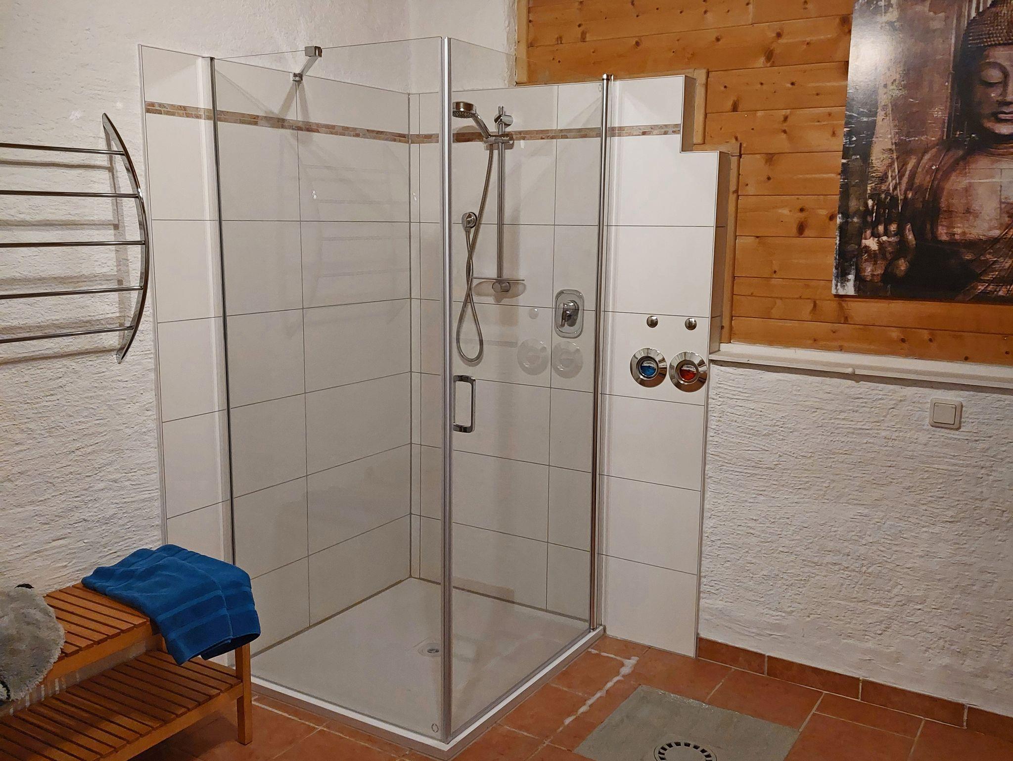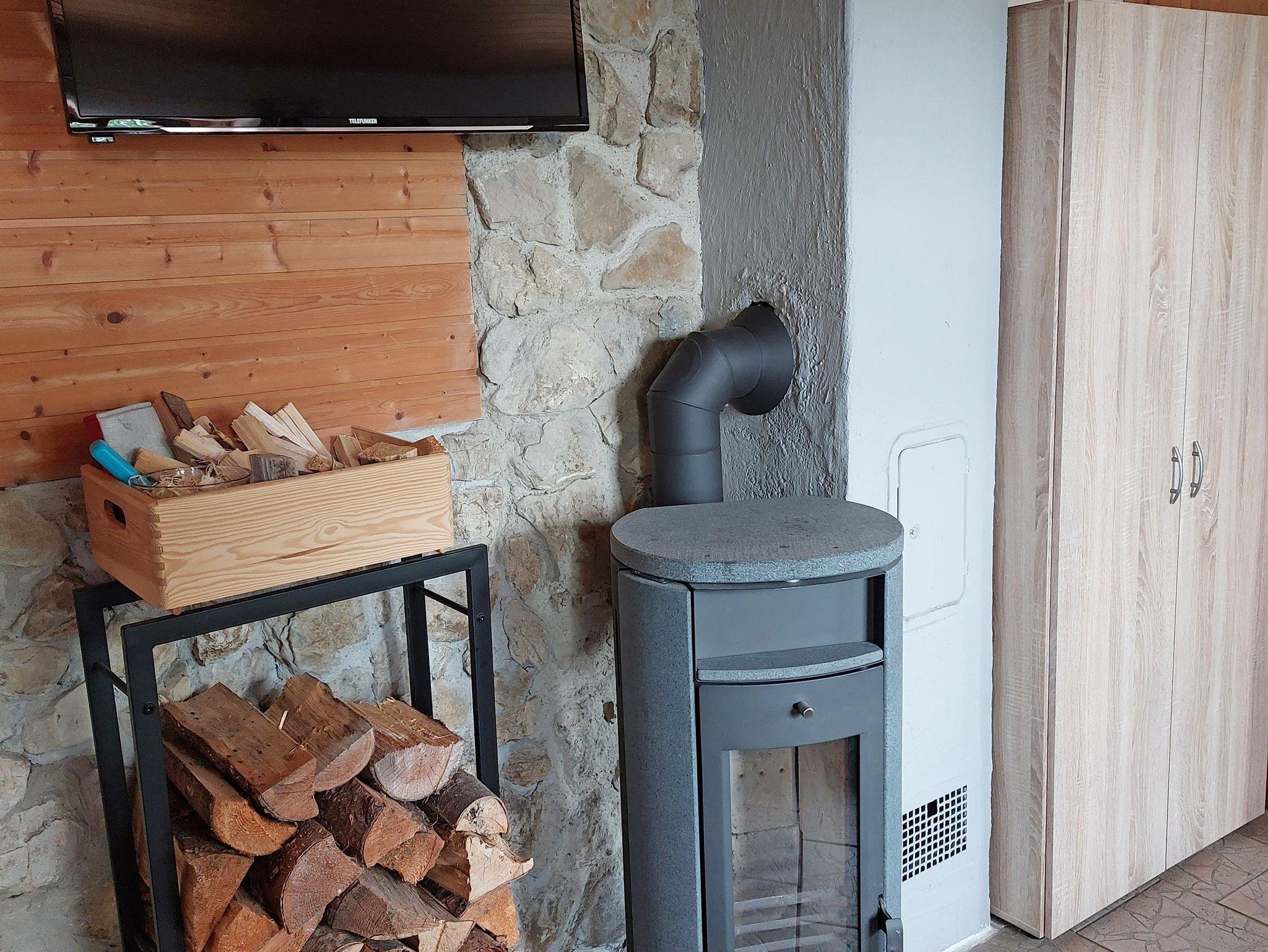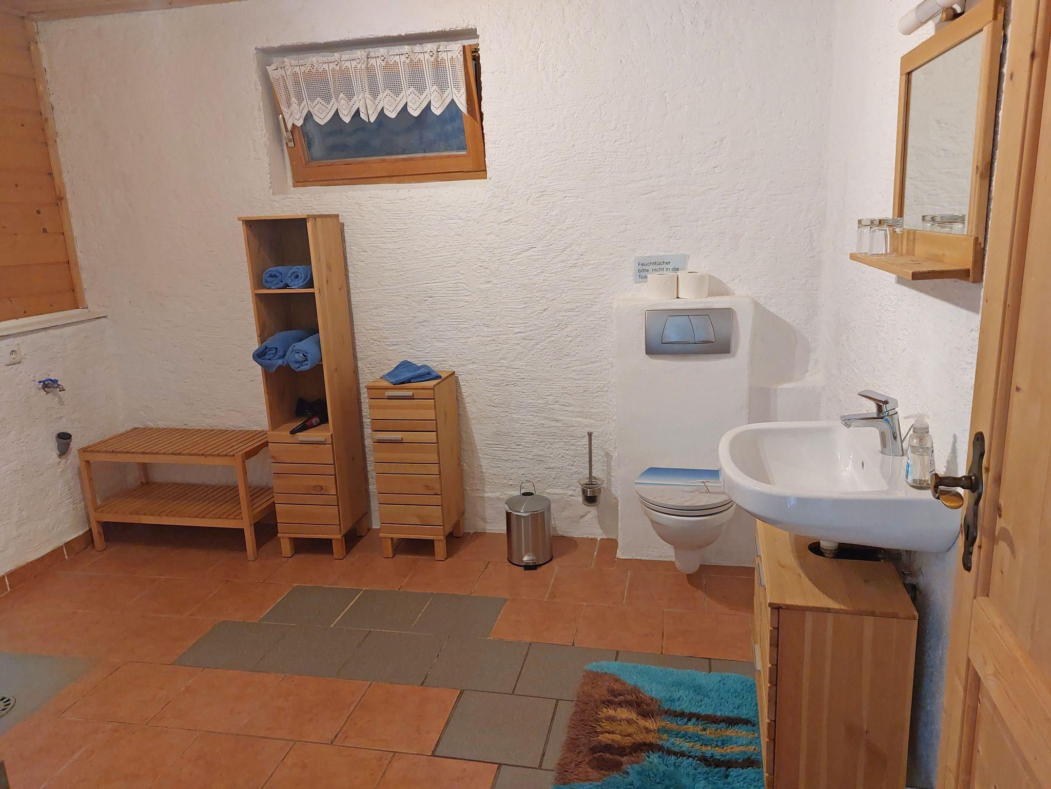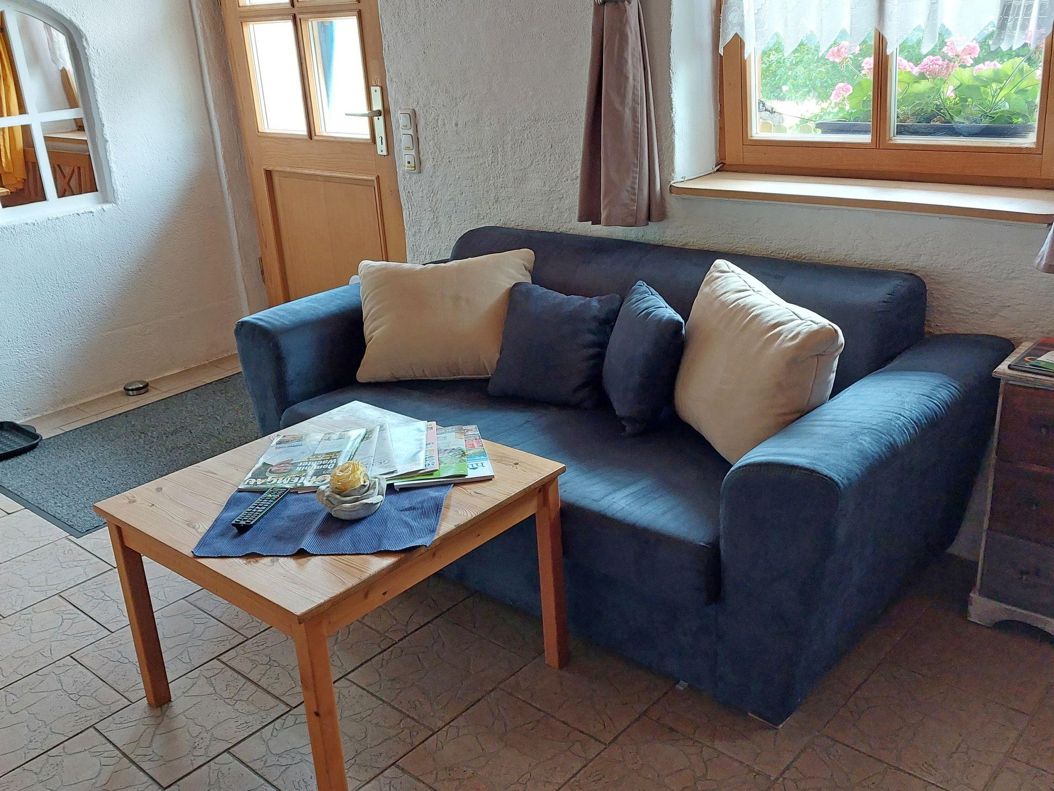 Liebevoll eingerichtete Nichtraucher-Ferienwohnung 46 qm mit Terrasse. Der offene Wohn-/Schlafraum mit Fußbodenheizung hat ein Doppelbett, eine Couch, eine Sitzecke, SAT-TV, kostenloses WLAN und einen Schwedenofen (1 x Holz zum Einheizen vorhanden). Die offene Küche ist vollausgestattet mit 2-Platten-Herd, Mikrowelle und Kühlschrank. Badezimmer mit Dusche/WC und Fön. Durch die Hanglage ist kein ebenerdiger Zugang zur Wohnung möglich, sie müssen ein kleines Stück über eine Stufe, bergab bis zum Eingang der Ferienwohnung. Unsere Ferienwohnung ist durch die Hanglage eine Souterrain-Wohnung und Sie haben eine Sonnenterrasse. Gerne darf auf der Terrasse geraucht werden.