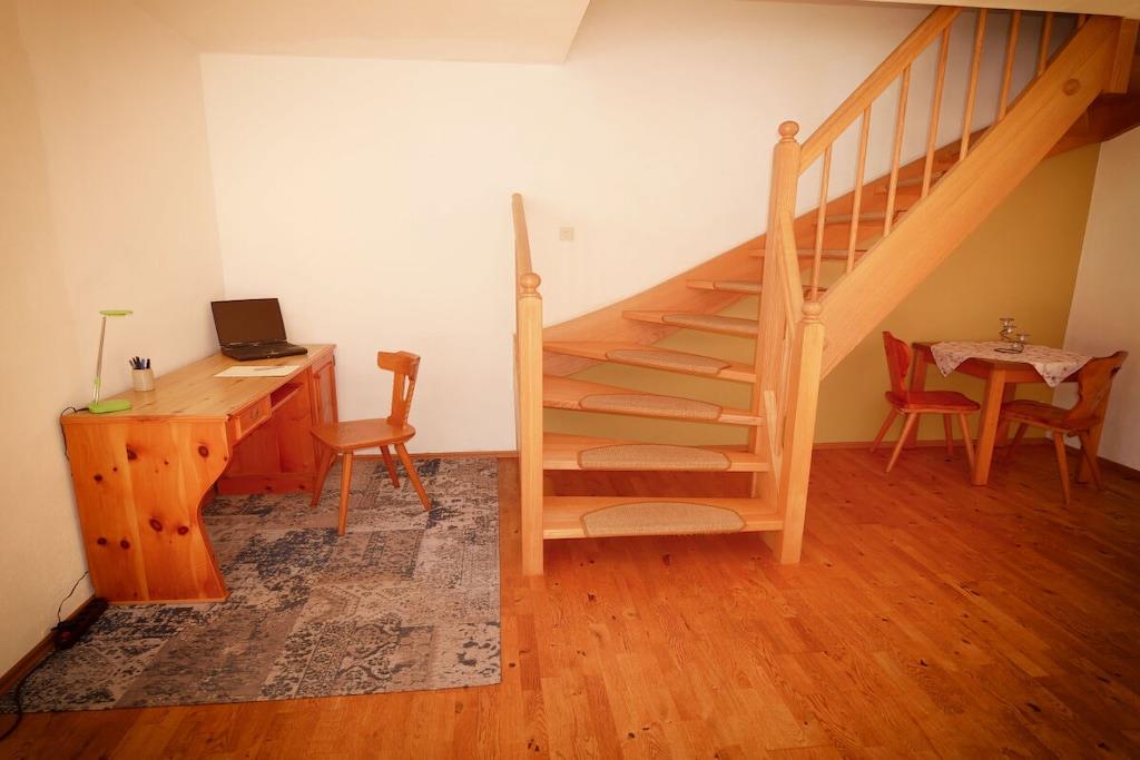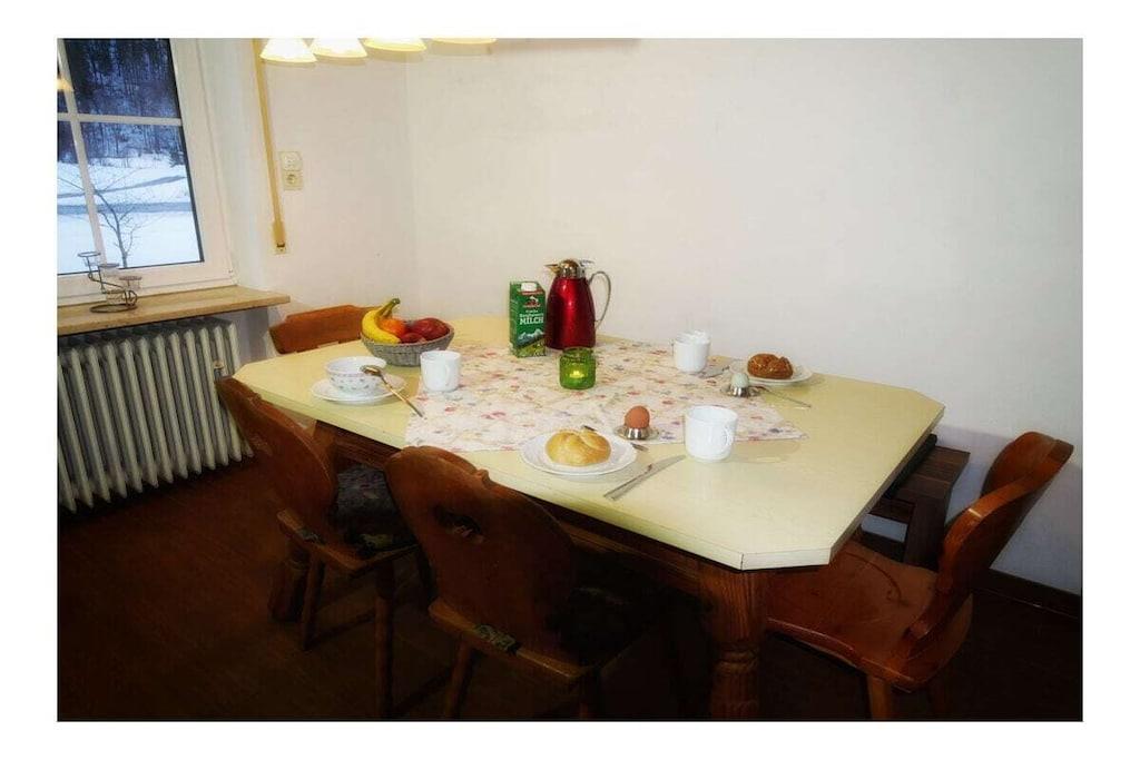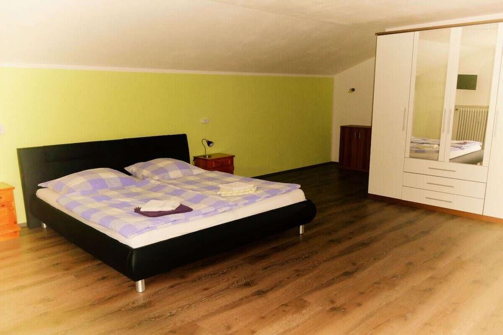 Großzügige Ferienwohnung mit 2 separaten Schlafzimmern und Schlafsofa auf 2 Etagen. Im 1. OG befinden sich 2 Schlafzimmer, ein Bad mit Dusch/Badewanne und ein großer Balkon. Das Erdgeschoss verfügt über eine voll ausgestattete Wohnküche (Backofen, Induktion/Cerankochfeld, Spülmaschine, Mikrowelle, Kaffee/Wasser/Eierkocher, ect.) mit Essecke, sowie einem Wohnzimmer mit großem Schlafsofa und Schreibtisch, W-LAN, Sat-TV, ein Bad mit Dusche und Waschmaschine, eine Abstellkammer mit Gefrierschrank und diversen Putz/Reinigungsuntensilien und einer Sonnenterrasse mit Gartenmöbeln. Zustellbett/Babybett auf Anfrage. Eine Liegewiese befindet sich vor der Terrasse, Spielgeräte im Garten, Grillmöglichkeit vorhanden, Unterstellmöglichkeit für Fahrräder und Ski vor Ort. Brötchenservice (außer Sonn-u. Feiertag) vor Ort buchbar.