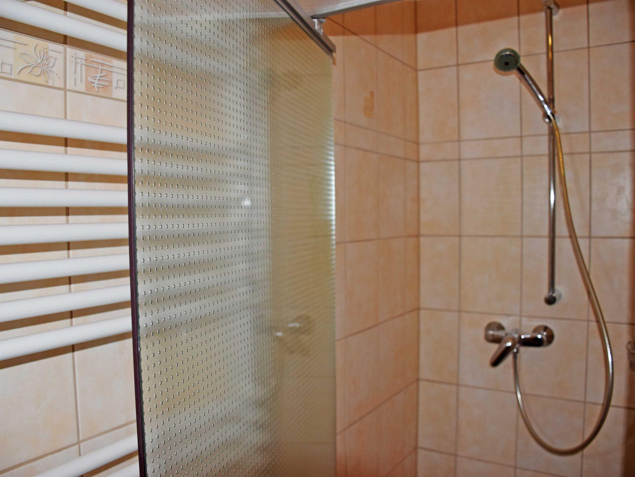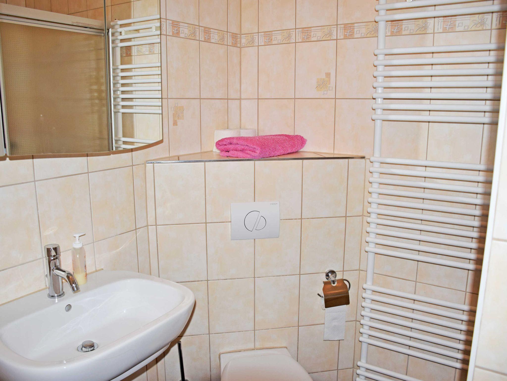 Das Bad ist mit WC, Dusche, Waschtisch und Handtuchtrockner ausgestattet.