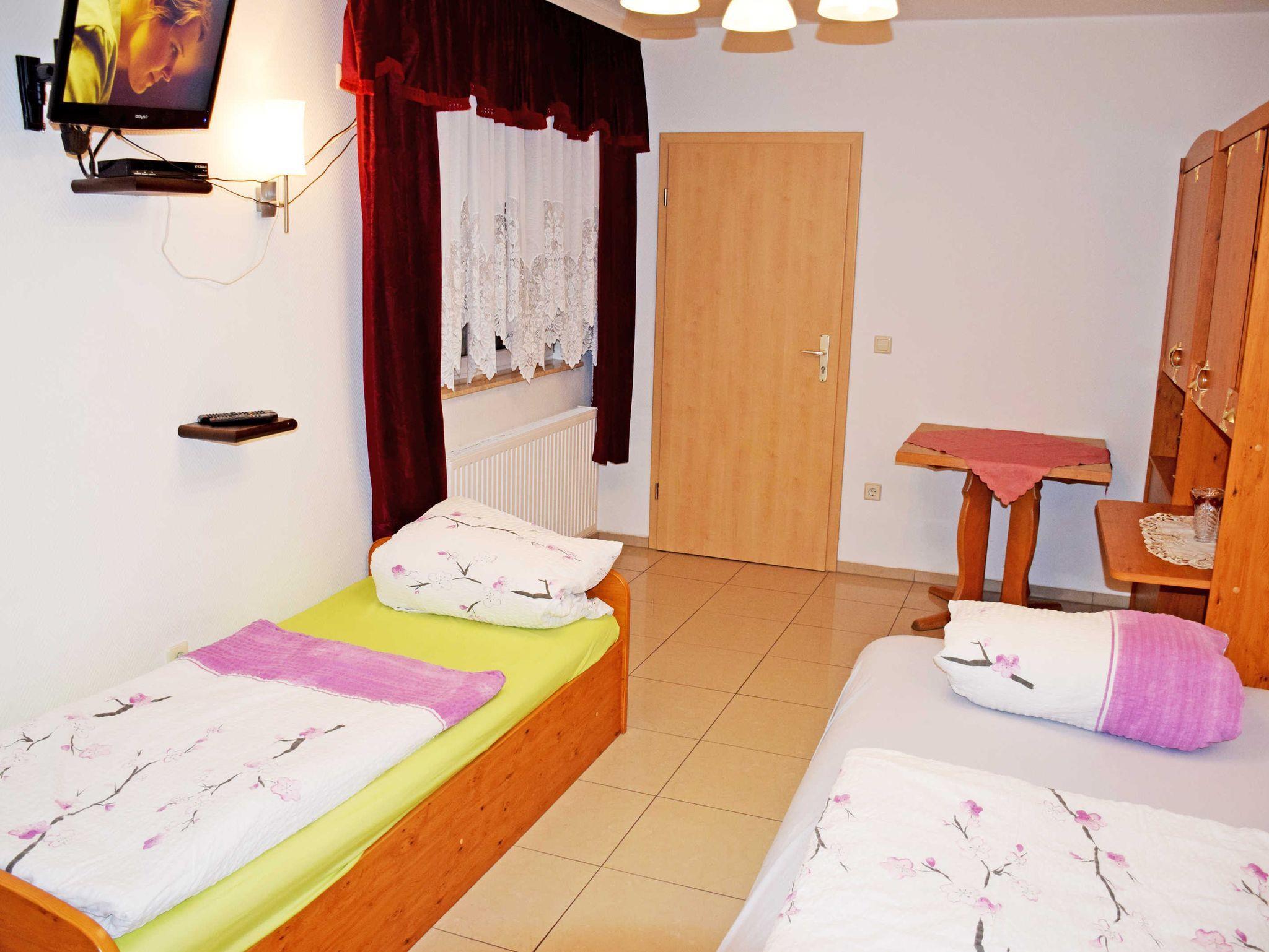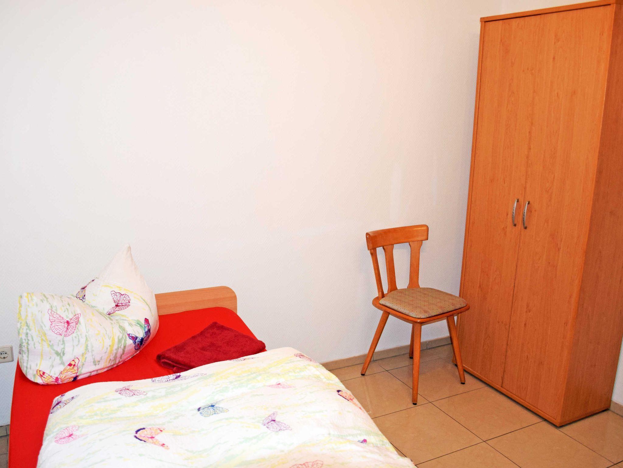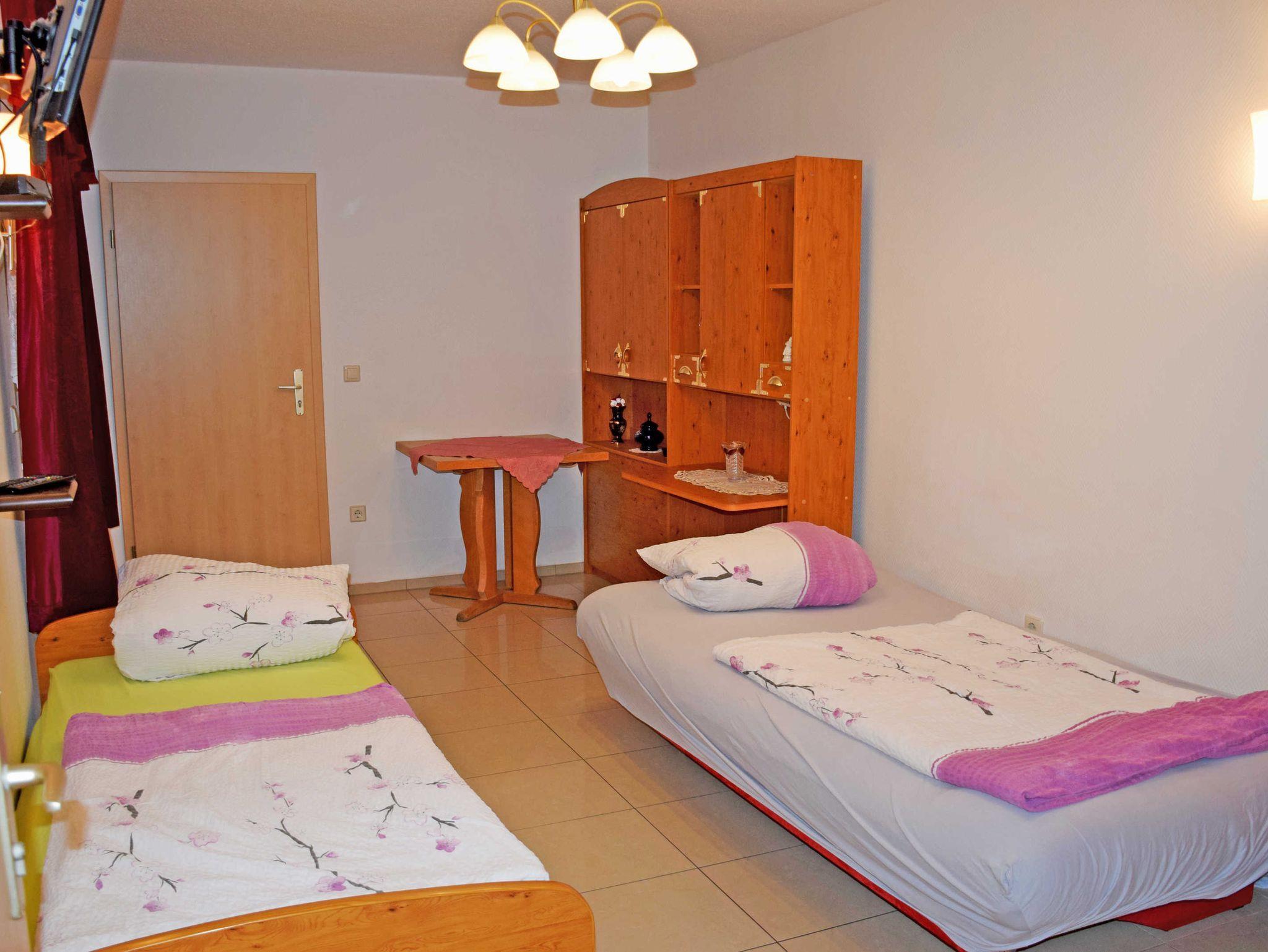 Im daneben liegenden zweiten Schlafzimmer gibt es zwei Einzelbetten und ein Kleiderschrank.