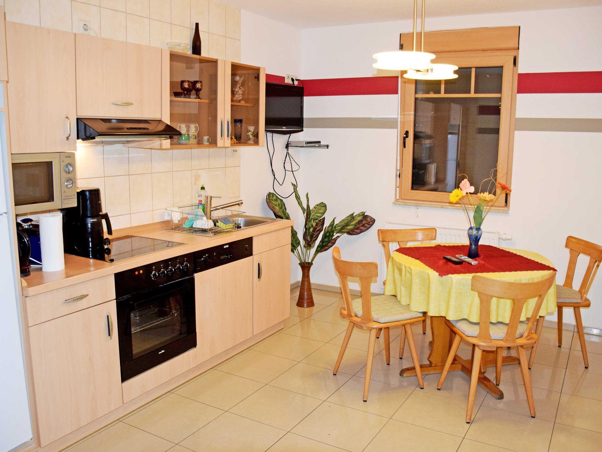 In der Küche gibt es neben dem Esstisch mit Stühlen einen Carankochfeldherd, Kühlschrank mit Gefrierteil, Abzugshaube, Mikrowelle, Spühlmaschine, Wasserkocher, Kaffeemaschine und Toaster. Hier befindet sich auch ein Flachbild-TV.