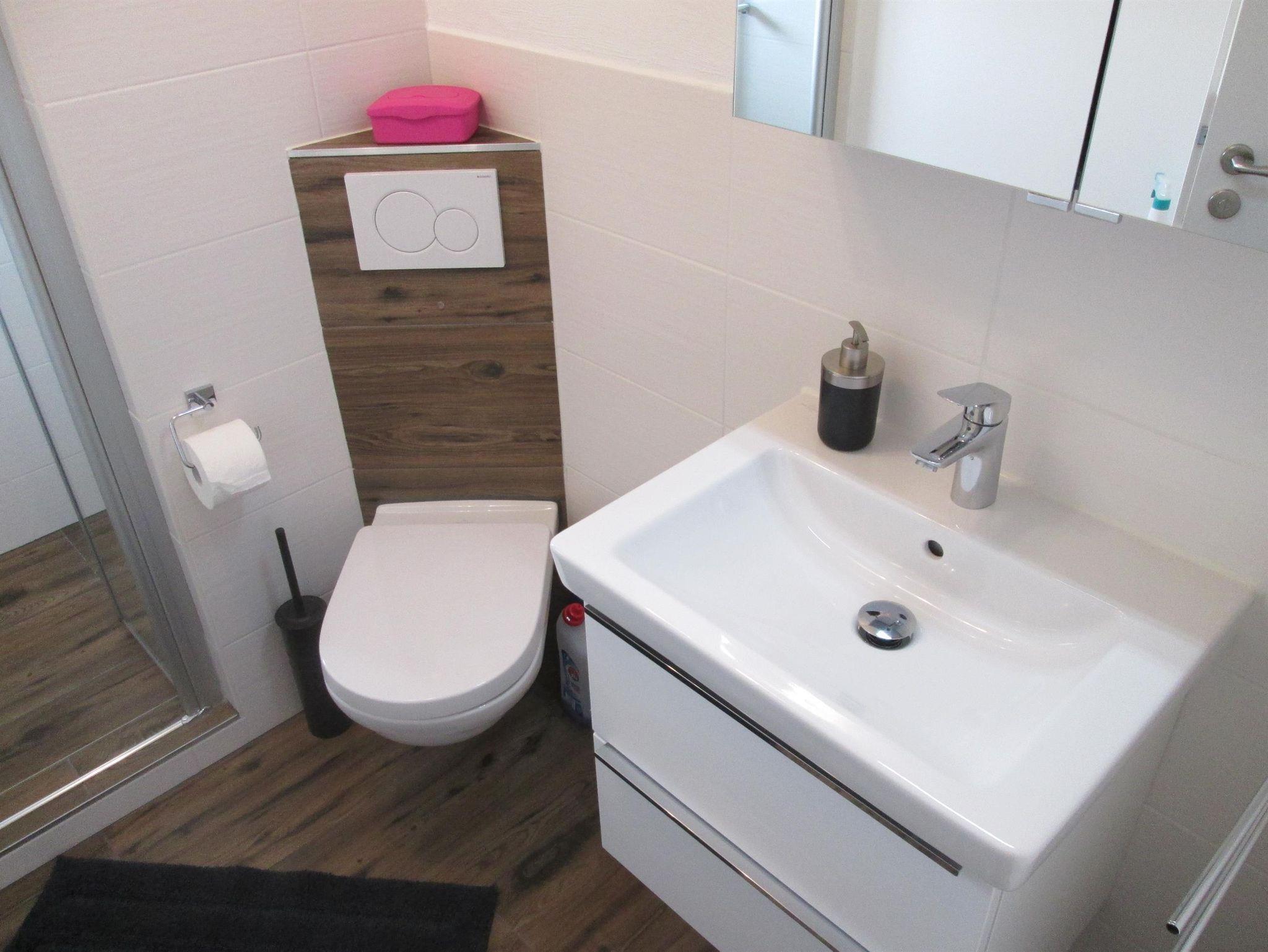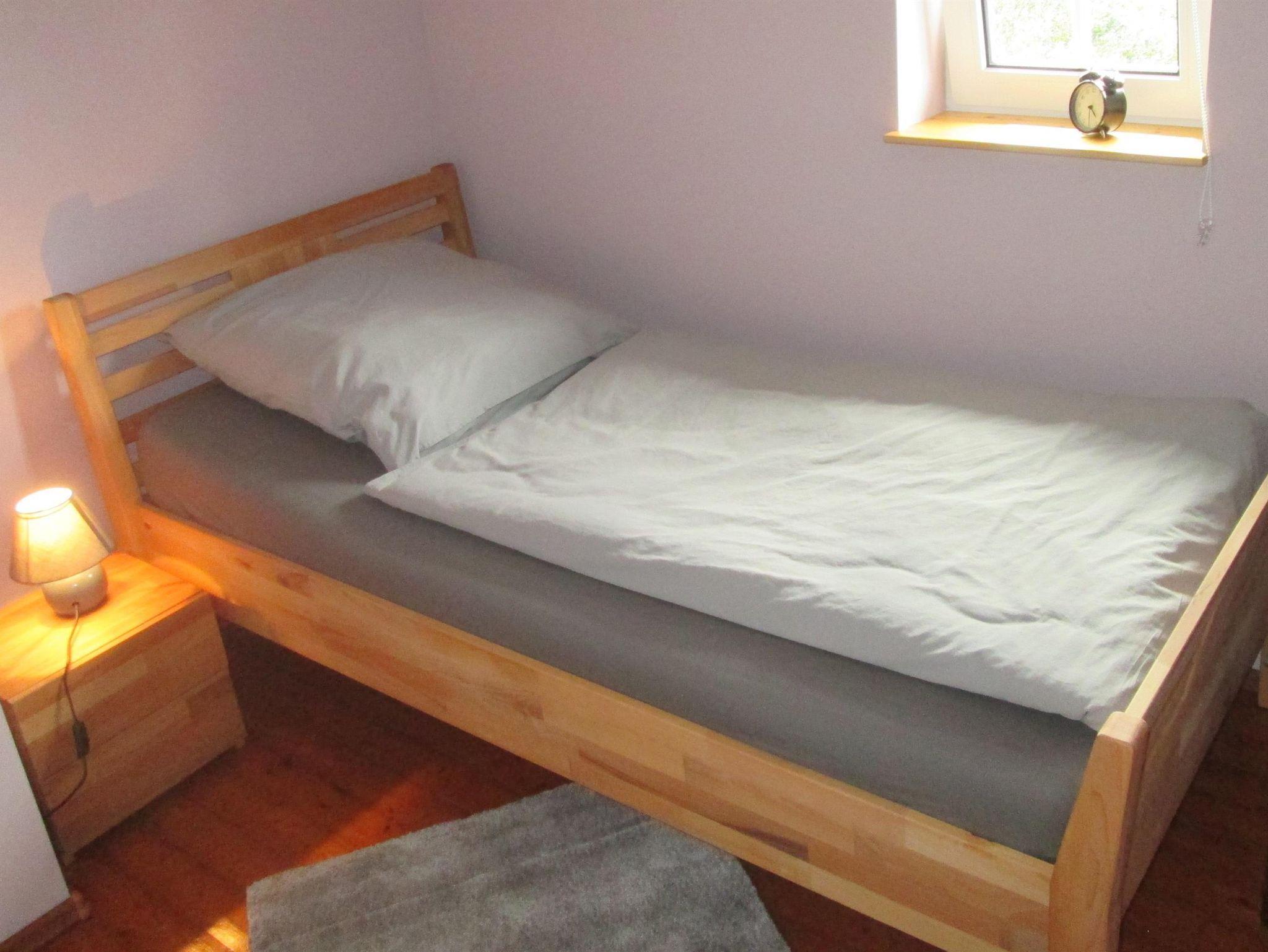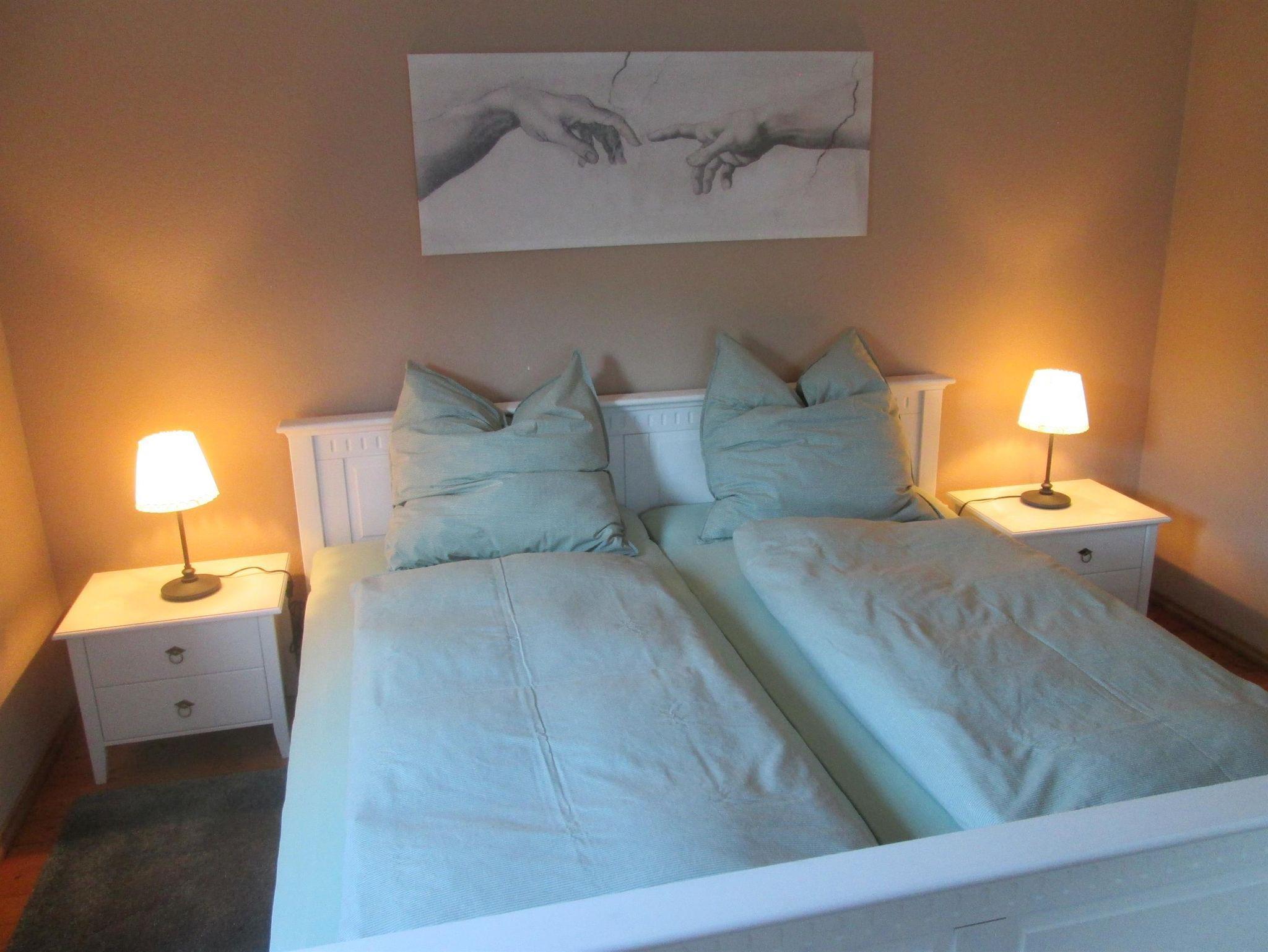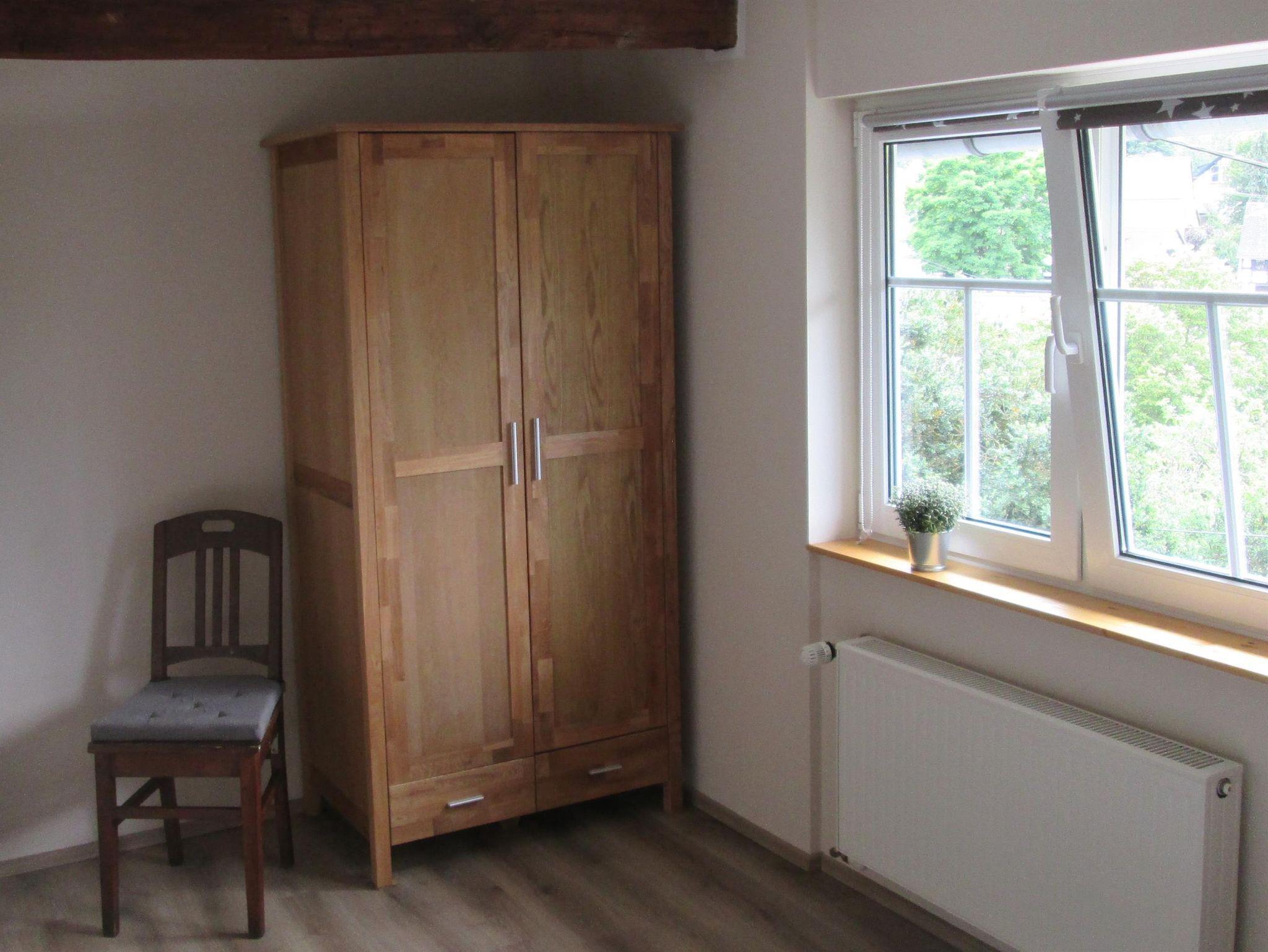 In einem Doppelzimmer steht zusätzlich ein Kinderbett zur Verfügung. Ein Kinderstuhl ist ebenfalls vorhanden. Das Badezimmer mit Toilette und begehbarer Dusche finden Sie auch im Obergeschoss.
