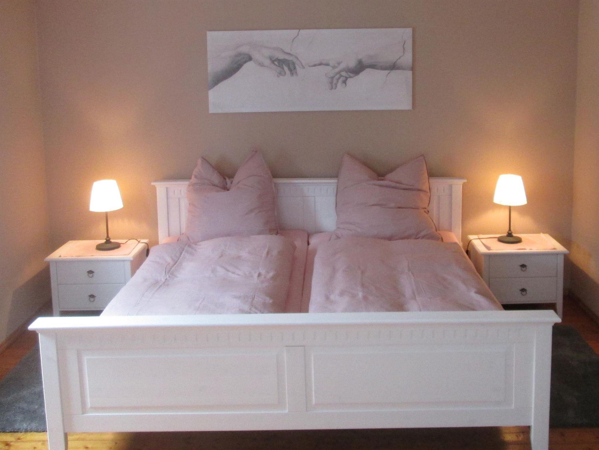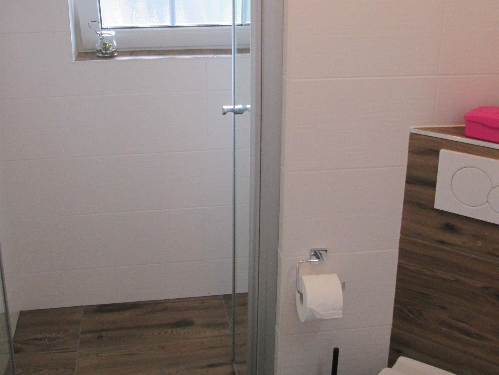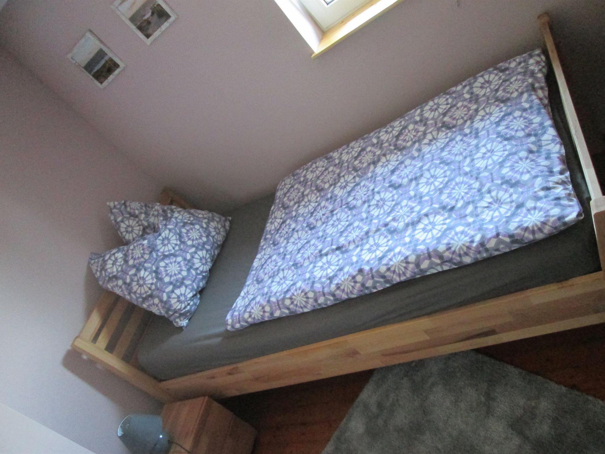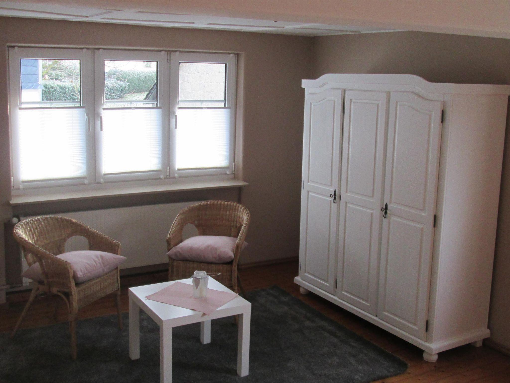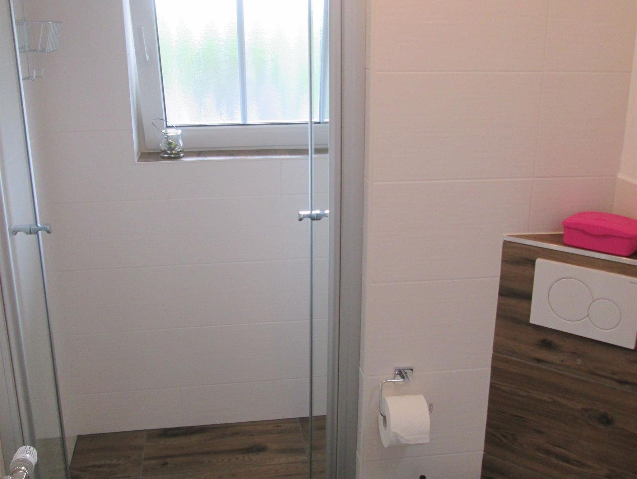 In einem Doppelzimmer steht zusätzlich ein Kinderbett zur Verfügung. Ein Kinderstuhl ist ebenfalls vorhanden. Das Badezimmer mit Toilette und begehbarer Dusche finden Sie auch im Obergeschoss.