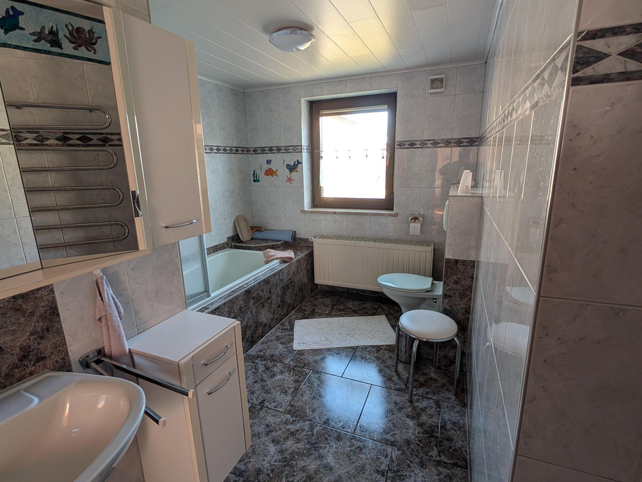 Ein großes Badezimmer mit Badewanne befindet sich direkt neben dem Schlafzimmer mit Doppelbett. Ein weiteres WC mit Dusche befindet sich im Flur.