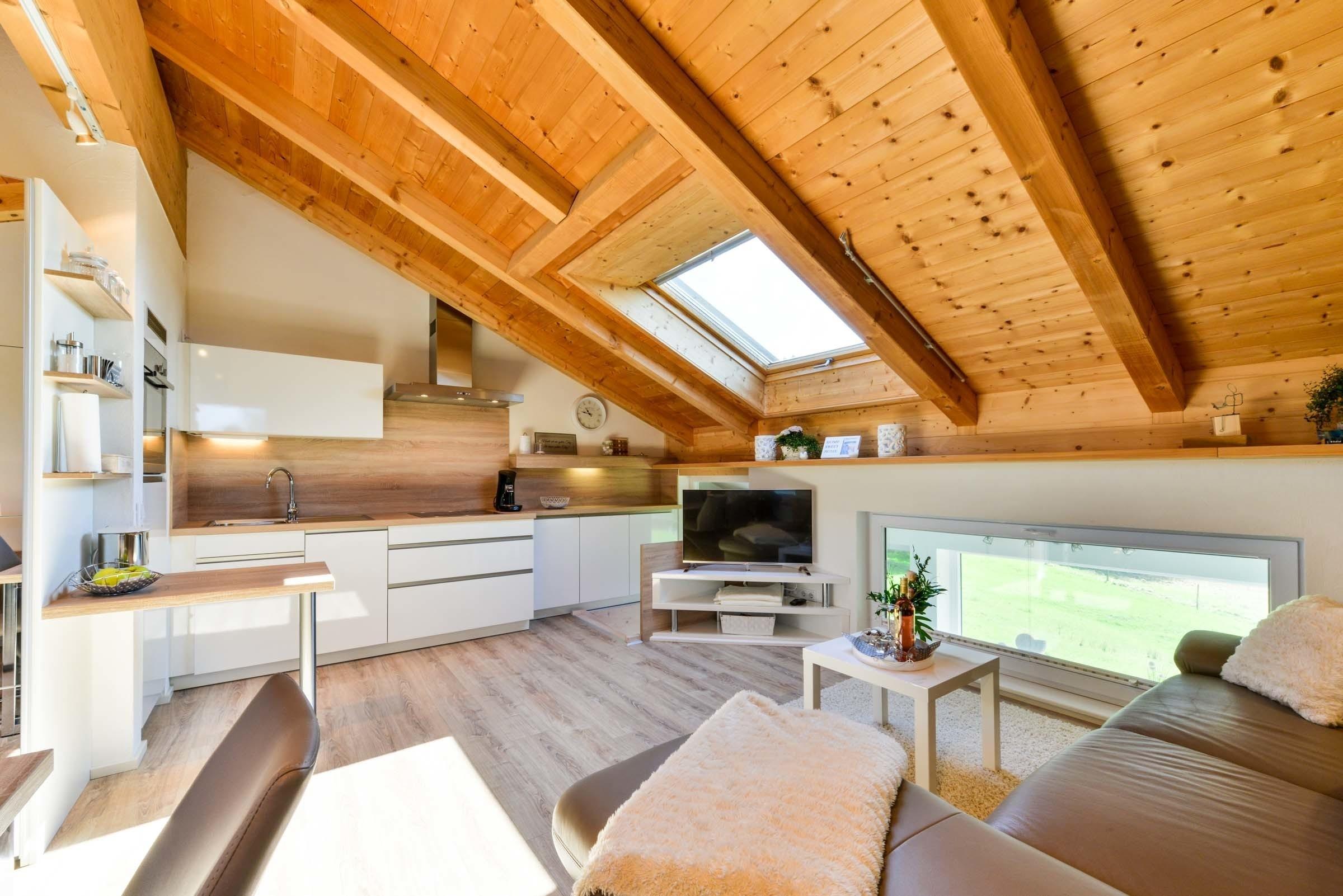 Gelegen im Obergeschoss des Nebengebäudes bieten die Wohnungen einen großartigen Ausblick. Die idyllische Stimmung zwischen Wald und See bietet einzigartige Ruhe und Erholung. Die geschmackvoll gestaltete Ferienwohnung 2 verfügt über einen stilvoll kombinierten Wohn- und Essbereich. Die Wohnfläche besticht mit einer großen, einladenden Couch. Der Esstisch mit lädt zum gemeinsamen Speisen ein. Der moderne Küchenbereich bietet eine freistehende Kochinsel. Ideal zum Zubereiten von Speisen und Snacks.