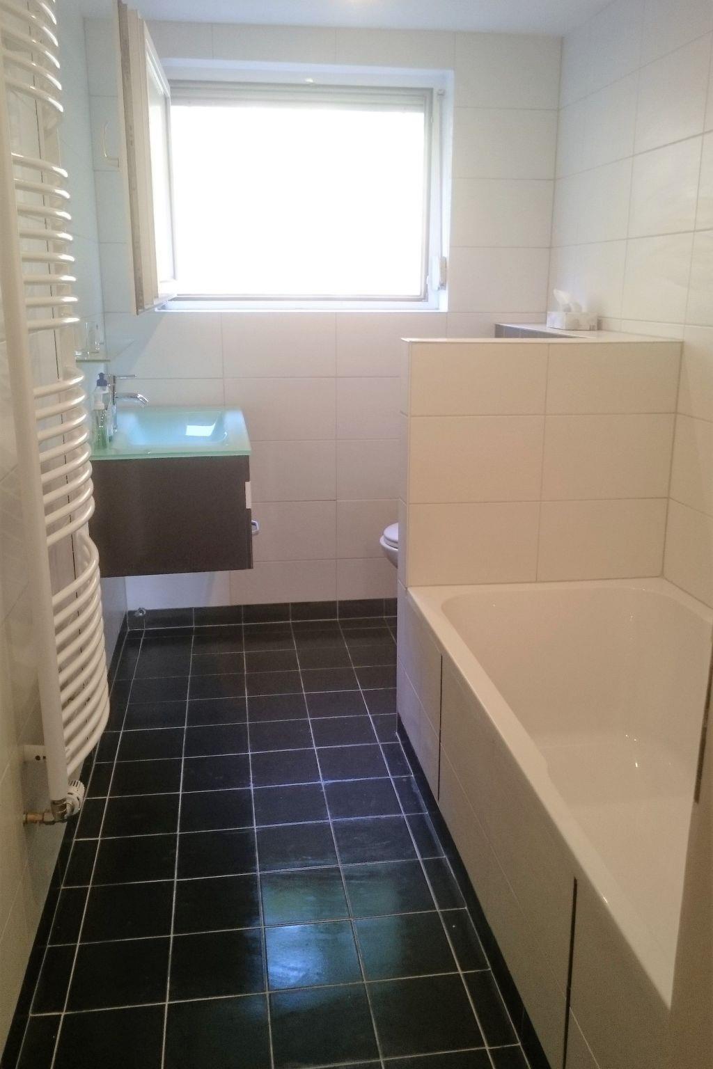 The bathroom with a bathtub, with a flat area in the bath where the shower is also located. You shower in the bath. In this same bathroom is also the sink and toilet.