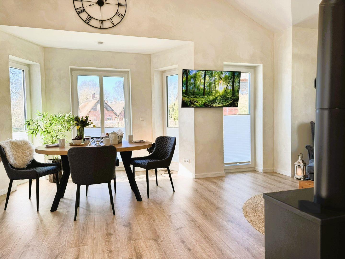 Ein kleiner Eingangsbereich (mit praktischem, verstecktem Hauswirtschaftsbereich und Waschmaschine) führt in den großzügigen Wohnbereich mit bodentiefen Fenstern, die viel Licht und Weite schaffen. Ein gemütlicher Kaminofen sorgt an kühleren Tagen für wohlige Wärme. Die bequeme Couch mit Blick in den Garten, ein Sessel mit Hocker und der große Esstisch laden zu gemeinsamen Stunden mit der Familie ein – beim Spielen, Lesen oder einfach nur Entspannen.