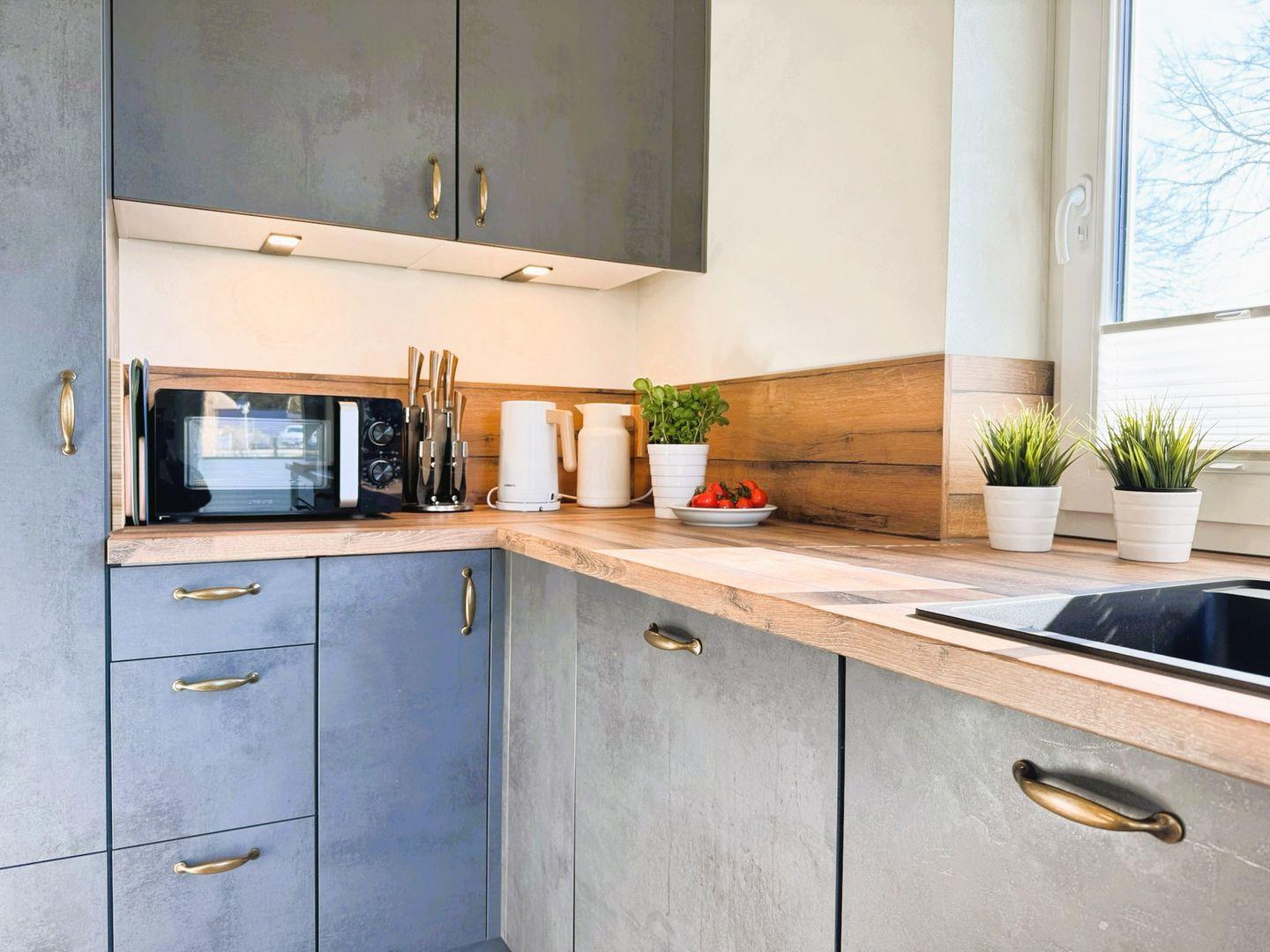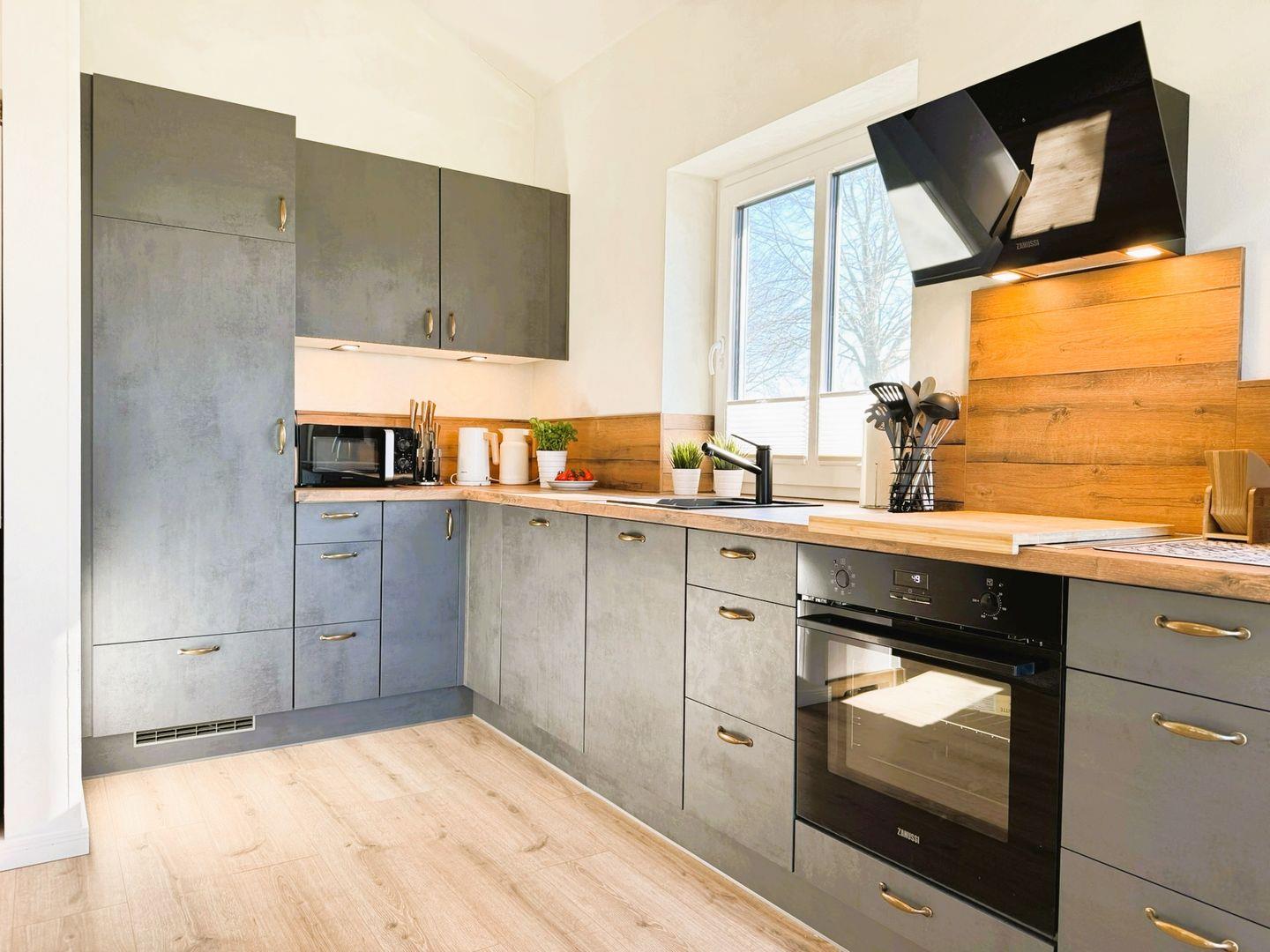 Die offene, voll ausgestattete Küche ist harmonisch in den Wohnraum integriert und bietet direkten Zugang zur Terrasse. Im eingezäunten Garten mit Gartenmöbeln lässt sich wunderbar frühstücken, entspannen oder den Abend beim Grillen ausklingen. Die Rasenpflege übernimmt ein Rasenmähroboter - individuelle Einstellungen sind nach Absprache möglich. Es gibt ein paar mobile Gartenspiele (u. a. Wikingerschach, Ringewerfen) und für Familien mit kleinen Kindern ist ein toller Spielplatz (mit Schaukeln, Seilbahn, Sandplatz, Spielhäuschen) in der näheren Nachbarschaft und fußläufig erreichbar.