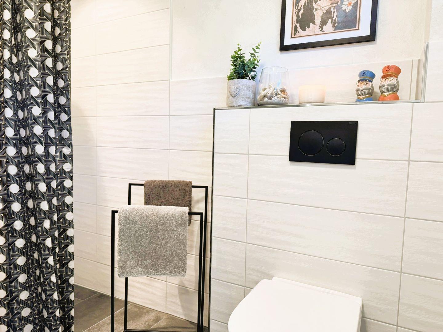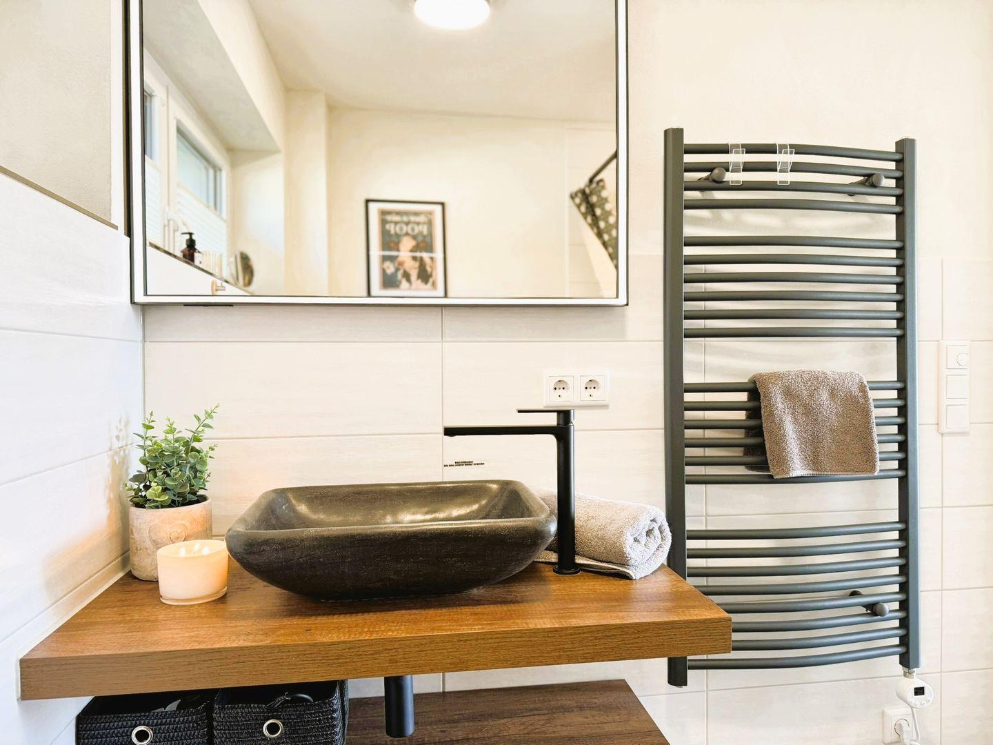 Das moderne Badezimmer bietet eine bodentiefe Dusche (mit Duschvorhang), eine Handtuch- und eine Fußbodenheizung, moderner Waschtisch, einen Föhn und ein Tageslichtfenster.