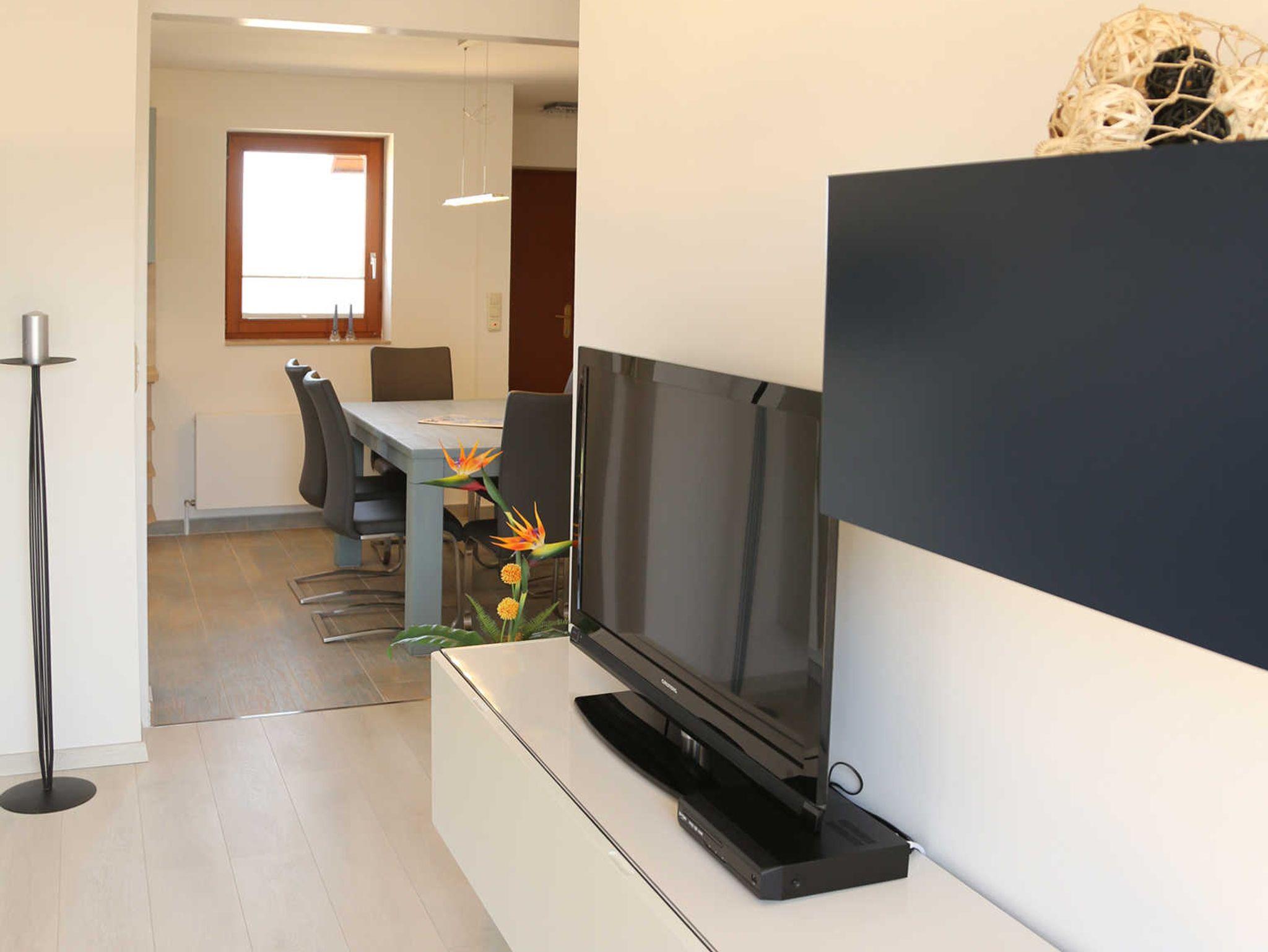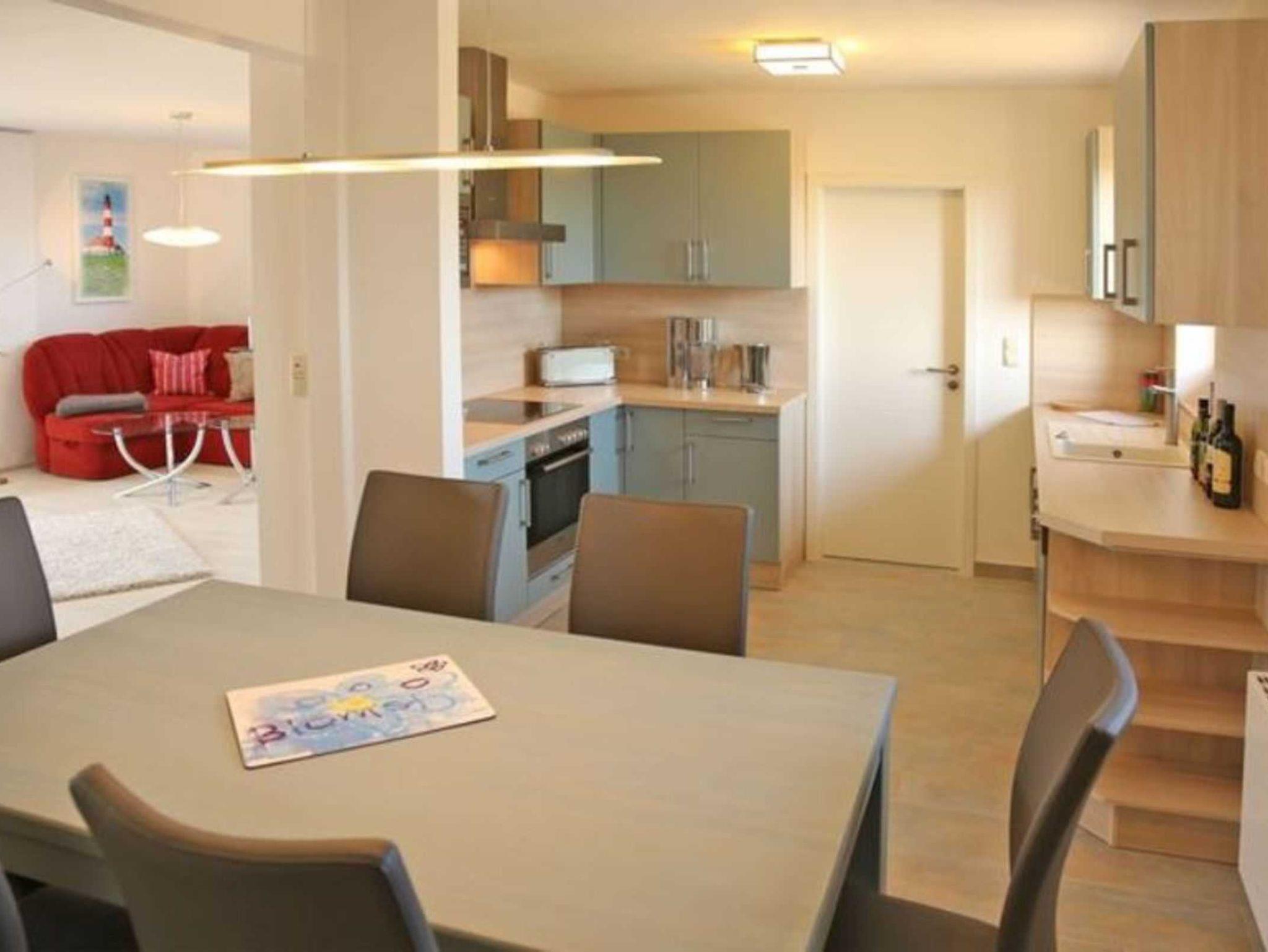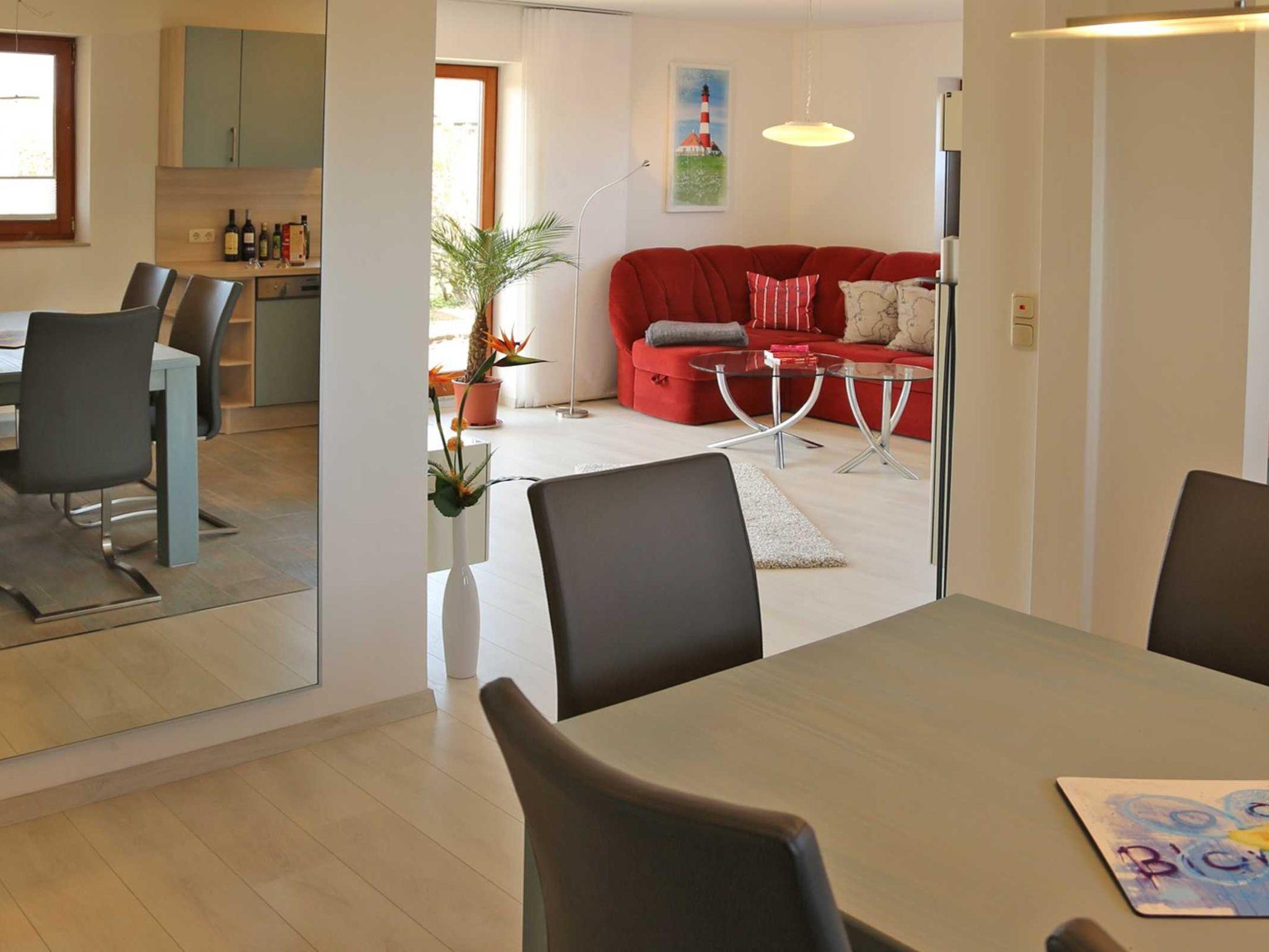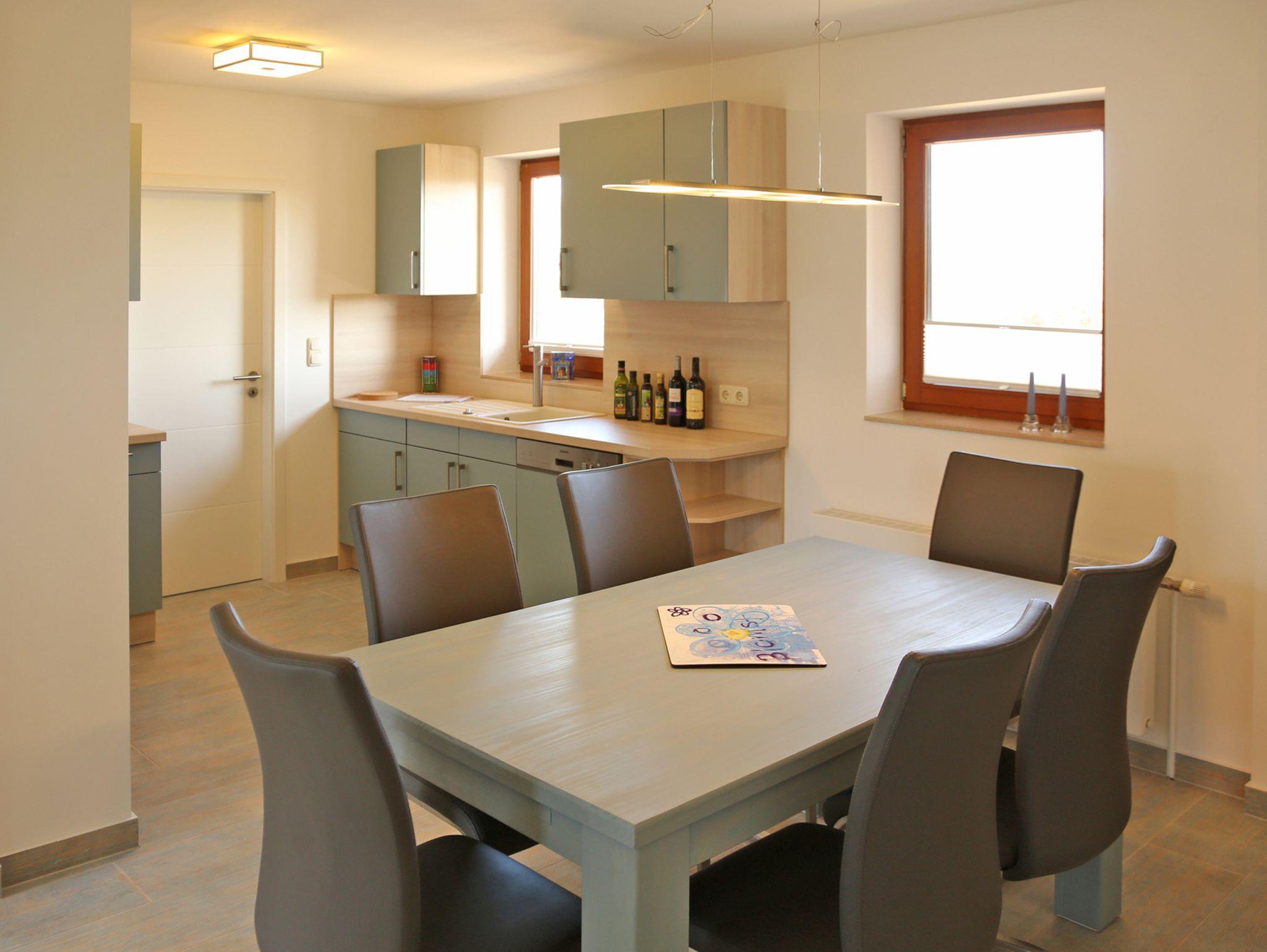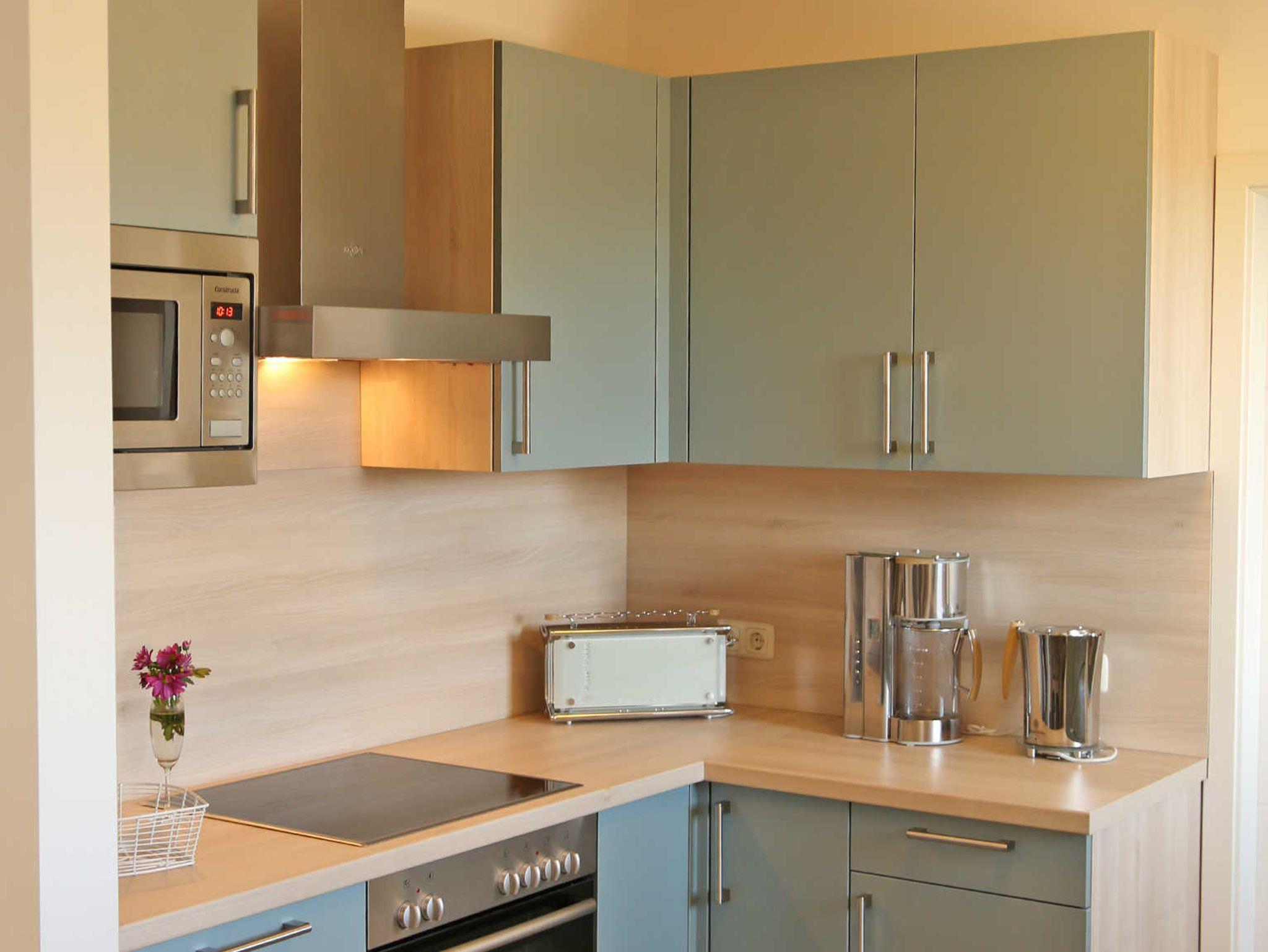 Sie bewohnen das Erdgeschoss des Hauses mit möblierter Außenterrasse. Die moderne, offene Küche mit Essplatz für bis zu vier Personen ist ausgestattet mit Kühlschrank inklusive kleinem Gefrierfach, Spülmaschine, Herd mit Cerankochfeld und Backofen, Toaster, Kaffeemaschine sowie Wasserkocher.