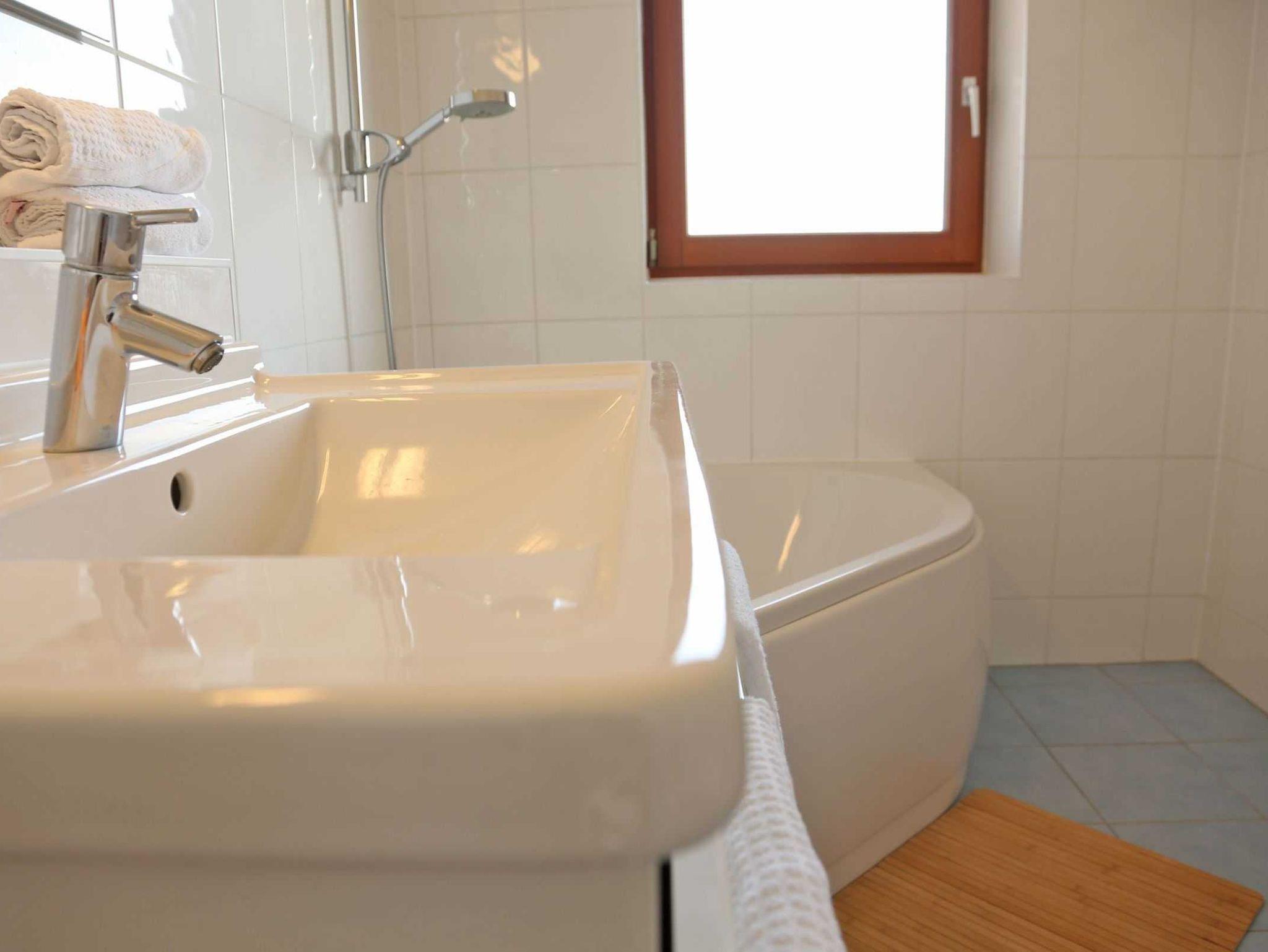 Das Badezimmer mit Tageslicht lädt mit einer Eckbadewanne zum Entspannen ein.