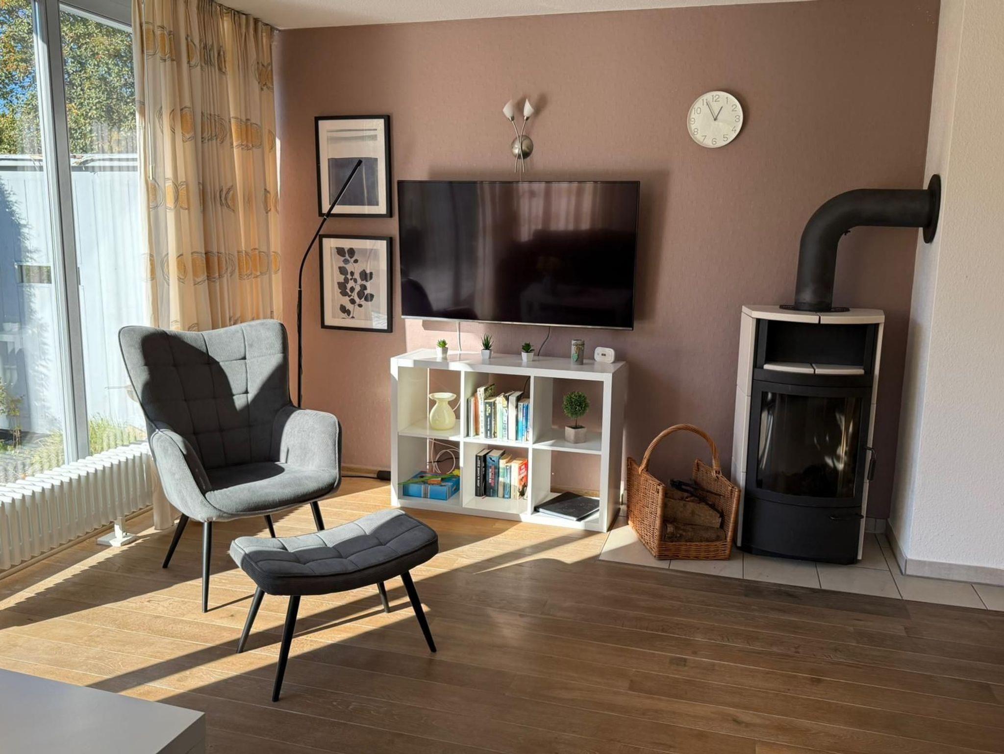 Das Erdgeschoss überzeugt mit einem offenen Wohn- und Essbereich, in dem Sie es sich am Kamin auf der großen Eckcouch mit Sessel und Hocker gemütlich machen können. Die Küche ist bestens ausgestattet mit Geschirrspüler, Cerankochfeld, Mikrowelle, Kühlschrank, Toaster und einem modernen Airfryer (Heißluftfritteuse). Ein separates Gäste-WC befindet sich ebenfalls im Erdgeschoss.