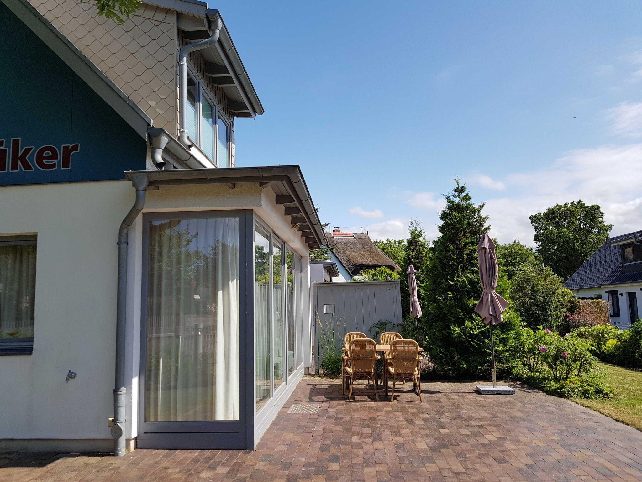 Vom Wohnzimmer gelangen Sie direkt auf die Terrasse mit kleinem Garten ? perfekt für ein Frühstück in der Sonne oder einen gemütlichen Abend an der frischen Seeluft.