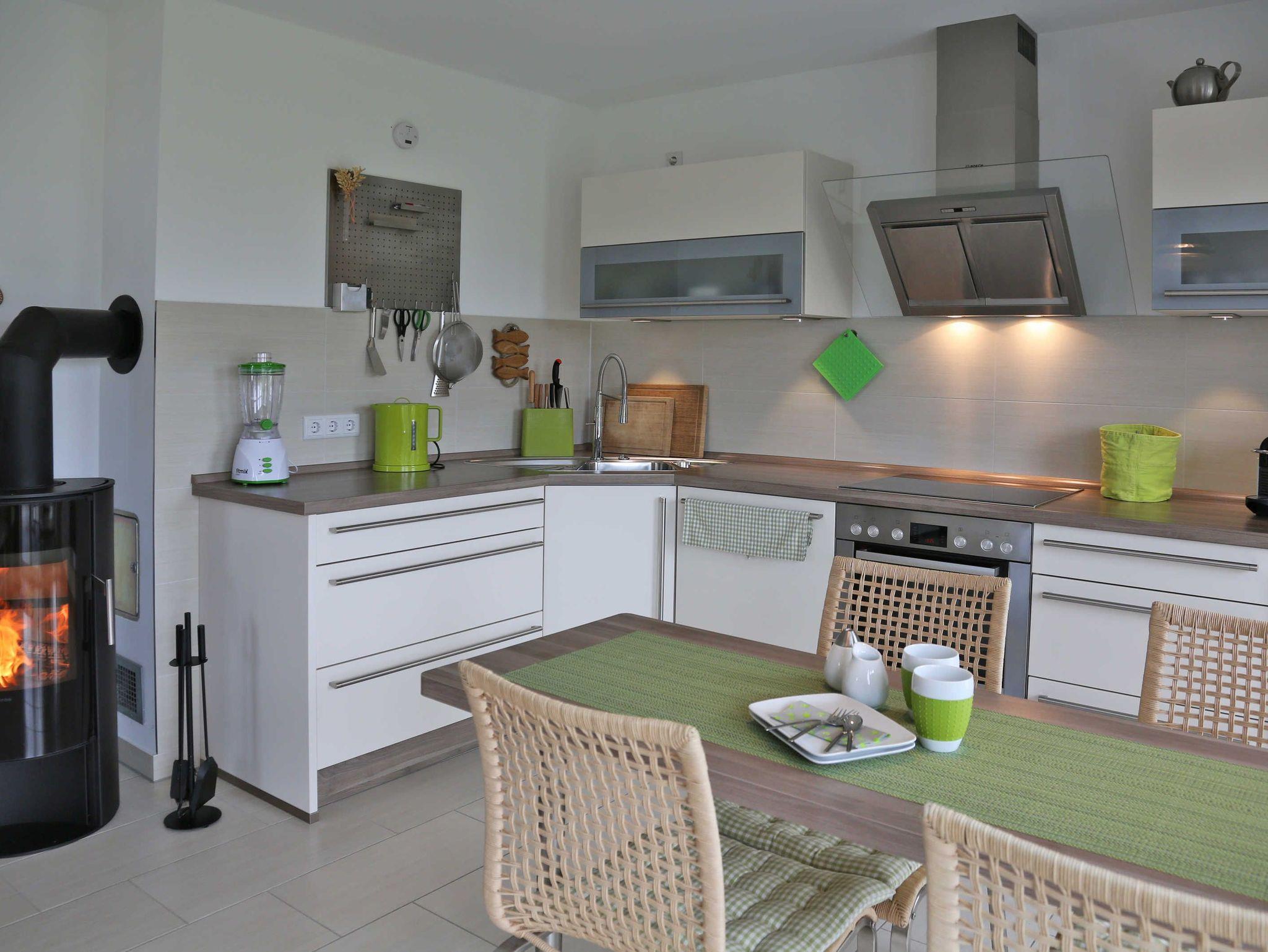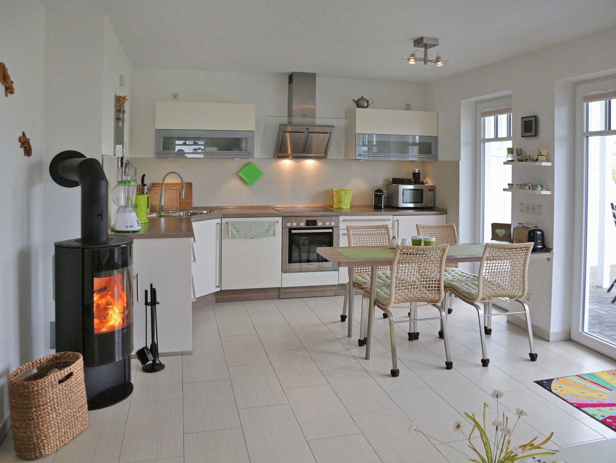 Die Küche ist hochwertig ausgestattet mit Induktionsherd, Backofen, Spülmaschine, Mikrowelle, Wasserkocher, Toaster, Kaffeemaschine, Kühlschrank mit Gefrierfach sowie ausreichend Ess- und Kochgeschirr.