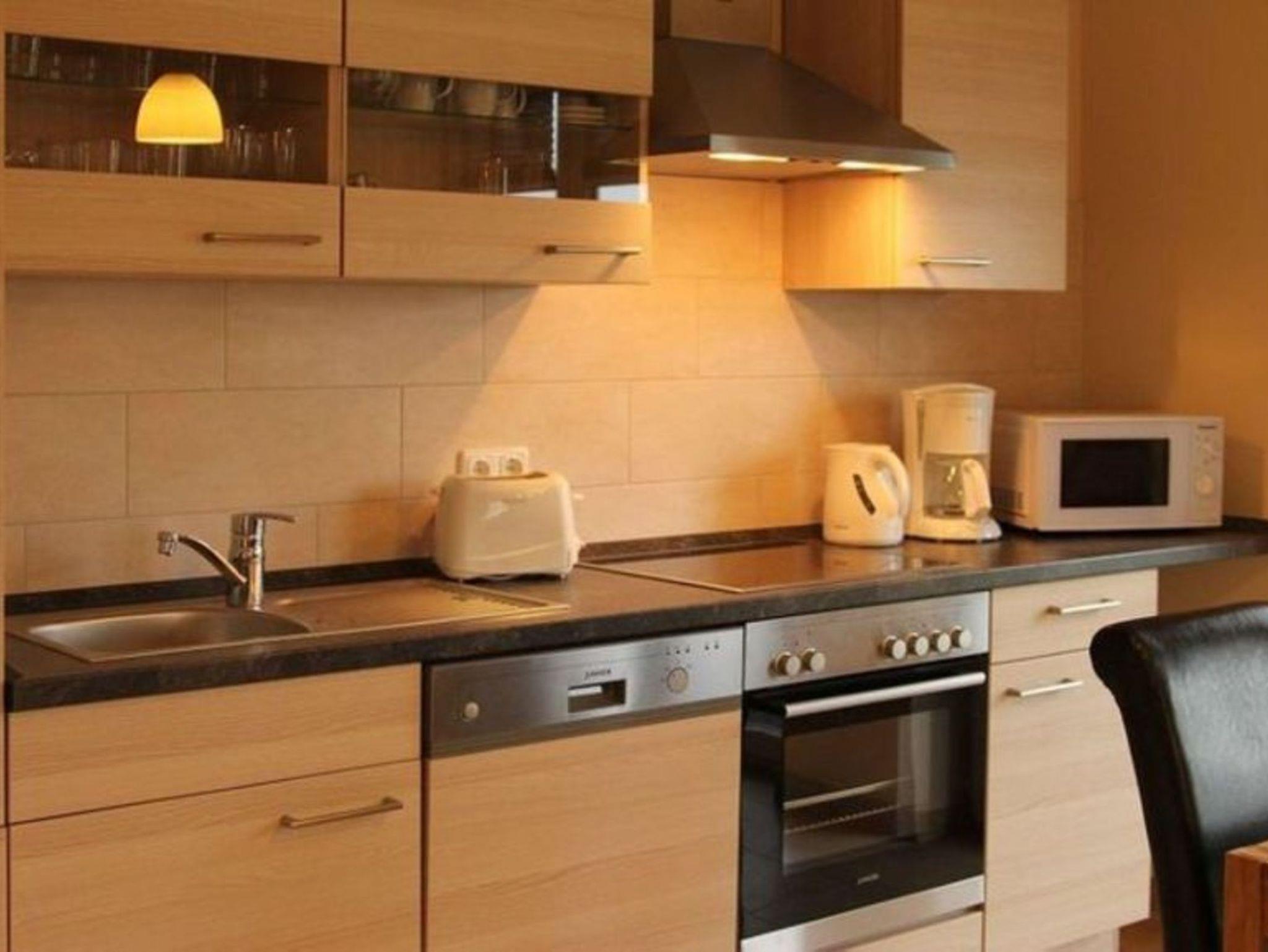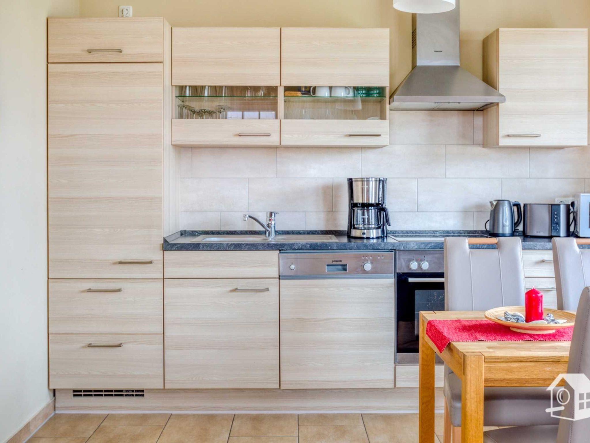 Die hochwertige offene Wohnküche bietet auch im Urlaub alle Möglichkeiten. Sie finden hier u. a. einen Ceranherd, Geschirrspülmaschine, Mikrowelle, großen Kühlschrank mit Gefrierfach und einen Umluftbackofen.