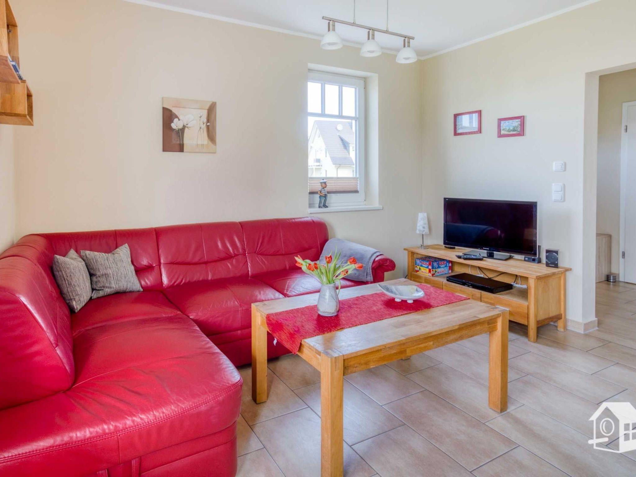 Der Wohnbereich besticht durch seine Ledereckcouch mit integrierter Schlaffunktion. Zum Ausklingen der Urlaubstage befindet sich hier ein Flachbildfernseher, sowie ein 2.1 Blu-Ray Heimkino System. Ein Kaminofen macht die Wohnung auch für die kühlere Jahreszeit gemütlich.