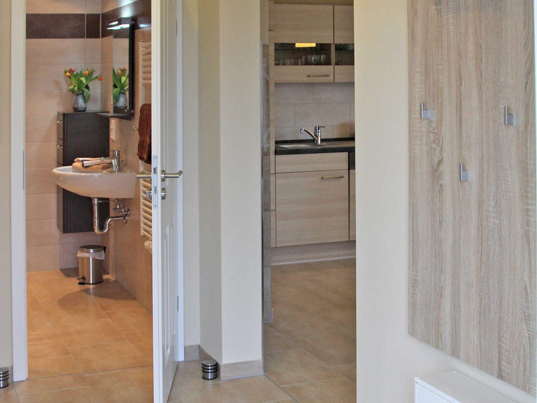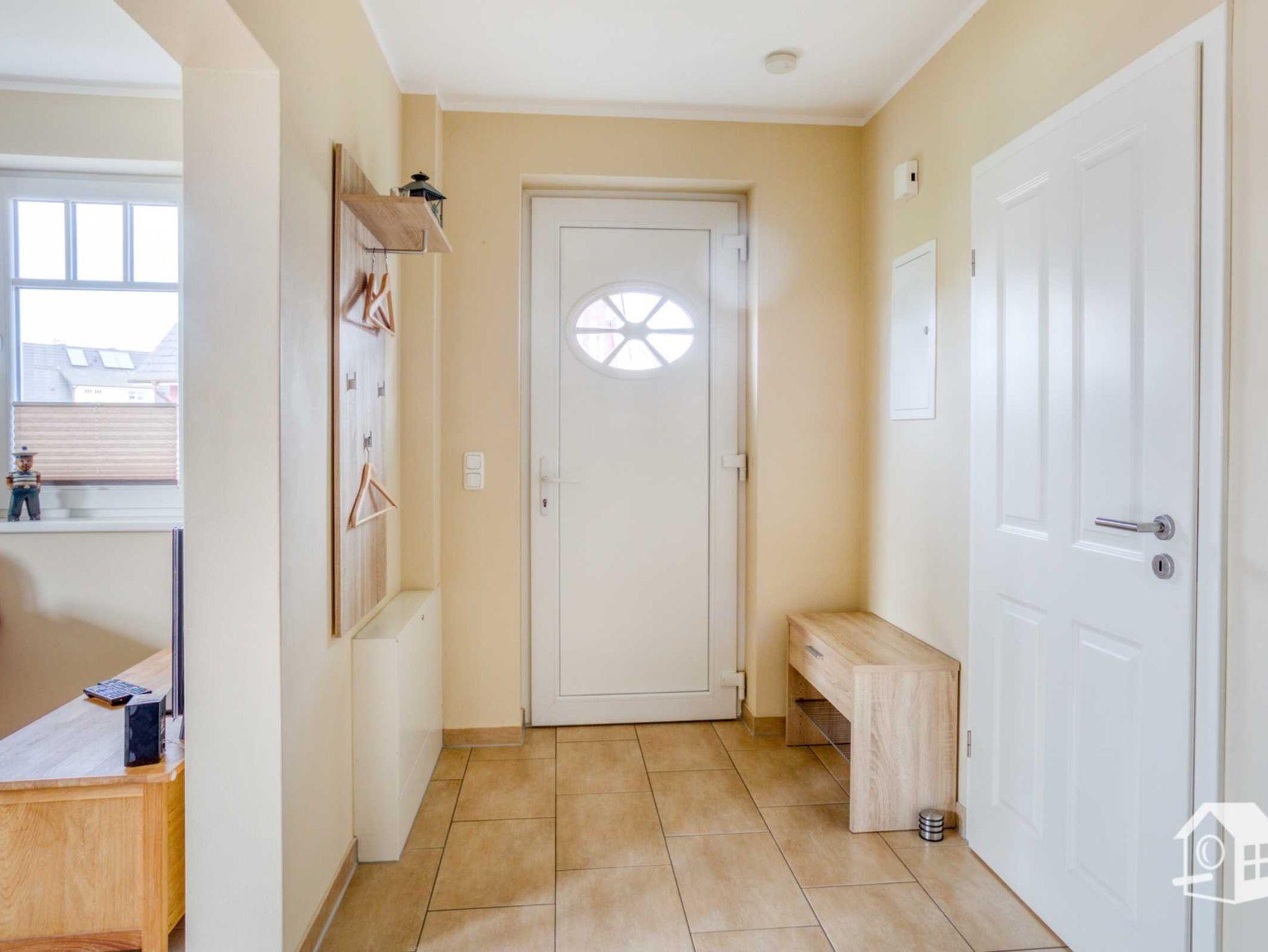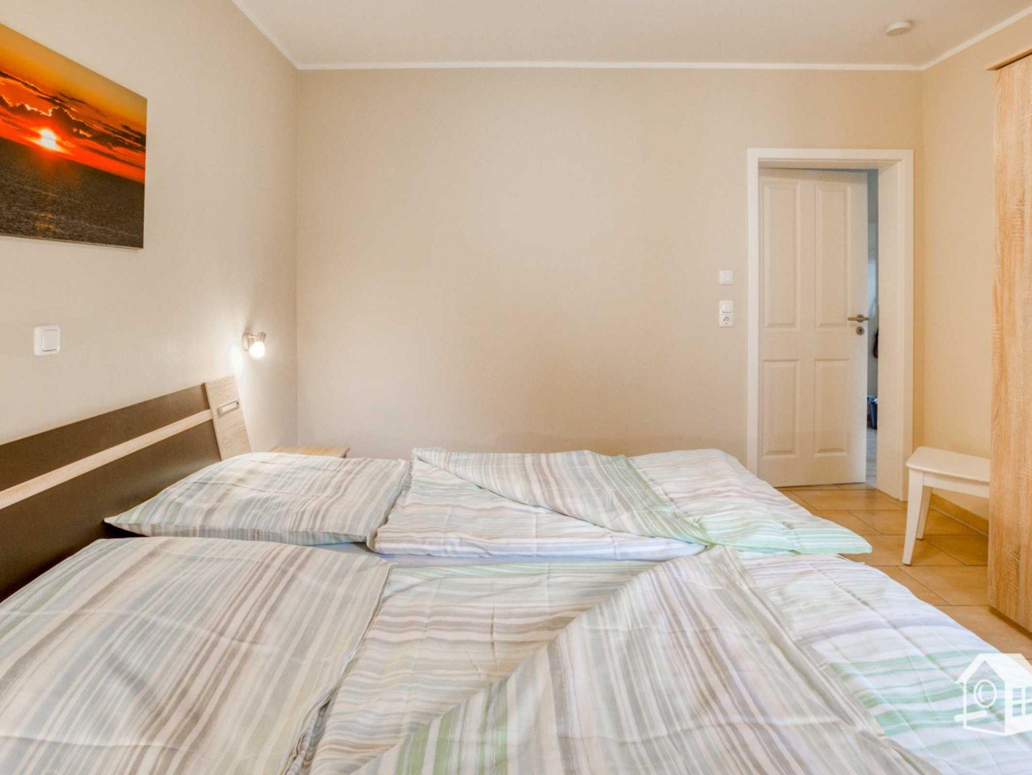 Die gesamte Wohnung ist mit einer Fußbodenheizung ausgestattet. Vom geräumigen Eingangsbereich aus, geht es in das komplett geflieste Badezimmer mit ebenerdiger Dusche, WC, Waschbecken und Waschmaschine. Im großen Schlafzimmer finden Sie u. a. ein Doppelbett sowie einen geräumigen Kleiderschrank. Zwei weitere Schlafmöglichkeiten gibt es im kleinen Schlafzimmer. Hier steht Ihnen ein Ausziehbett (ebene Liegefläche von 1,60m x 2,00m) zur Verfügung. Auch ein kleiner LCD-Fernseher (DVB-S) mit allen Anschlussmöglichkeiten befindet sich hier.