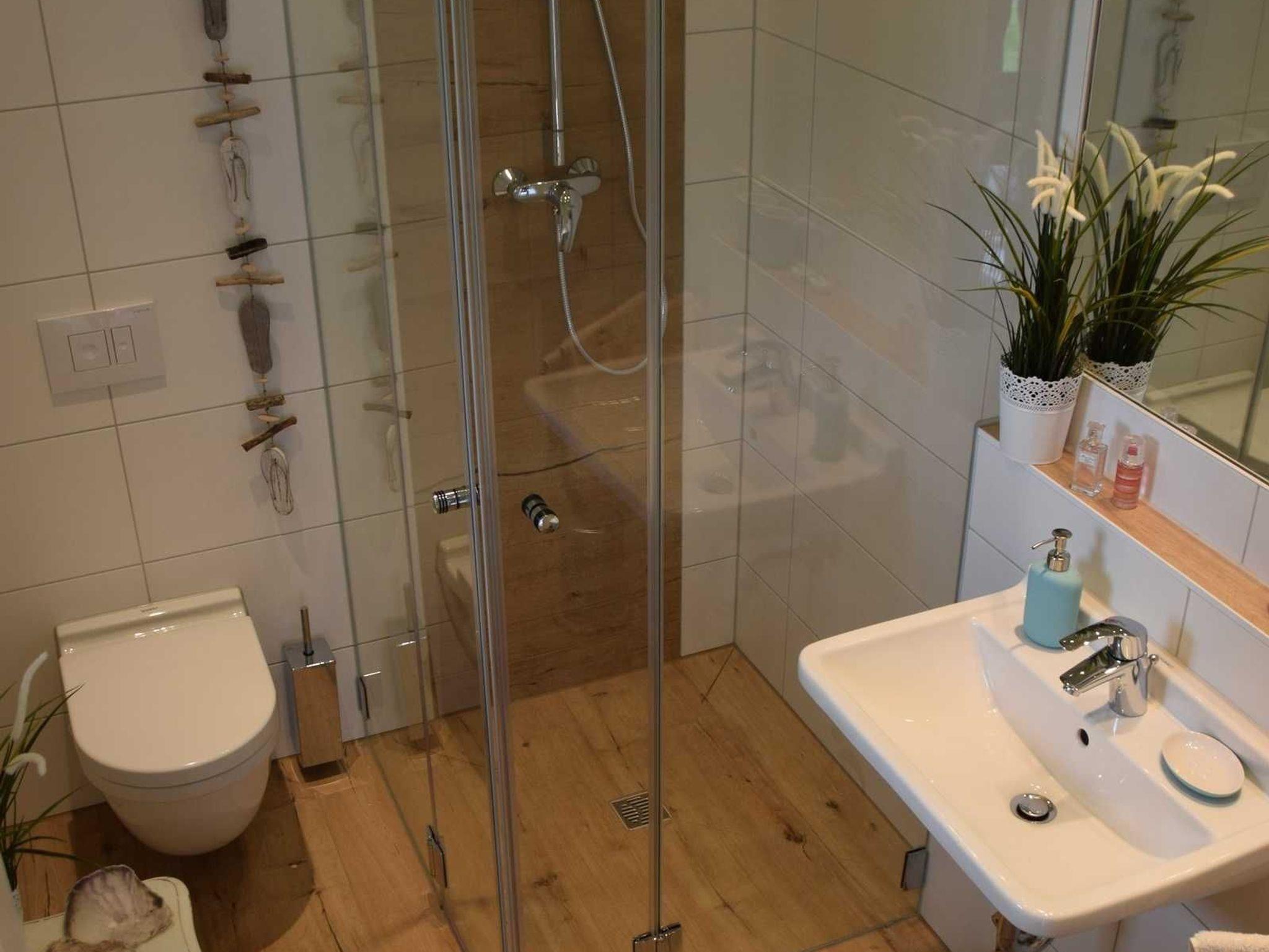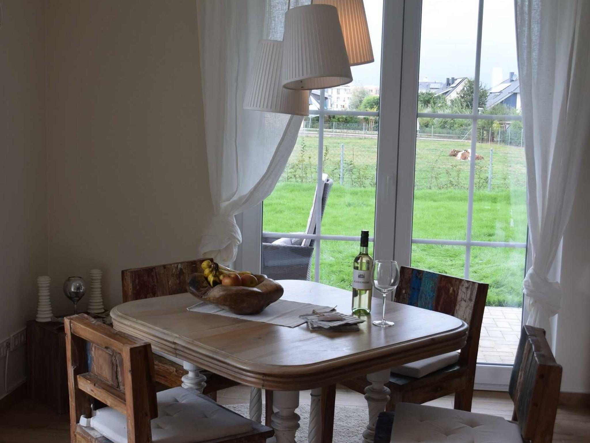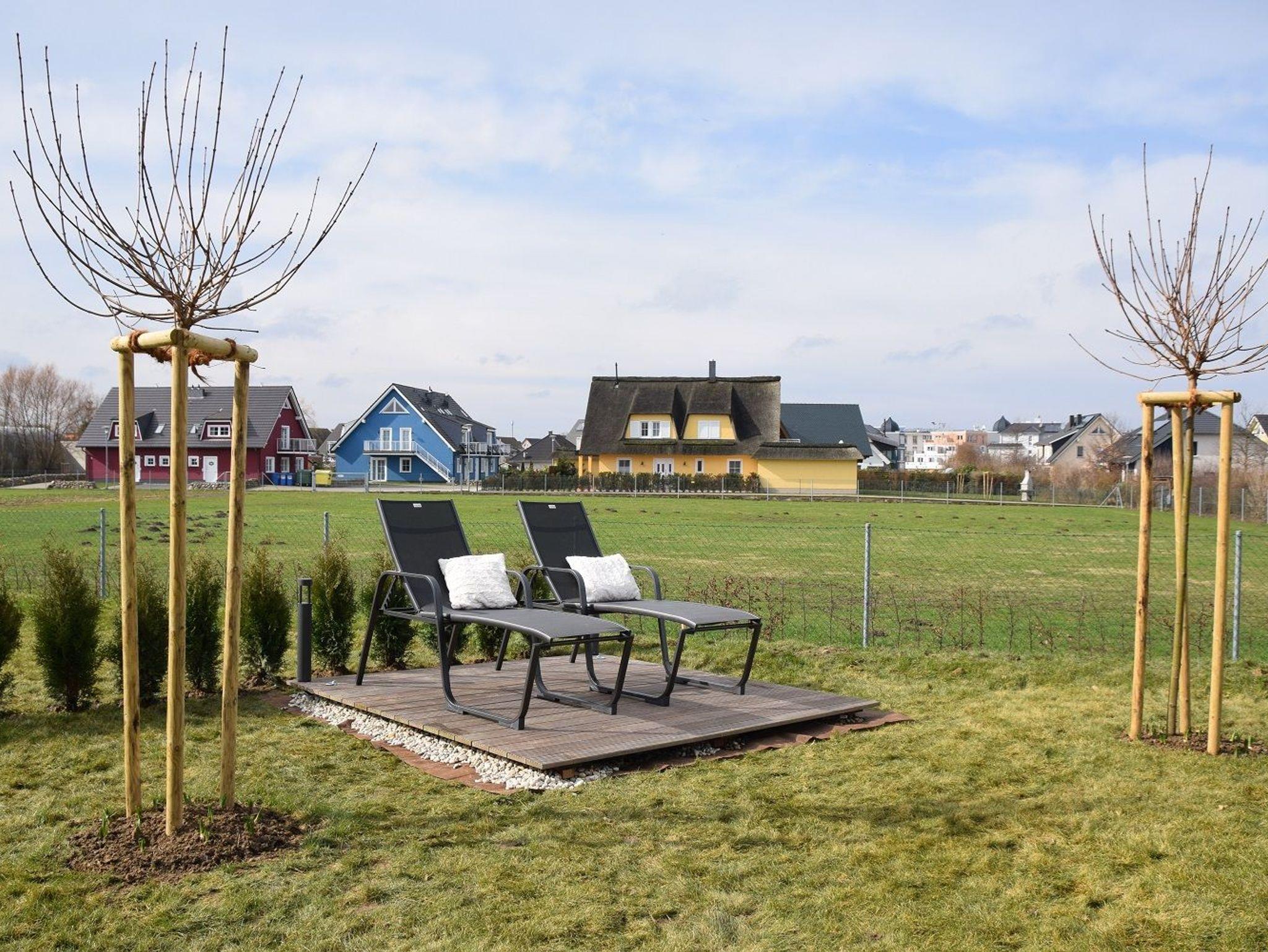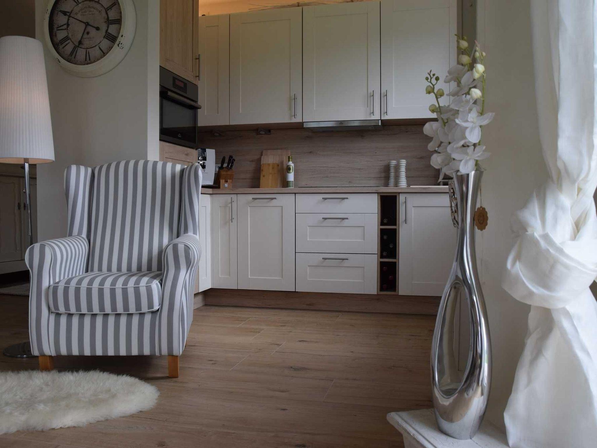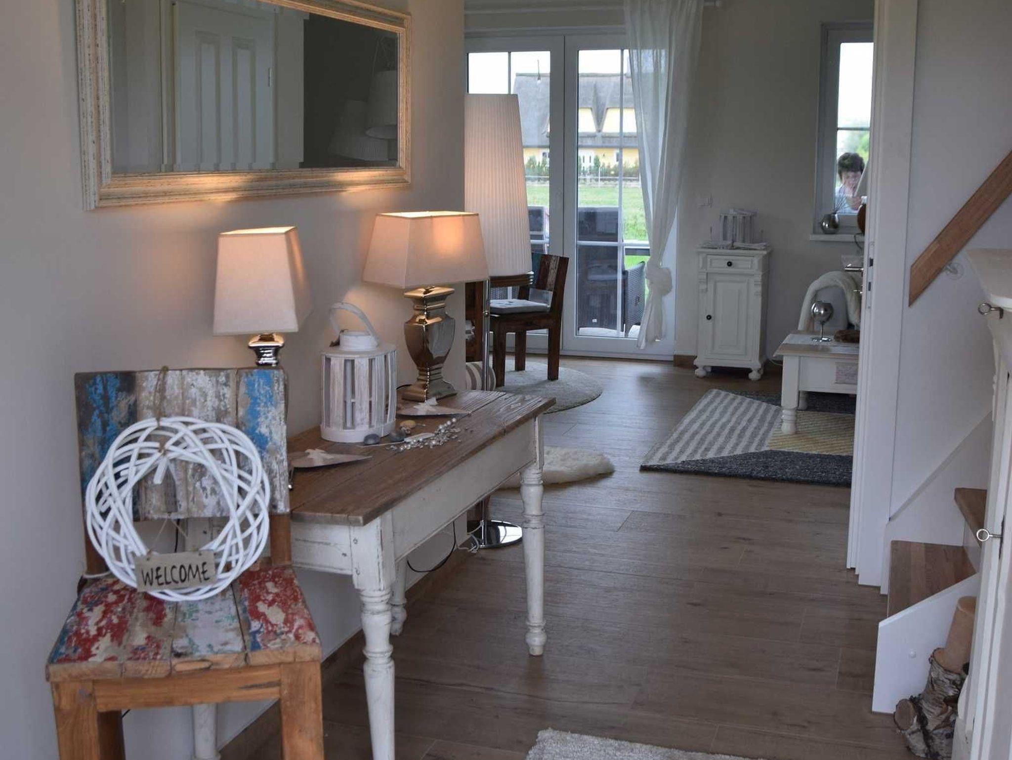 Schon im Eingangsbereich spüren Sie die Gemütlichkeit und die geschmackvolle Dekoration und Einrichtung. Lassen Sie sich inspirieren von der geschmackvollen Einrichtung und fühlen Sie sich schon gleich nach der Ankunft Zuhause. Dafür sorgt ein großzügiger Wohnbereich mit einer modernen Wohnküche, eine Essecke im Shabby Chic-Stil, zwei schön eingerichtete Schlafzimmer sowie zwei schöne Bäder und für unsere kleinen Seeräuber eine kuschelige Piratenhöhle im Spitzboden. Sie erwartet ein großzügiger Wohnbereich mit einer modernen Einbauküche aus Eiche und Fronten im Landhausstil in creme weiß. Die modernen Einbaugeräte wie Glaskeramik-Kochfeld, Flachschirmhaube, Kühlschrank mit Gefrierfach, Einbauspüle aus Ceramik in Magnolia, Geschirrspüler und der Mikrowellen-Kompaktbackofen lassen keine Wünsche offen. Eingerichtet mit Geschirr welches den gedeckten Tisch einfach schön aussehen lässt. Die Weinregale für einen leckeren Rot-oder Weißwein runden das Küchenkonzept ab. Der Essbereich lässt Sie es spüren an der Ostsee zu sein. Stühle im maritimen Strandlook und ein antiker Tisch laden zu einem schönen Abendessen oder einem gemütlichen Spieleabend im Kreise Ihrer Liebsten ein. Der Stubenbereich mit Kuscheldecken und -kissen bietet Platz für die ganze Familie. Die Fußbodenheizung gibt die behagliche Wärme. Ein paar Kerzen und der Abend kann kommen. Für einen gemütlichen Fernseh- oder Musikabend sorgt der LED Fernseher mit Blue-Ray Player oder das Radio mit CD. Vom Wohnbereich hat man einen schönen Blick in den Garten und die daran angrenzende unverbaute Grünfläche. Die Terrasse mit Strandkorb, gemütlicher Sitzecke, Elektrogrill und Sonnenschutz lässt auch im Sommer keine Wünsche offen.
