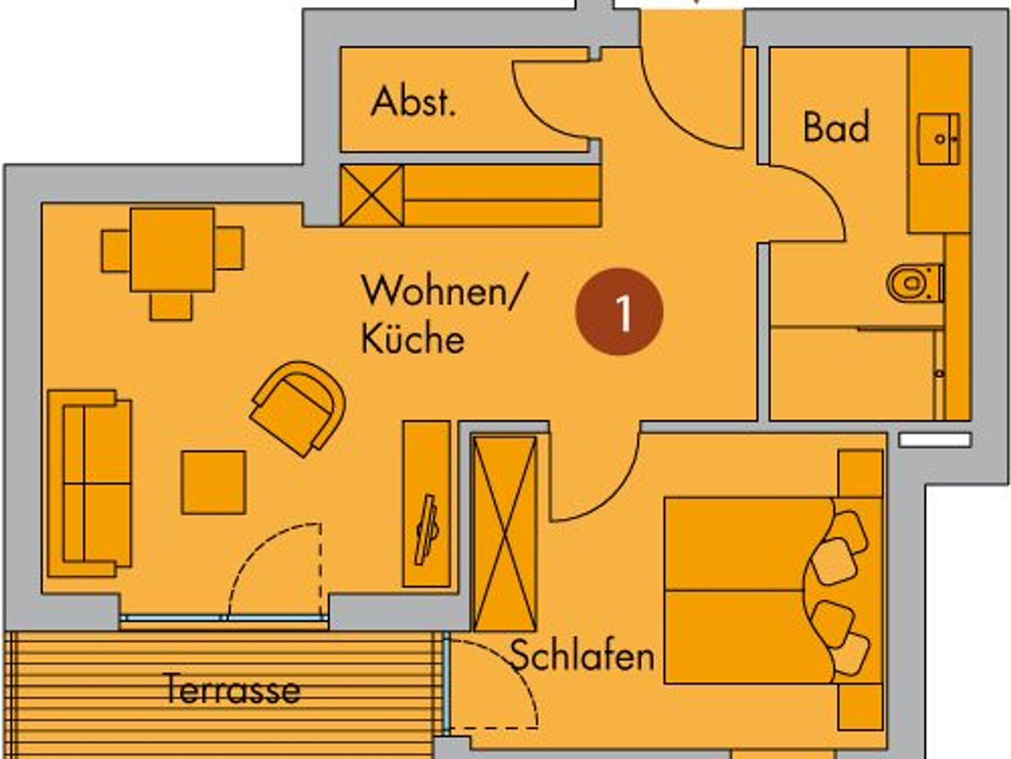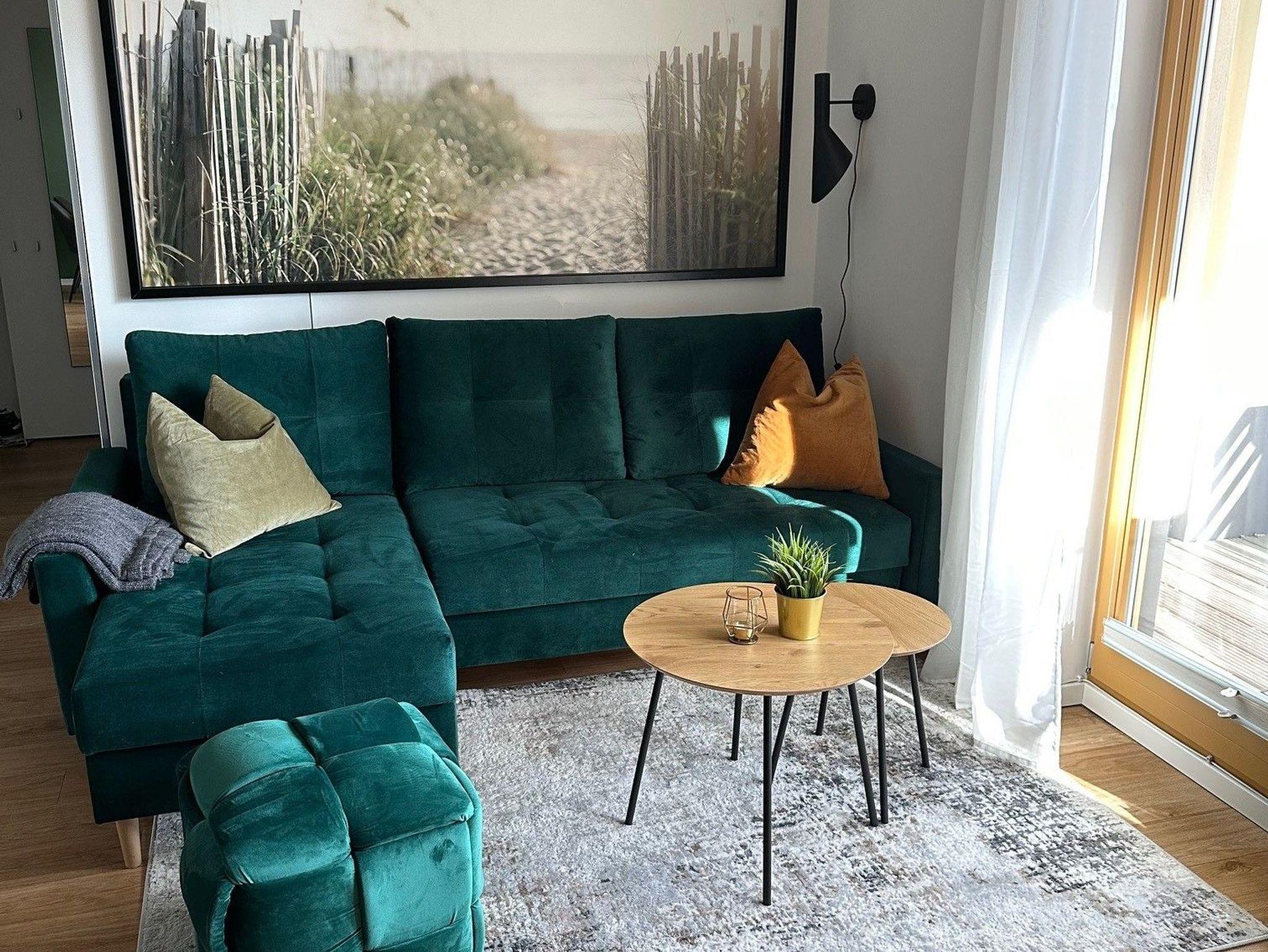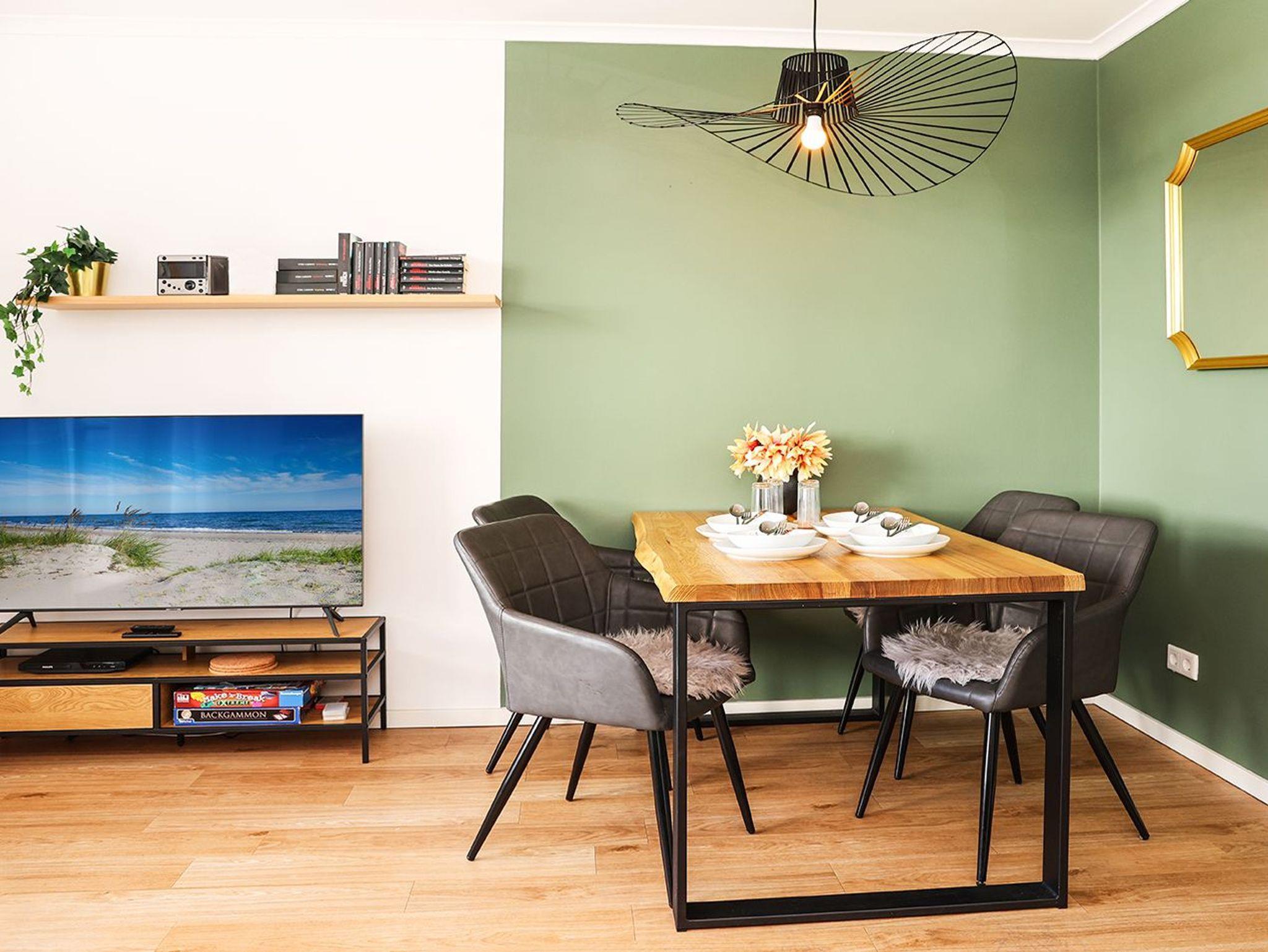Das Herzstück des gemütlichen Wohn- und Essbereichs ist die einladende Eckcouch. Sie bietet ausgezogen Schlafmöglichkeiten für maximal zwei Erwachsene (140 cm Breite). Zur Ausstattung gehört zudem ein großer Smart-TV. Am schönen Echtholztisch mit vier Armlehnstühlen können Sie in Ruhe Ihre Mahlzeiten genießen oder eine entspannte Zeit mit der Familie bei fröhlichen Gesprächen und Spieleabenden verbringen. Auf dem herrlichen Balkon in Ost-Ausrichtung befindet sich ein weiterer Essbereich für vier Personen.