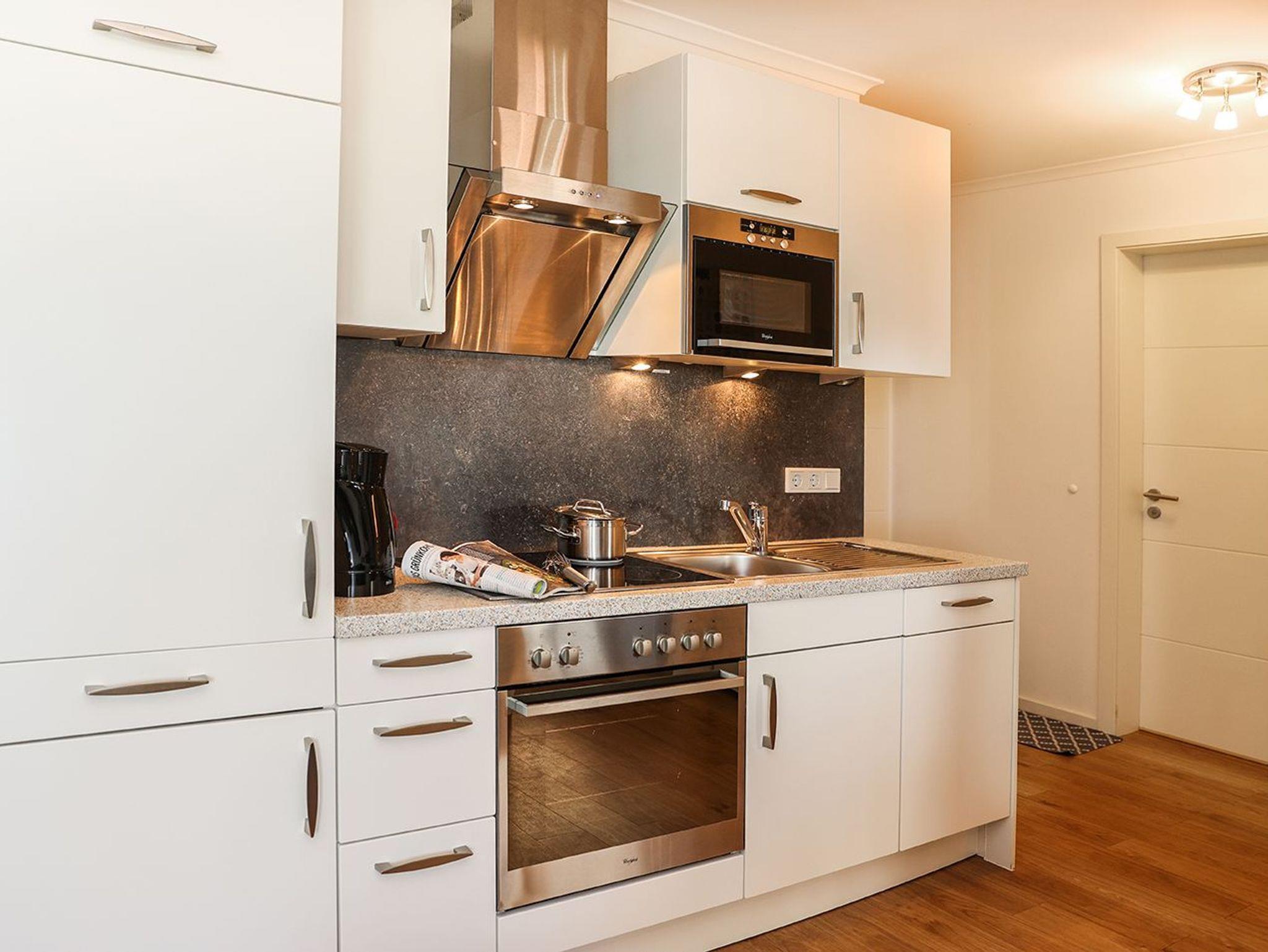 Die moderne offene Küche hat einen Geschirrspüler, einen Backofen, eine Mikrowelle, einen Kühlschrank mit Gefrierfach und ist darüber hinaus mit allem ausgerüstet, was Sie für Ihren Aufenthalt benötigen.