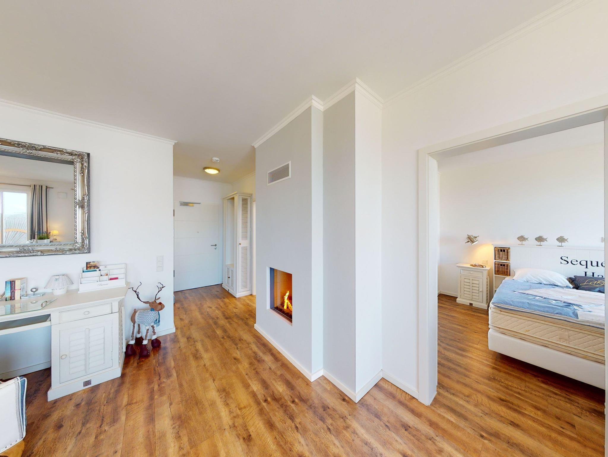 Der elegante Stil, sowie die luxuriöse Einrichtung und Ausstattung spiegelt sich auch im Schlafzimmern wieder. Von hier können Sie den Blick zum Wasser genießen und haben direkten Zugang zur großen Dachterrasse.