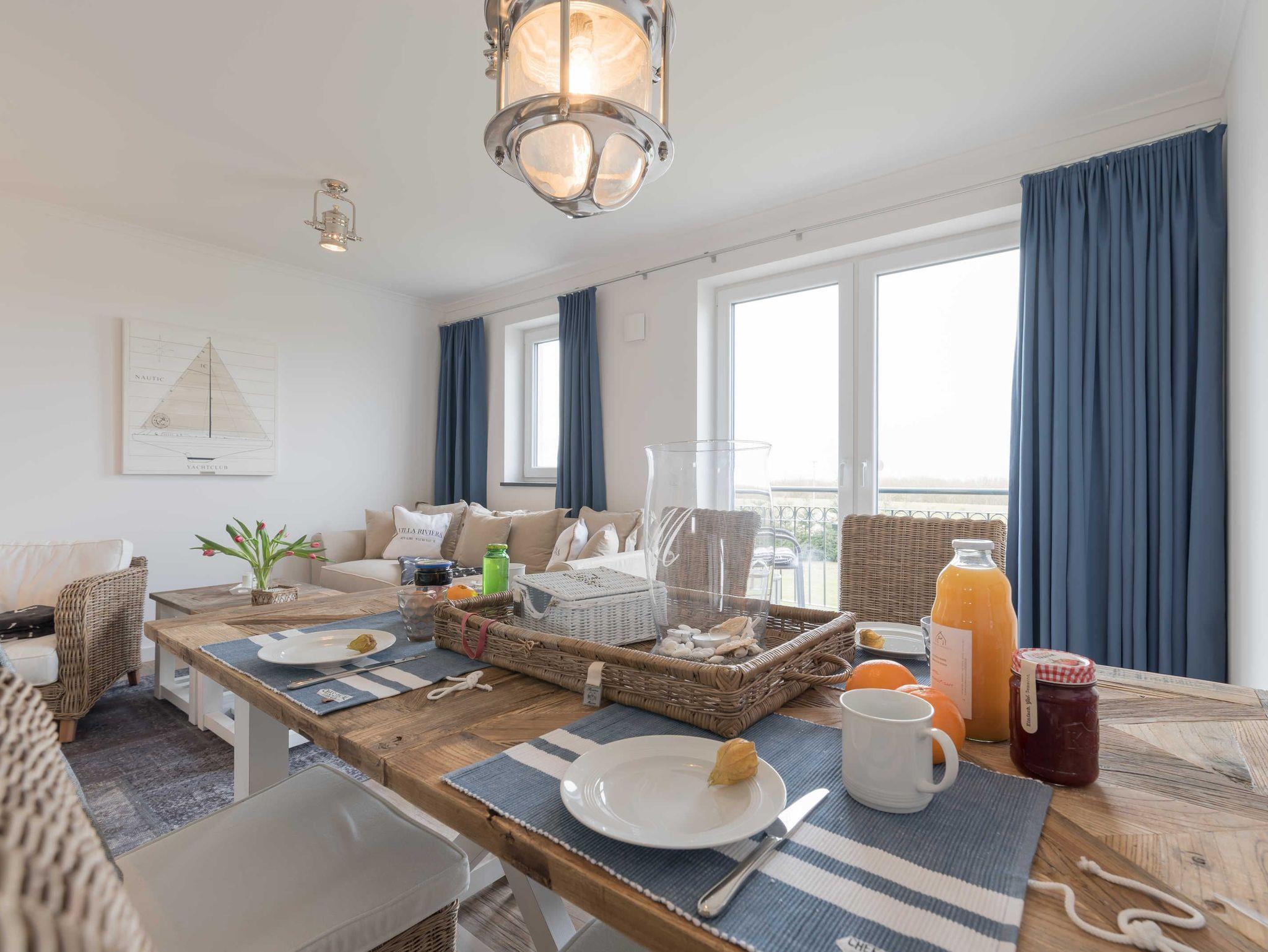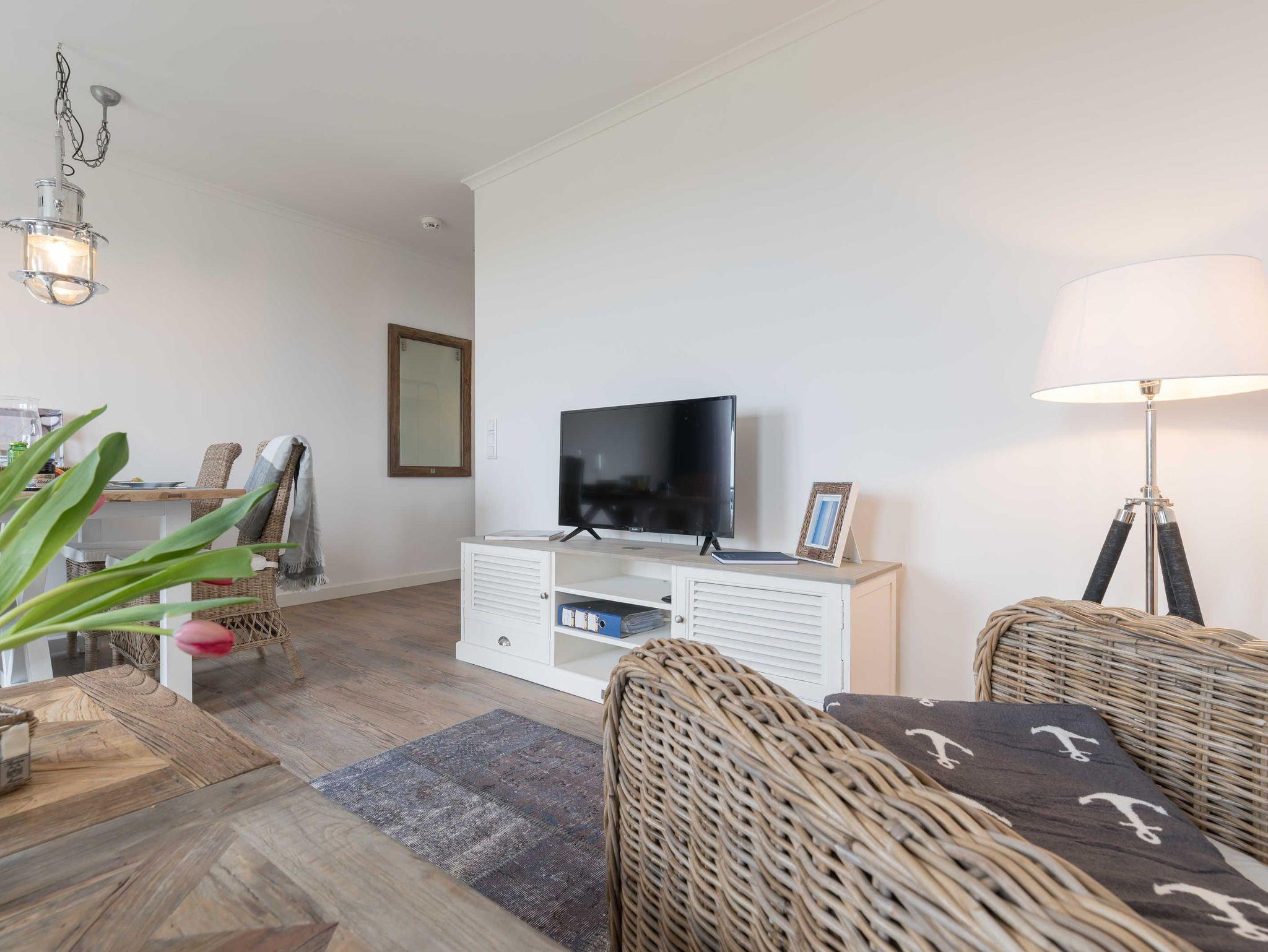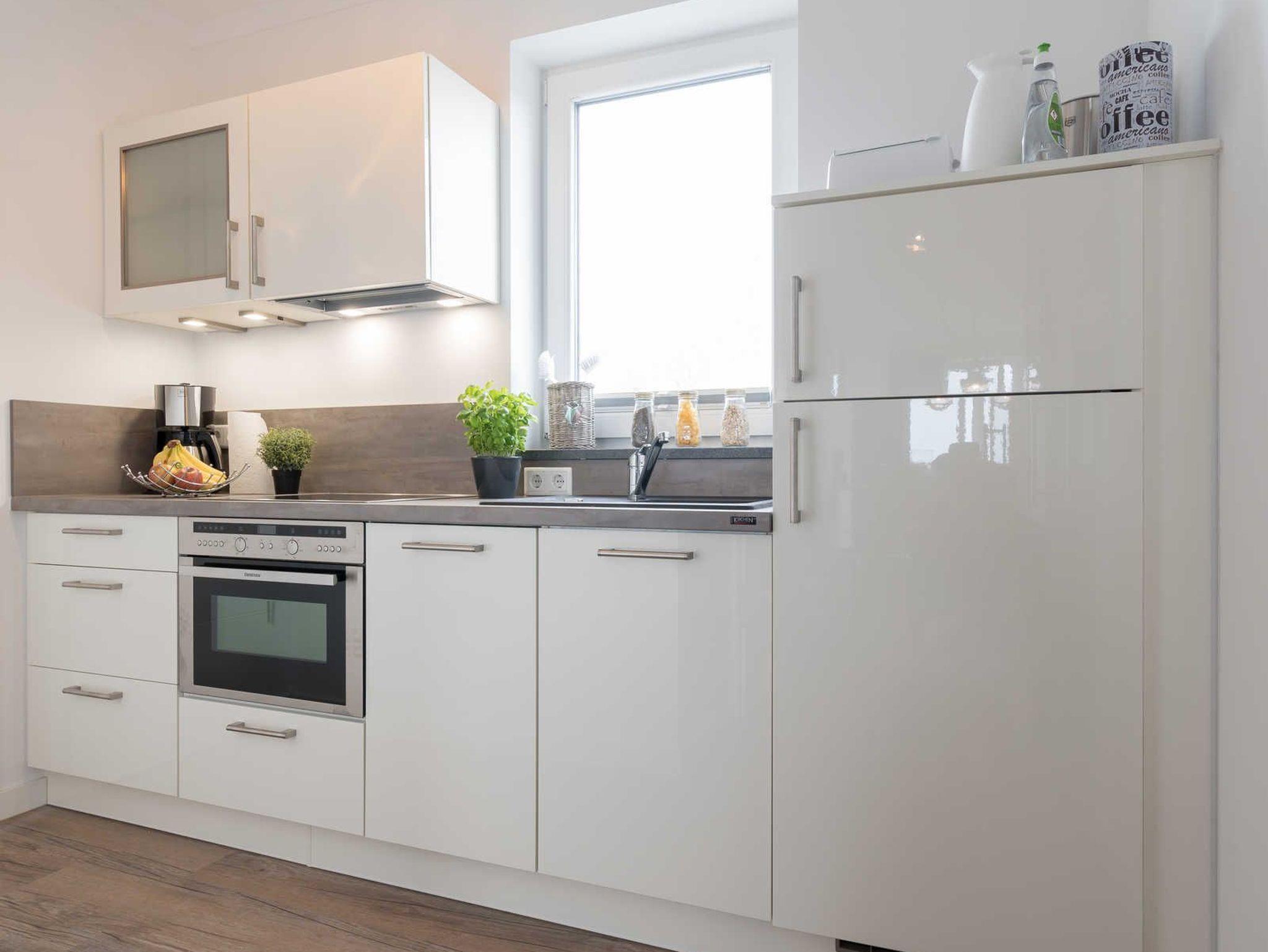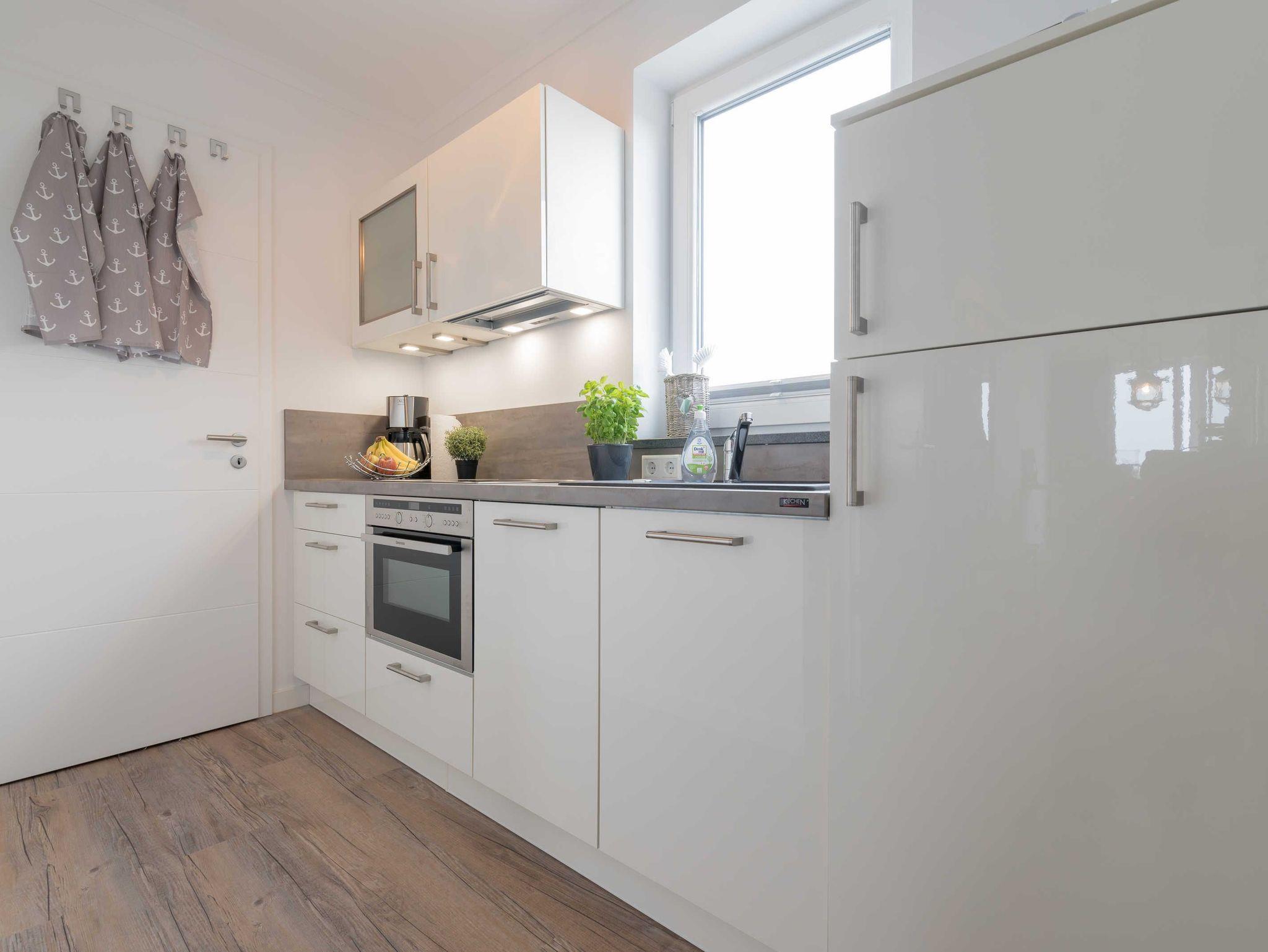 Im hell eingerichteten Wohnzimmer laden eine gemütliche Couch sowie ein großer Esstisch zum Verweilen ein. Die bodentiefen Fensterelemente sorgen für lichtdurchfluteten Wohngenuss und bieten Zugang zum Balkon. Die Fußbodenheizung und die einstellbare Lüftung sorgen in allen Jahreszeiten für ein angenehmes Raumklima und Gemütlichkeit. Flatscreen-TV´s mit Radio Programm im Wohn- und Schlafzimmer gehören zur modernen Ausstattung dieser Ferienwohnung. Die Einbauküche verfügt über einen Geschirrspüler, einen Kühlschrank mit Gefrierfach, einen Backofen mit integrierter Mikrowelle, ein Cerankochfeld, einen Toaster, eine Kaffeemaschine, einen Wasserkocher und vom Kochtopf bis zum Eierbecher über eine komplette Küchenausstattung. Das Badezimmer mit Fenster und ebenerdiger Dusche verfügt über einen Waschtisch mit großem Spiegel, Abstellmöglichkeiten für Ihre Waschutensilien und einen Haartrockner. In dem in der Wohnung befindlichen Abstellraum finden Sie ein Wäschegestell, einen Staubsauger und haben Platz zur Lagerung.
