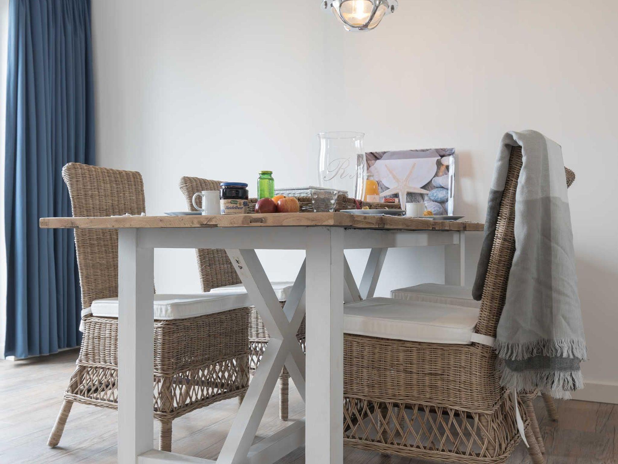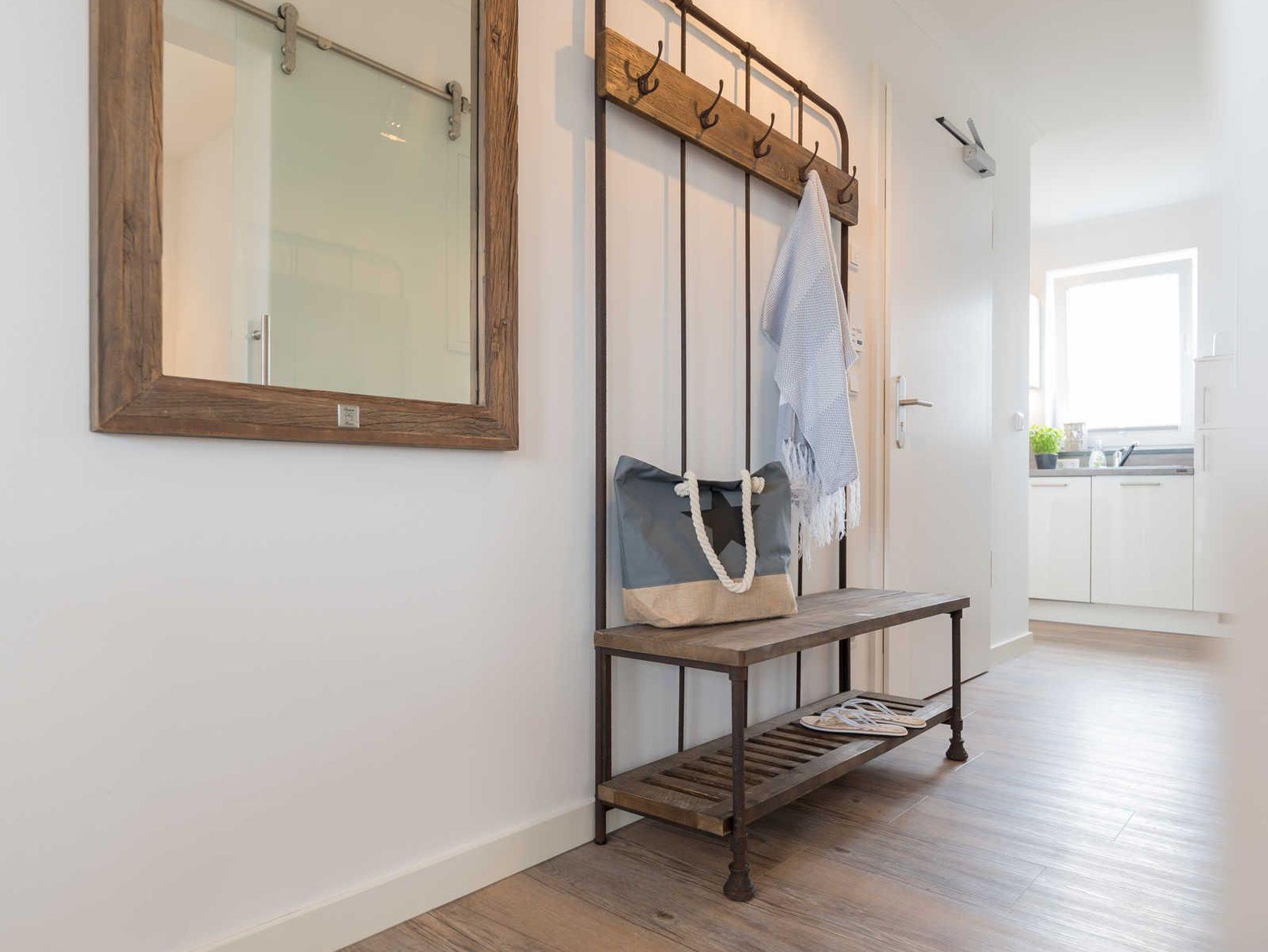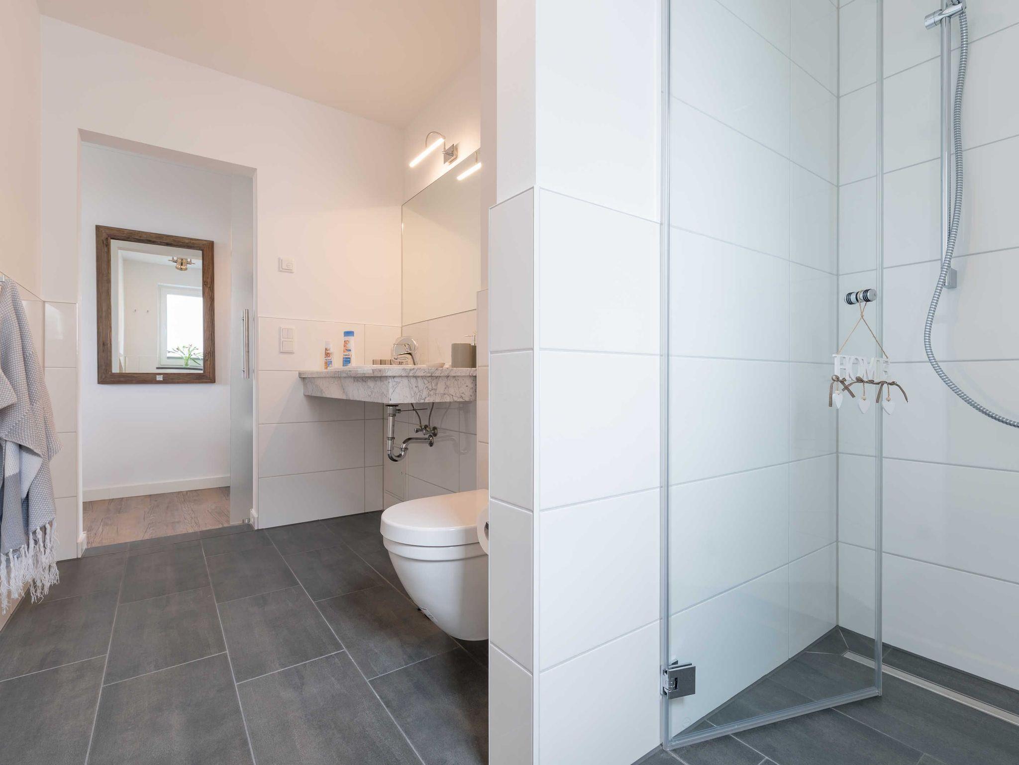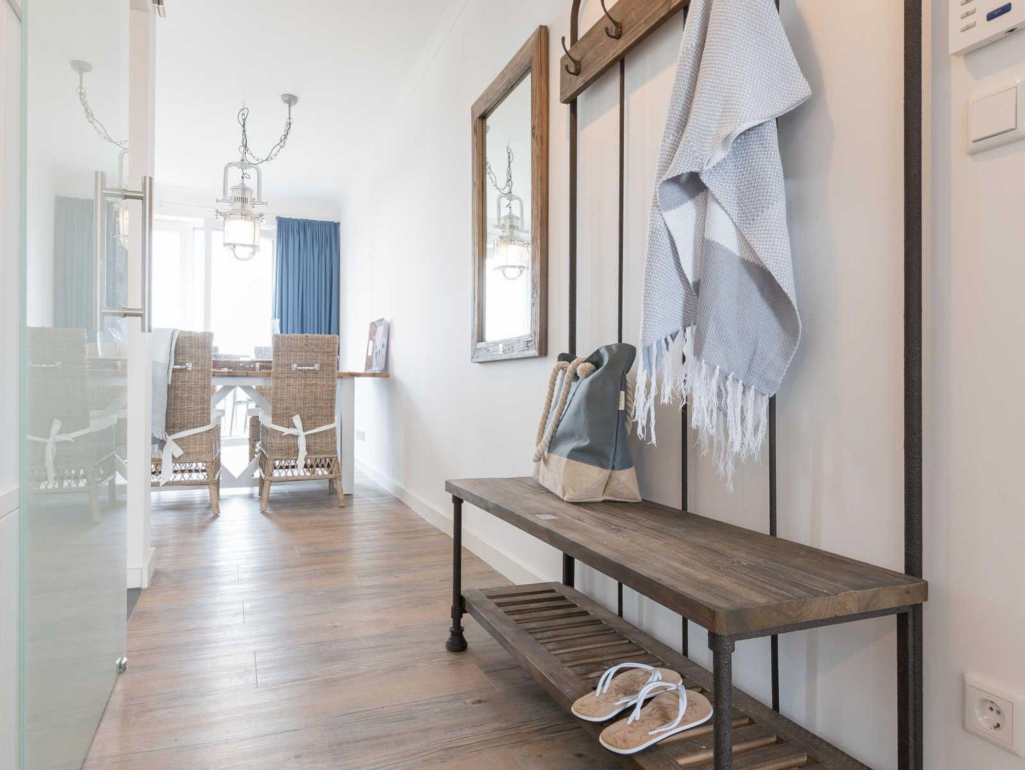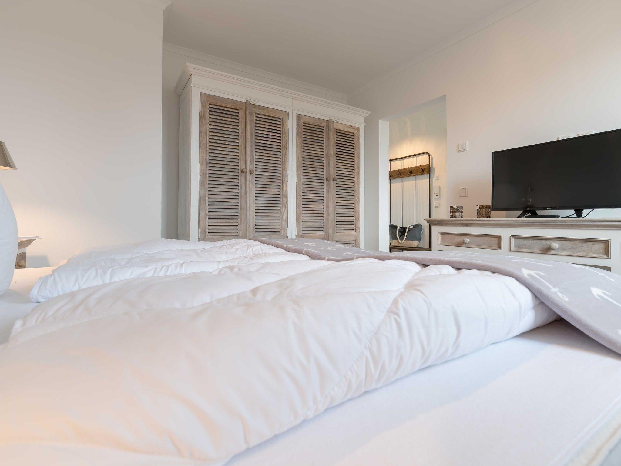 Im hell eingerichteten Wohnzimmer laden eine gemütliche Couch sowie ein großer Esstisch zum Verweilen ein. Die bodentiefen Fensterelemente sorgen für lichtdurchfluteten Wohngenuss und bieten Zugang zum Balkon. Die Fußbodenheizung und die einstellbare Lüftung sorgen in allen Jahreszeiten für ein angenehmes Raumklima und Gemütlichkeit. Flatscreen-TV´s mit Radio Programm im Wohn- und Schlafzimmer gehören zur modernen Ausstattung dieser Ferienwohnung. Die Einbauküche verfügt über einen Geschirrspüler, einen Kühlschrank mit Gefrierfach, einen Backofen mit integrierter Mikrowelle, ein Cerankochfeld, einen Toaster, eine Kaffeemaschine, einen Wasserkocher und vom Kochtopf bis zum Eierbecher über eine komplette Küchenausstattung. Das Badezimmer mit Fenster und ebenerdiger Dusche verfügt über einen Waschtisch mit großem Spiegel, Abstellmöglichkeiten für Ihre Waschutensilien und einen Haartrockner. In dem in der Wohnung befindlichen Abstellraum finden Sie ein Wäschegestell, einen Staubsauger und haben Platz zur Lagerung.