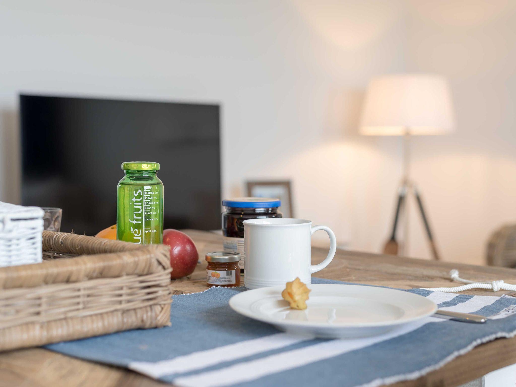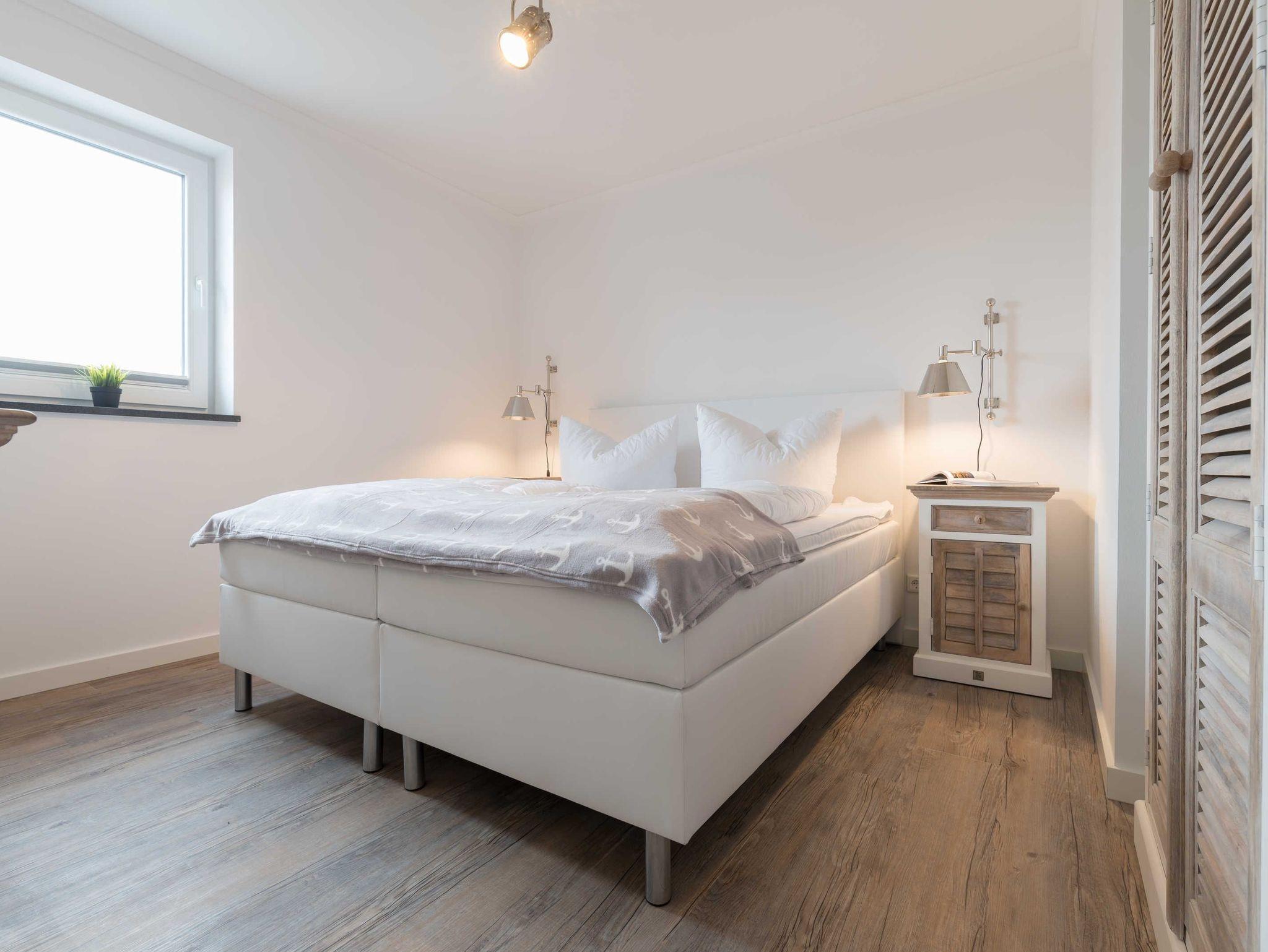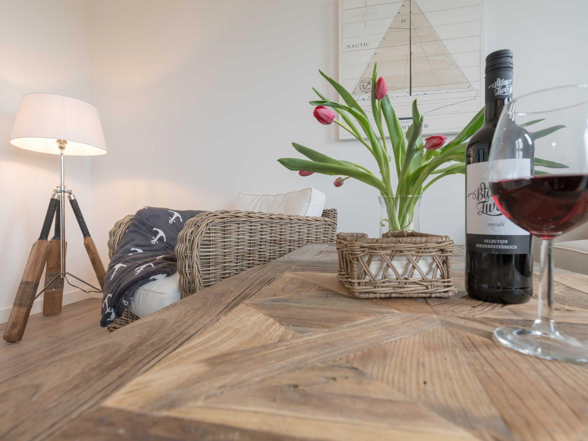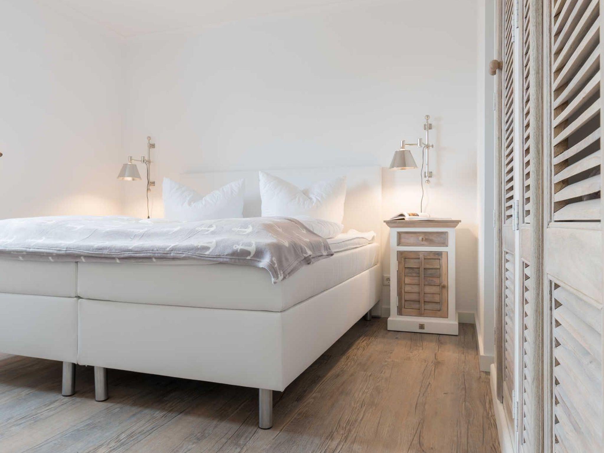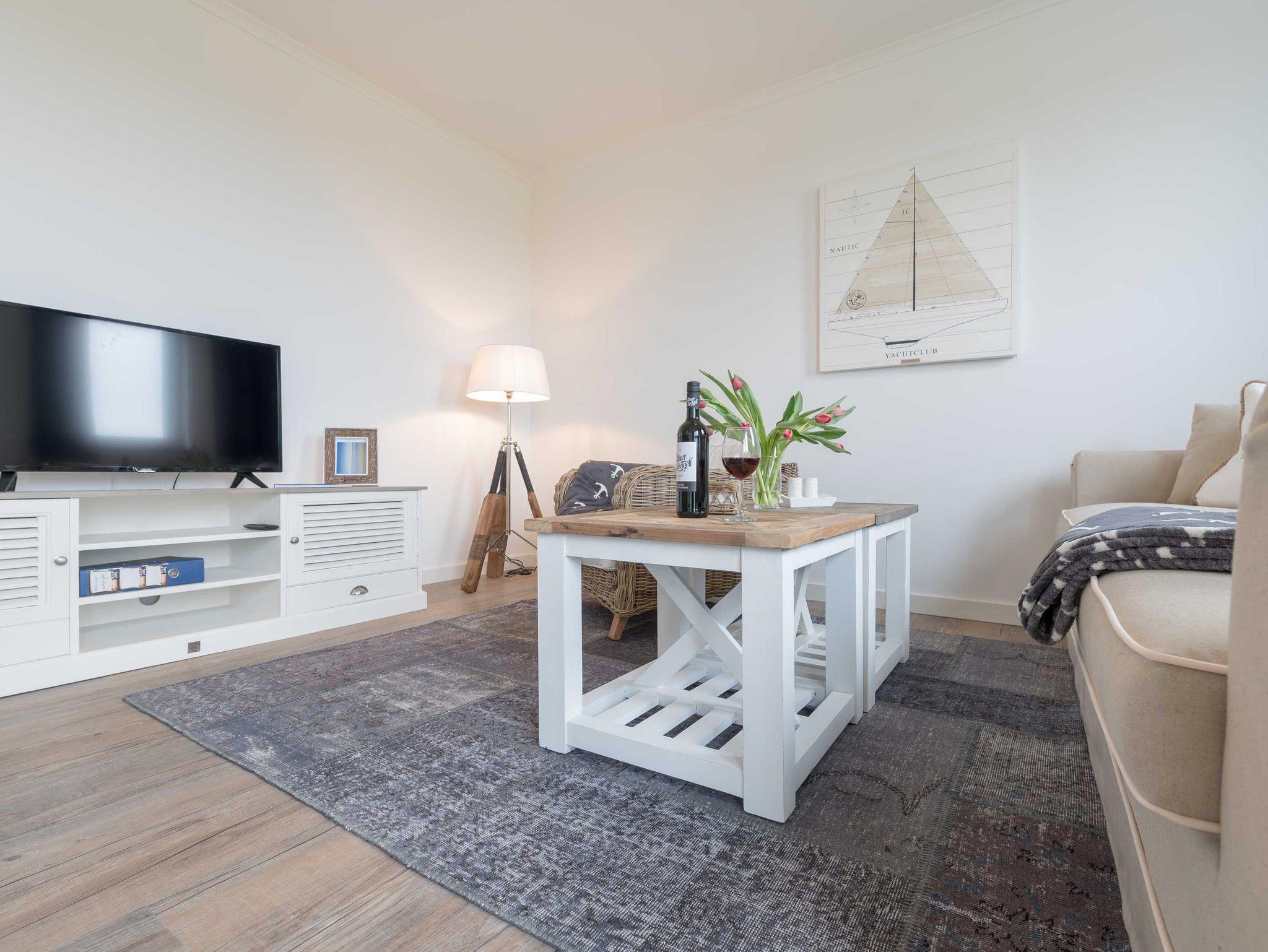 Die im maritimen Stil eingerichtete 2-Zimmer Wohnung besteht aus einem großzügigen Schlafzimmer mit Doppelbett 1,80x2,00 m (durchgehende Matratze), einem schönen Wohnzimmer, einer offenen Einbauküche, einem Bad mit ebenerdiger Dusche sowie einem Abstellraum. Ein kostenfreien PKW-Stellplatz befindet sich direkt am Haus. Fahrradständer stehen an einem der Nachbarhäuser (der Villa Alizé) zu Ihrer Verfügung.