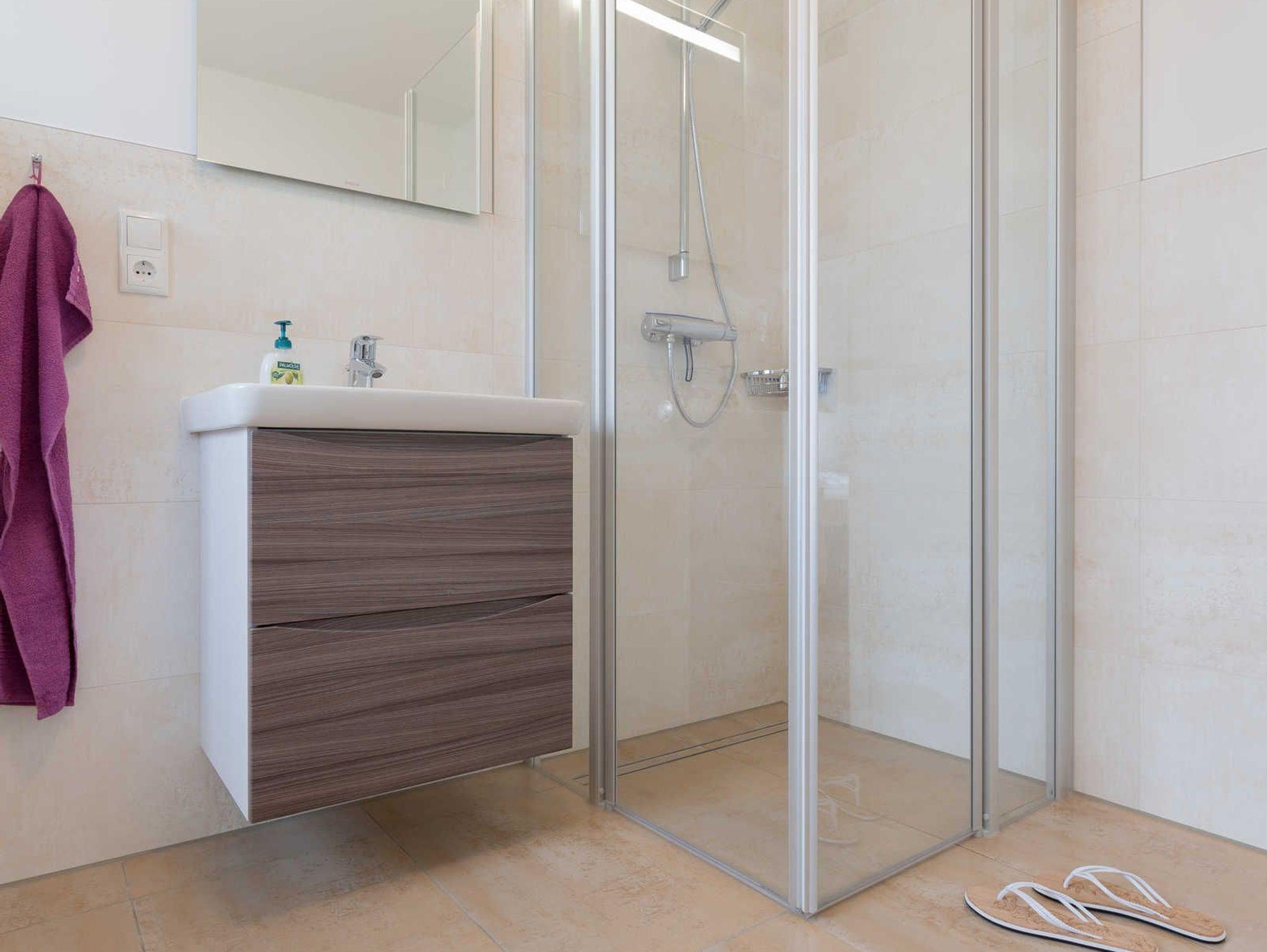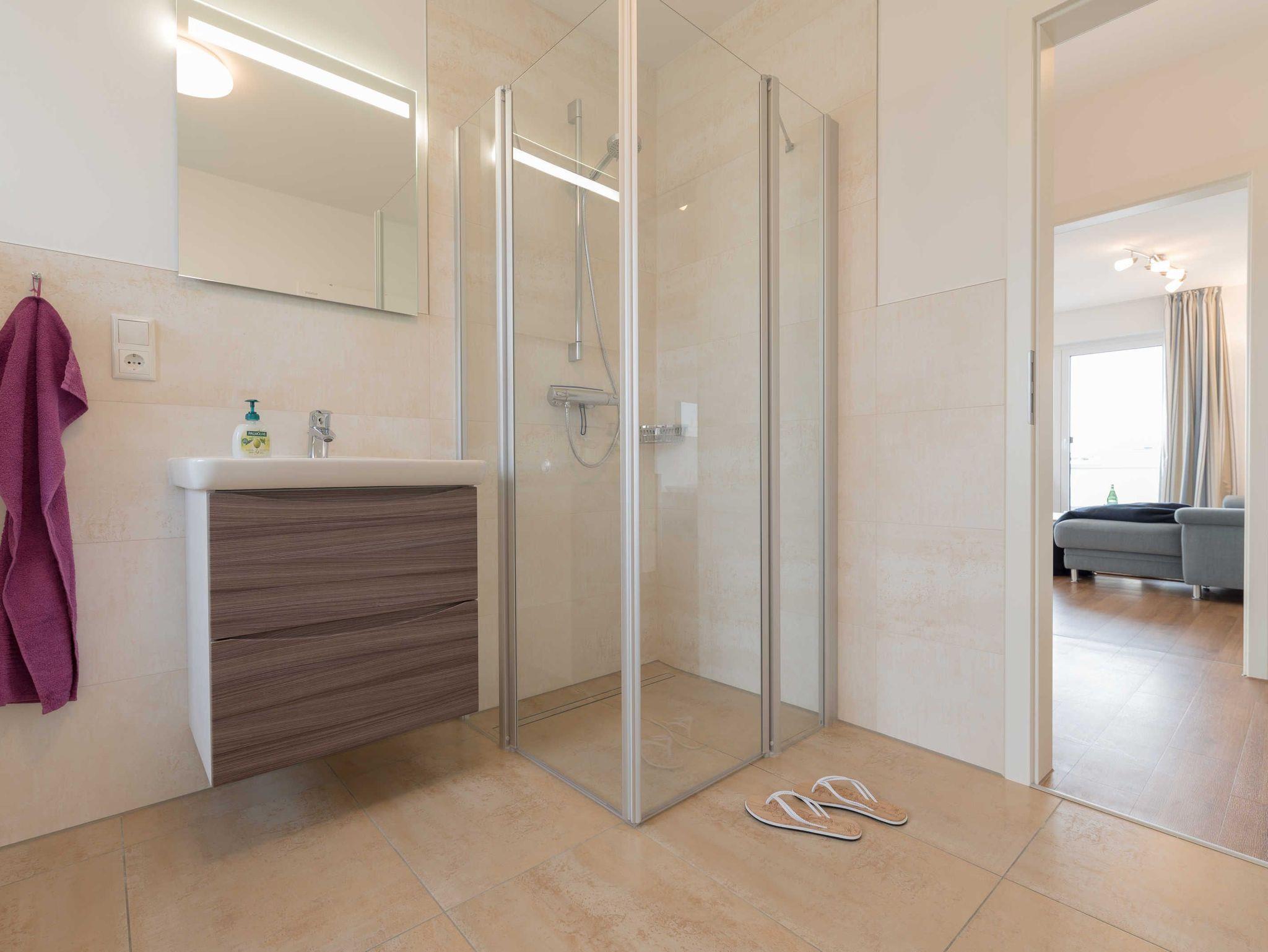 Das ca. 8 qm messende Bad ist mit einer geräumigen Dusche, einer Waschmaschine sowie einem Waschtisch mit Spiegel und Fön ausgestattet.