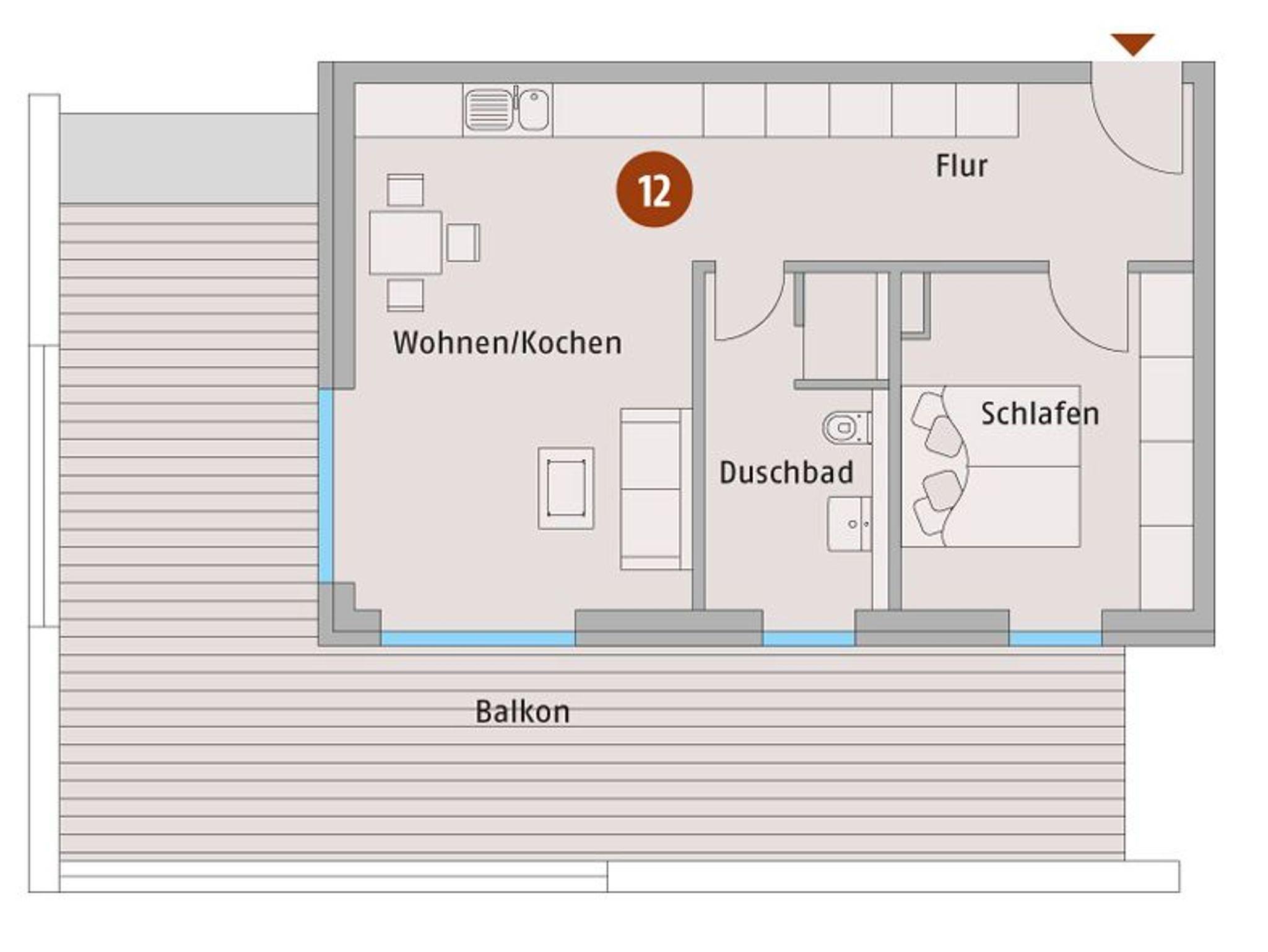 Strandnahe Zwei-Raumwohnung für max. zwei Erwachsene und zwei Kinder (bis 14 Jahre) mit großem Balkon im 1.OG.