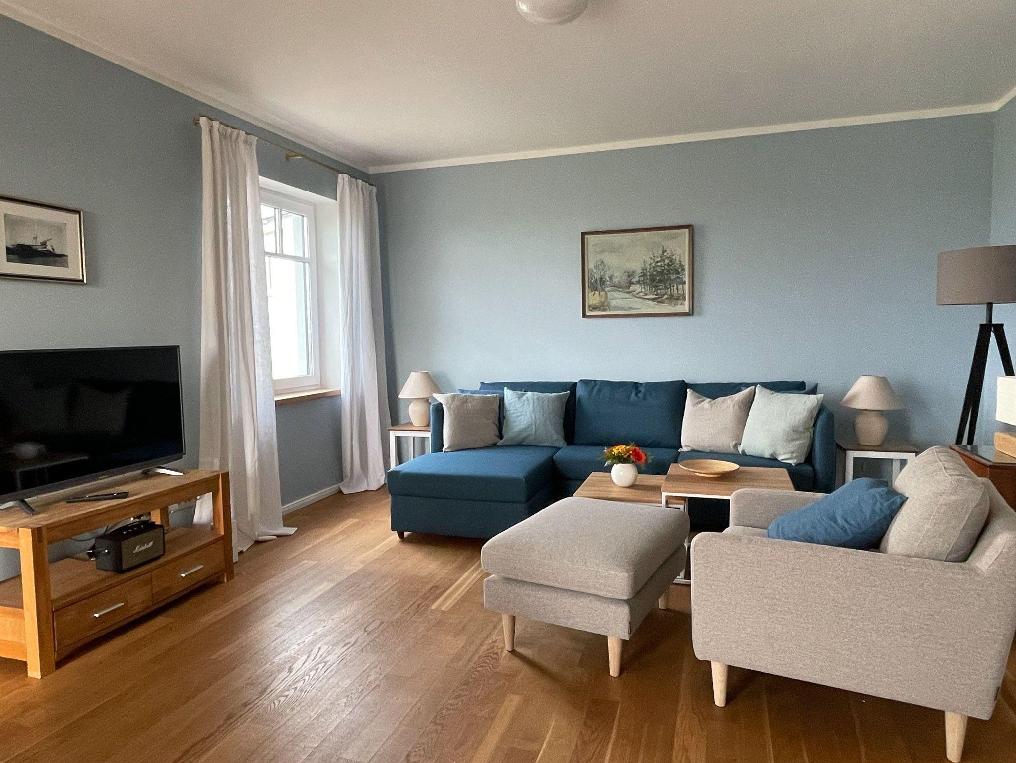 Die Zwei-Zimmer-Wohnung wurde 2020 umfassend und mit viel Liebe zum Detail überarbeitet und präsentiert einen weitläufigen Blick in Richtung Ostsee.