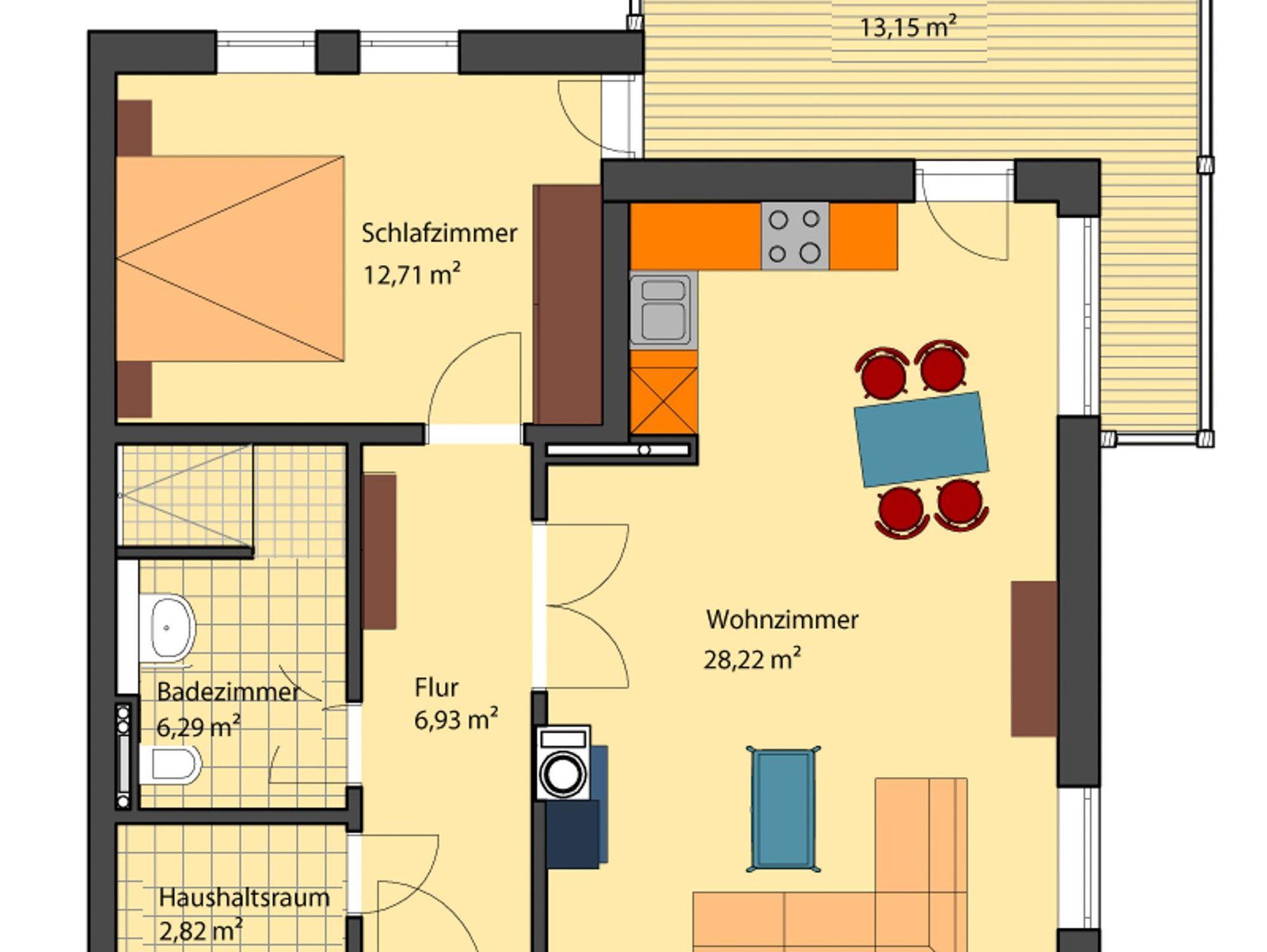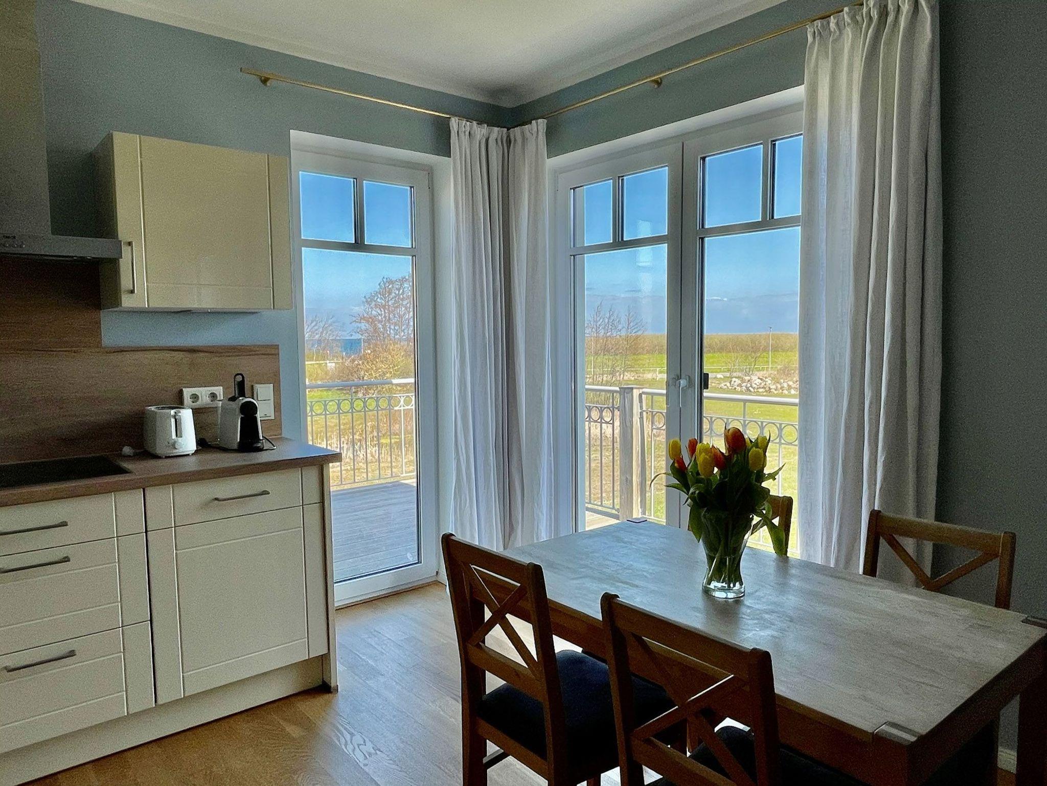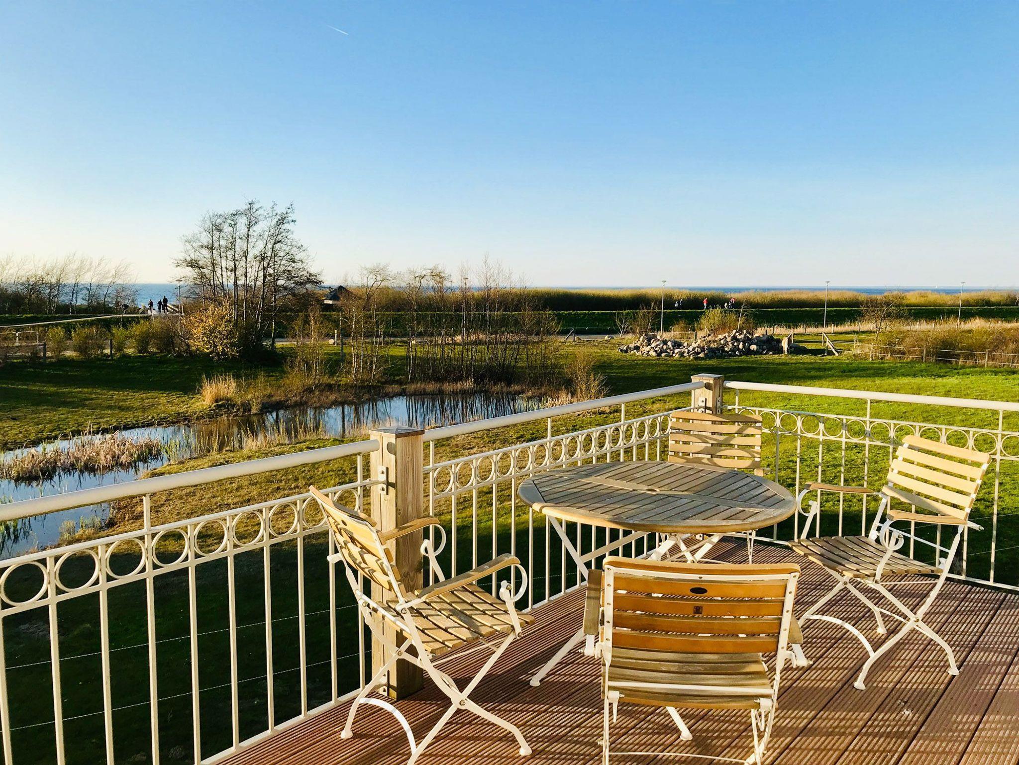 Sowohl von der 13 qm großen Terrasse als auch aus Wohnzimmer, Küche und Schlafzimmer genießen Sie einen herrlichen Ausblick auf die Ostsee. Die Terrasse erreichen Sie bequem direkt vom Schlafzimmer und vom Wohnzimmer. Einem gemütlichen gemeinsamen Frühstück an frischer Küstenluft steht nicht entgegen.